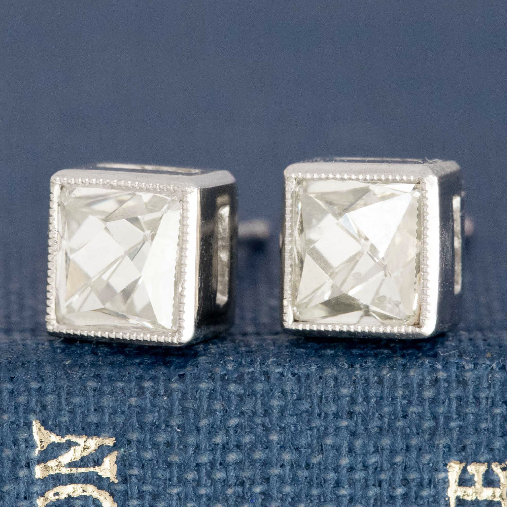 Juicy French cut diamond stud earrings in crisp platinum, dotted with delicate milgrain along the edges making for an excellent stud earring option. These stones, already quite bright and spready, look even bigger in these settings and make for a great departure from the classic round shape. French cuts themselves are super charming and unique, plus who can resist those facets?