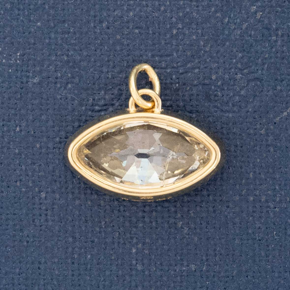 This antique marquise cut diamond, despite the lower clarity, has such great spread and sparkle. We thought she'd make an excellent pendant, with an East/West orientation to give you even greater presence along the neck. She's got NSEW claw prongs and a delicate gold bezel, allowing for tons of light play and security.