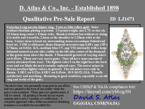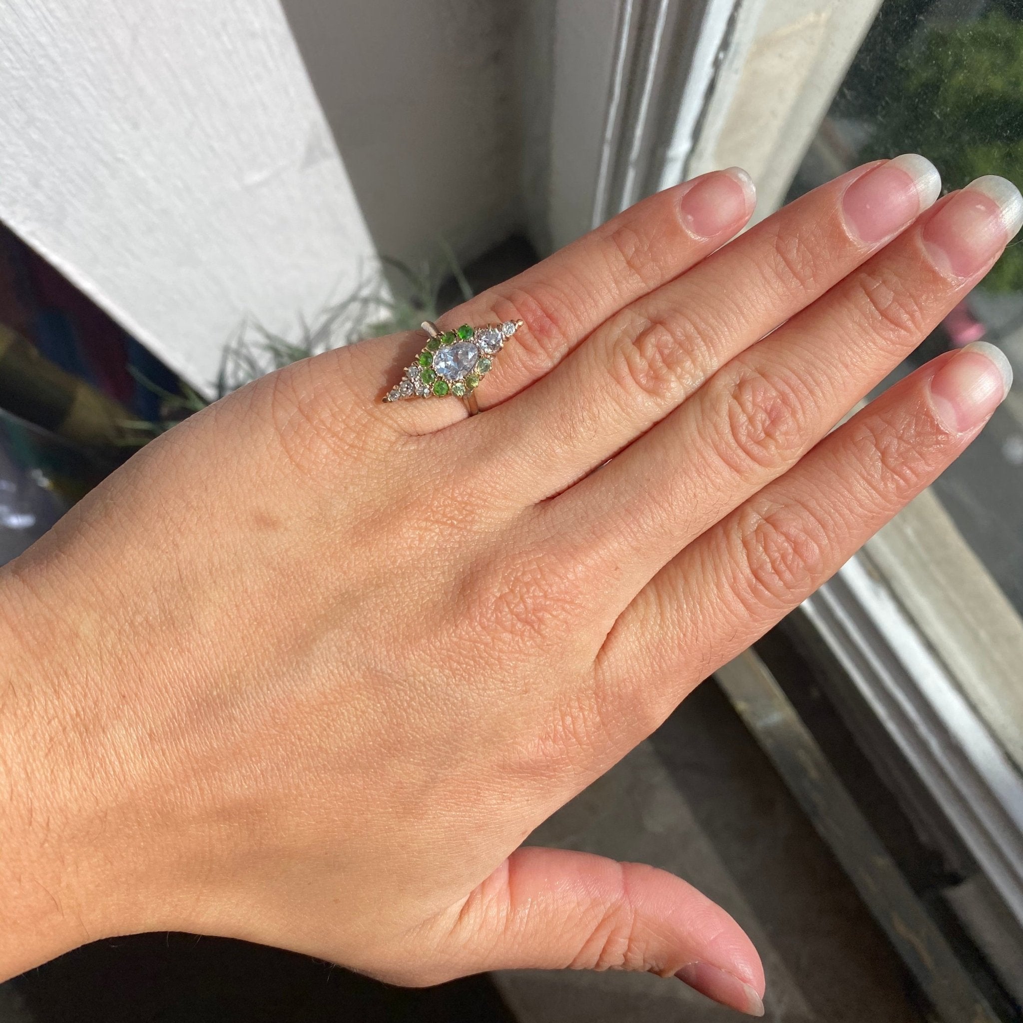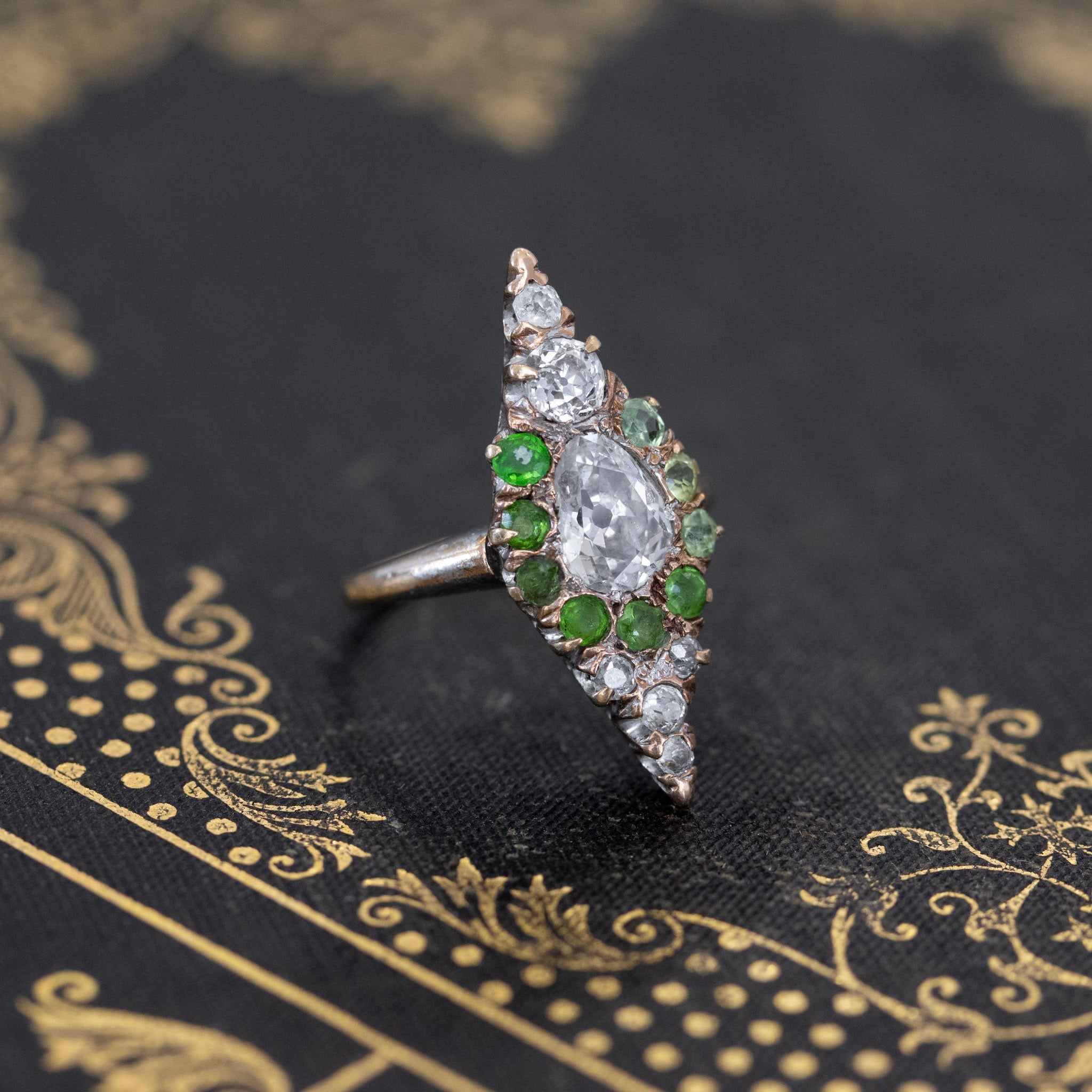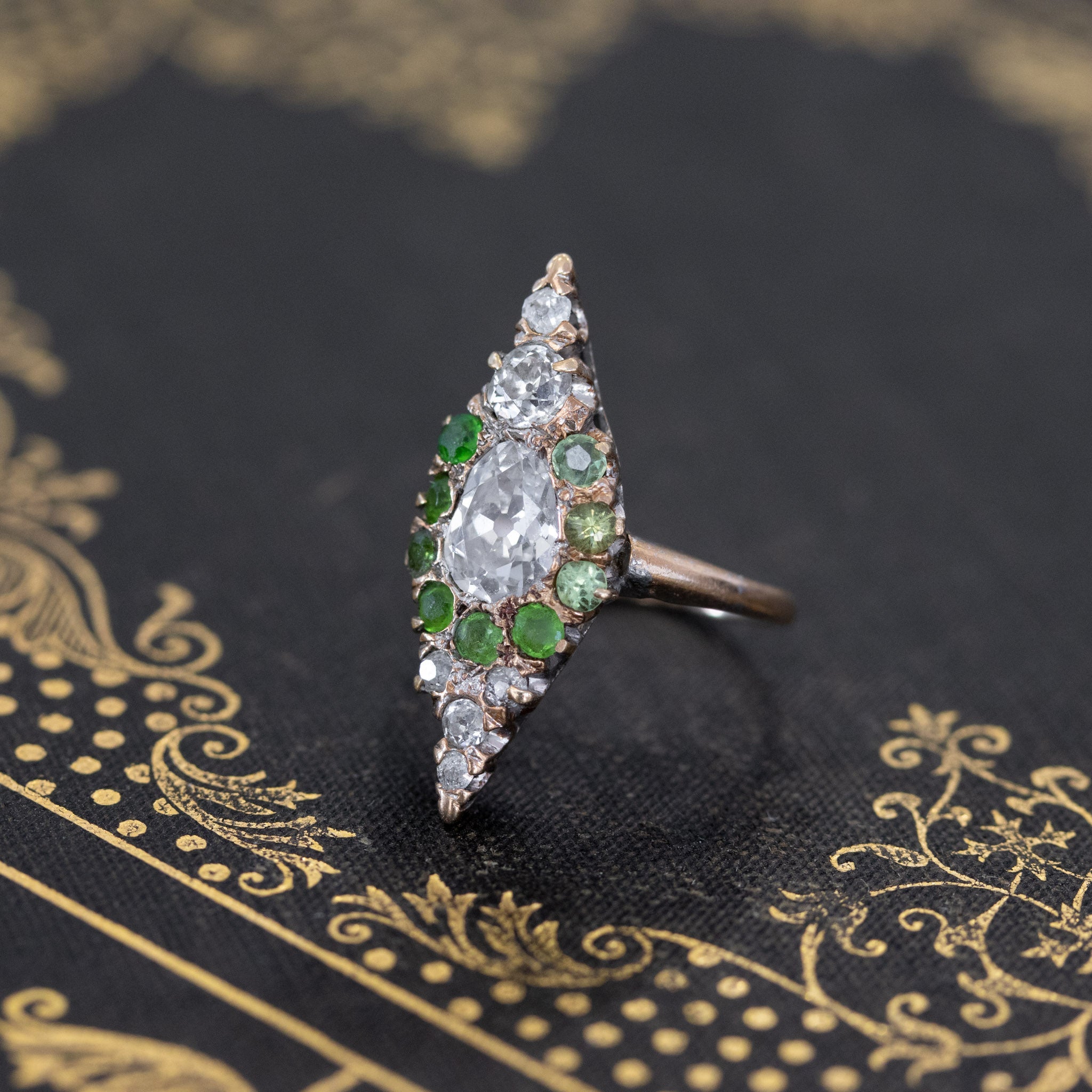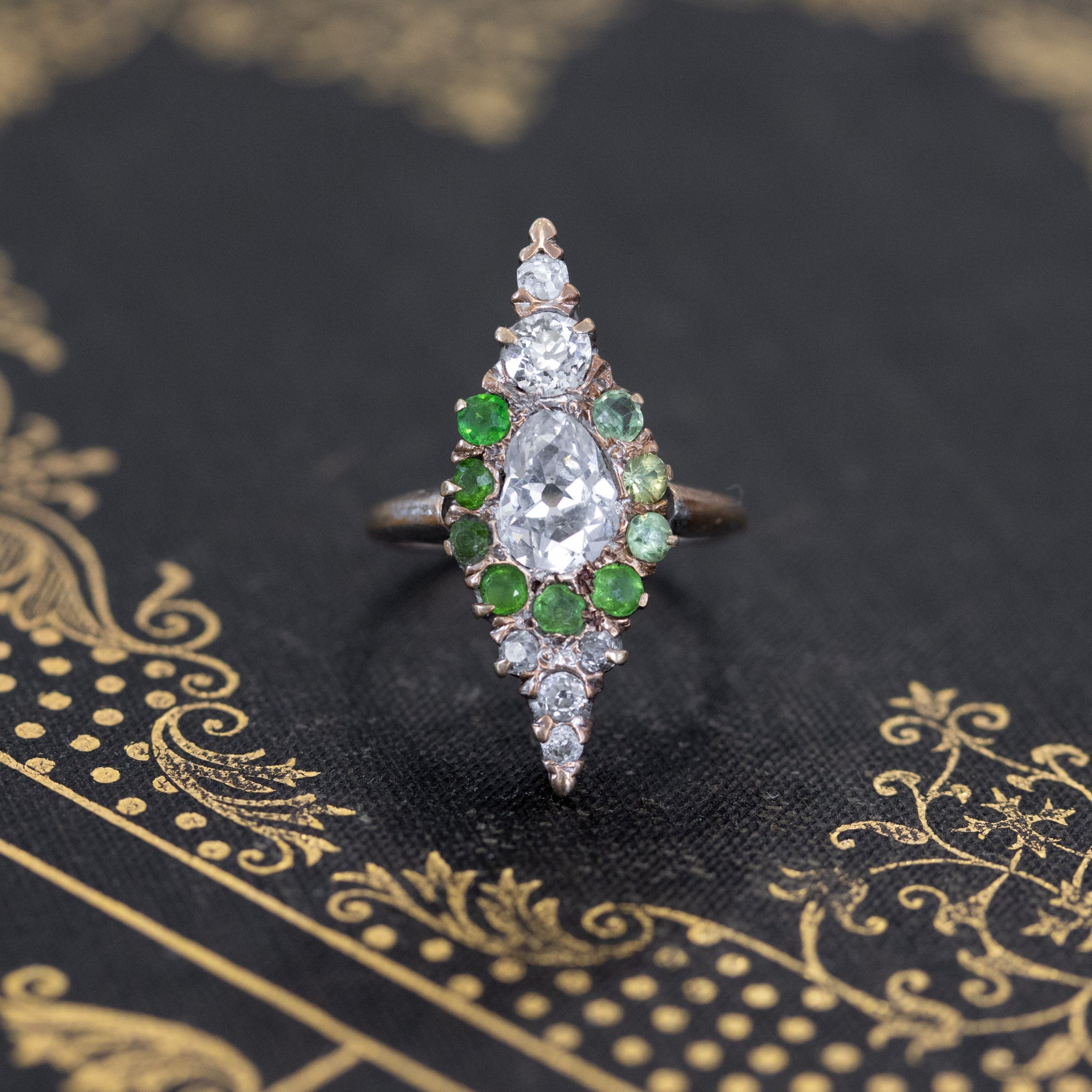 This Victorian diamond and garnet navette ring has become an office favorite, and for so many reasons! From the horseshoe motif (never seen one like this before!) to the green Demantoid garnets to the chunky oval-y pear-ish old mine cut in the center, this ring has got it all.