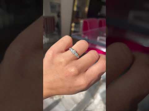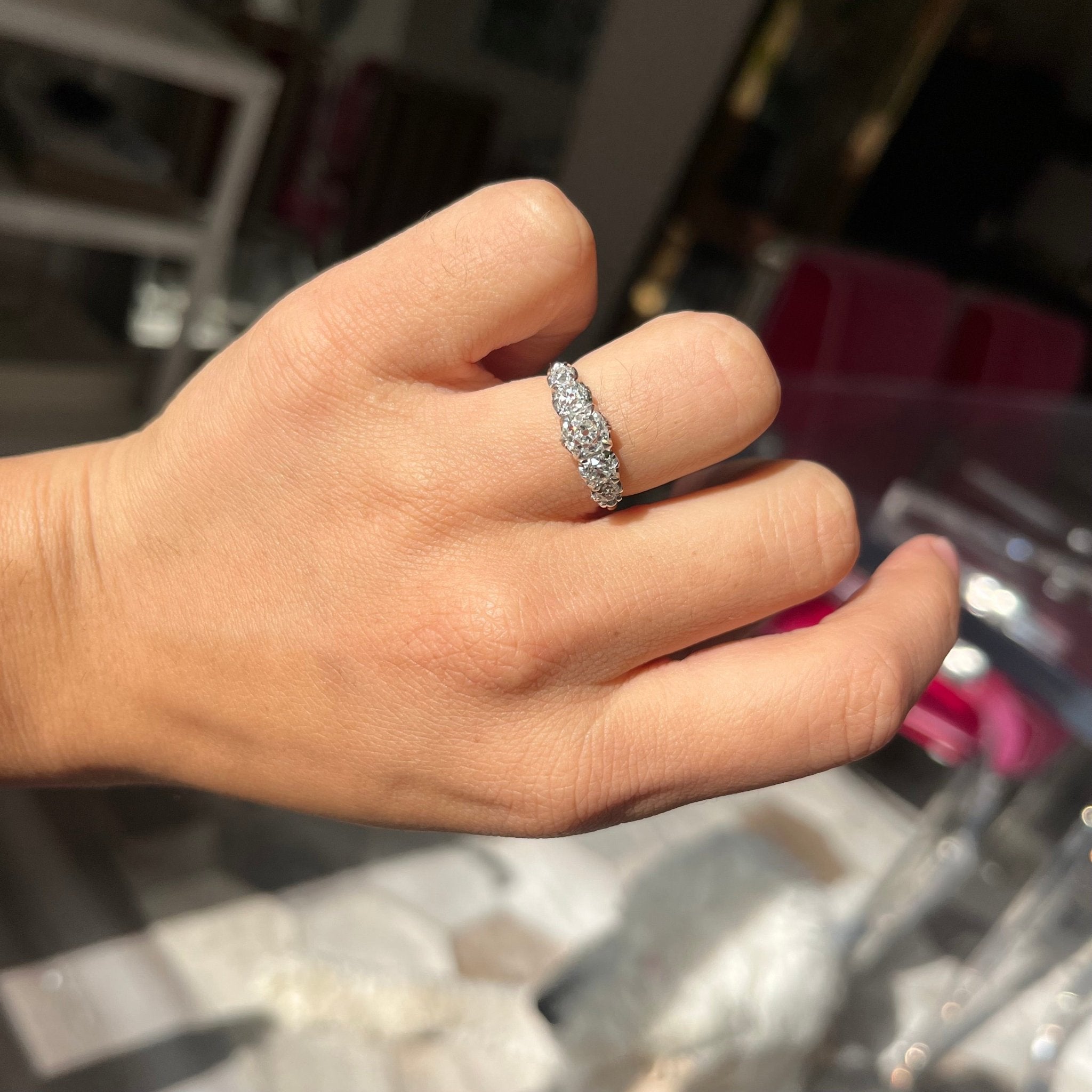Modeled after antique diamond half-hoop bands from the Georgian and Victorian eras, this 5-stone band is set with chunky and charming old mine cut diamonds in platinum! The diamonds are bright, sparkly, twinkly - so elegant on the finger. This particular parcel is graduated in size, which maximizes diamond coverage in a subtle and unique way. We love how they stack with other bands just as much as we love ‘em when worn by themselves.