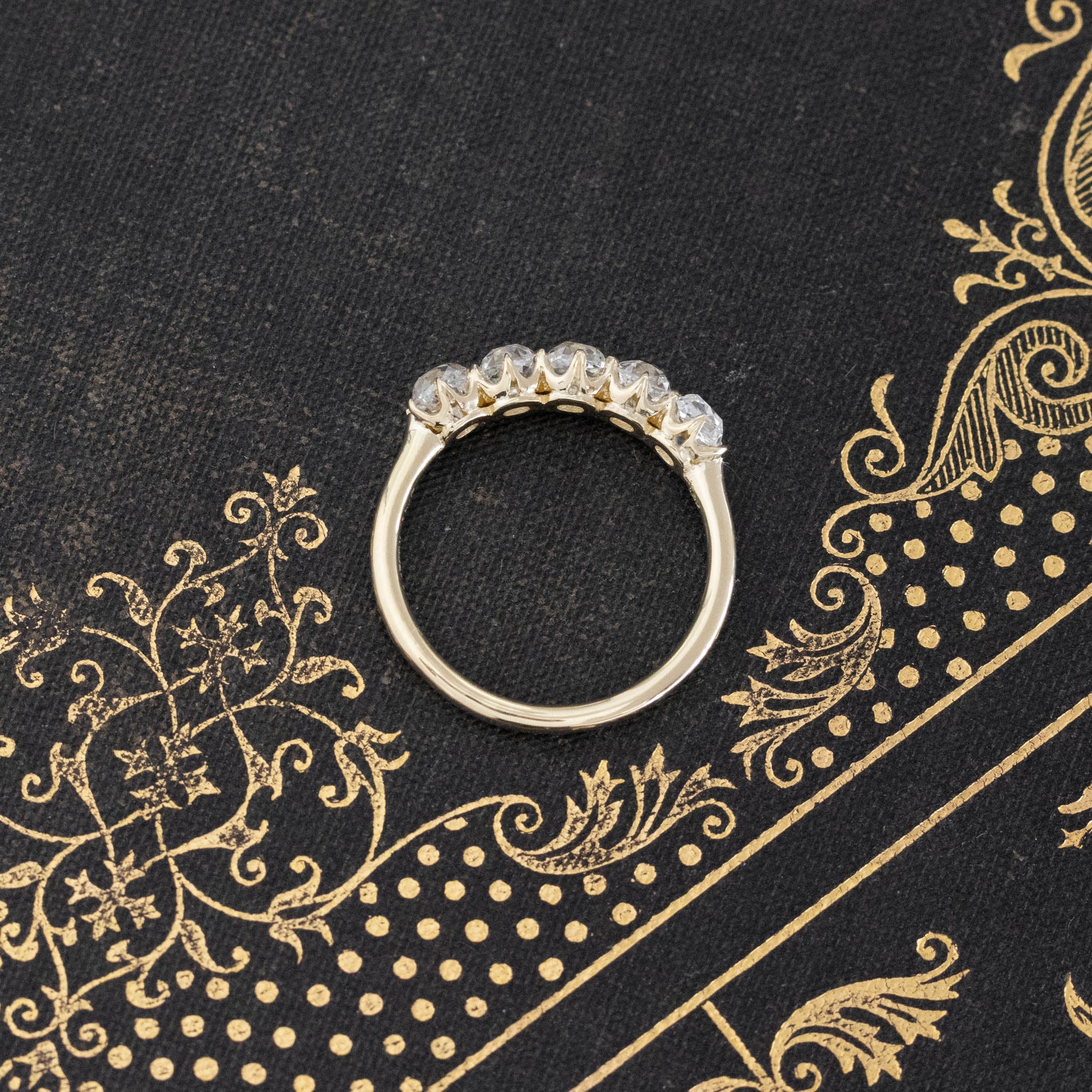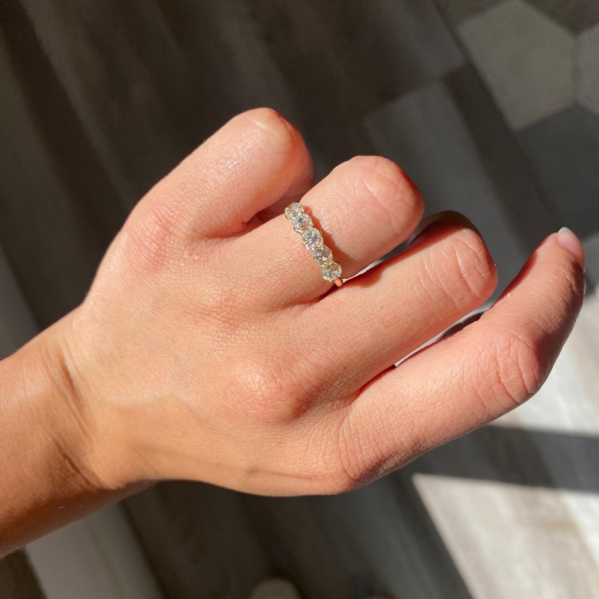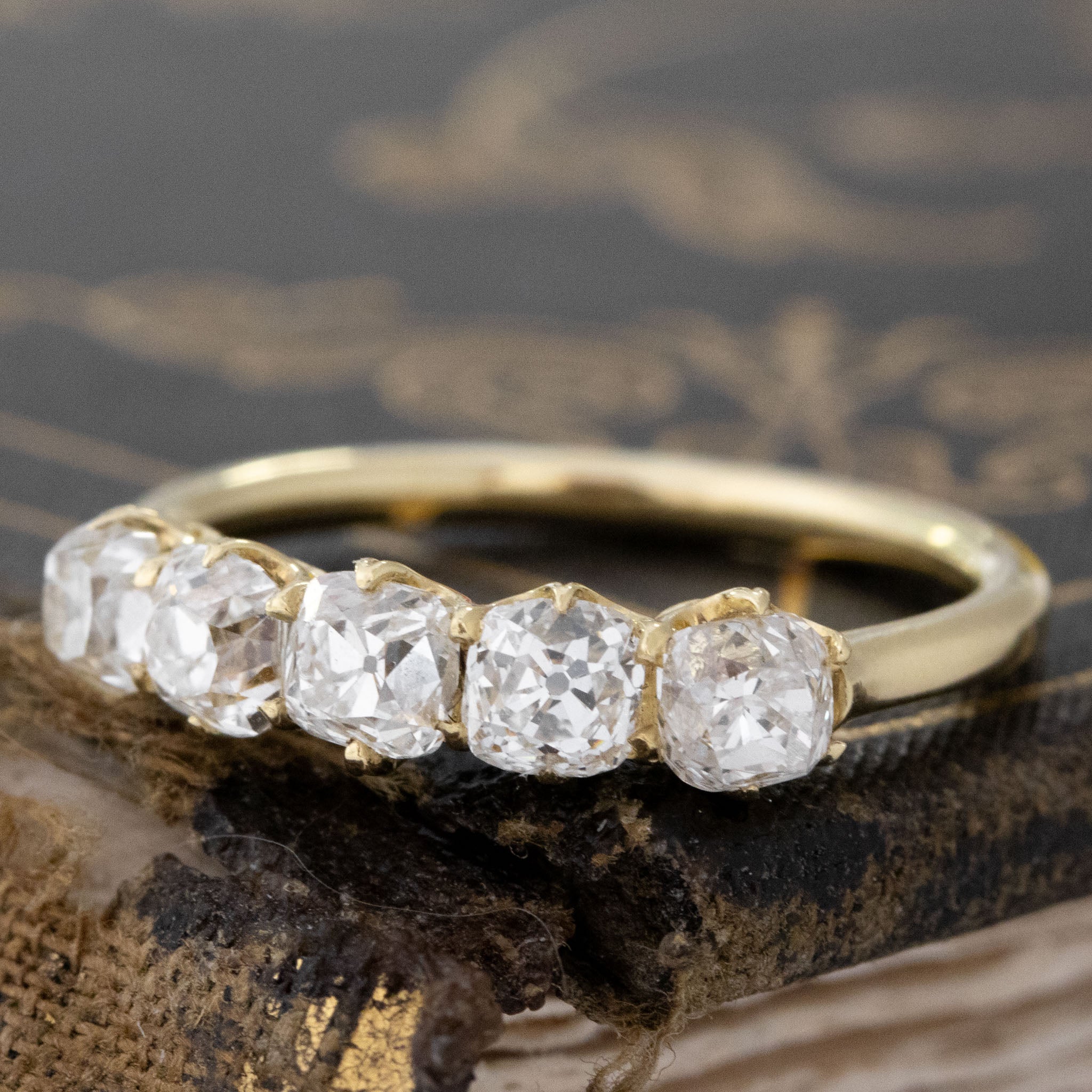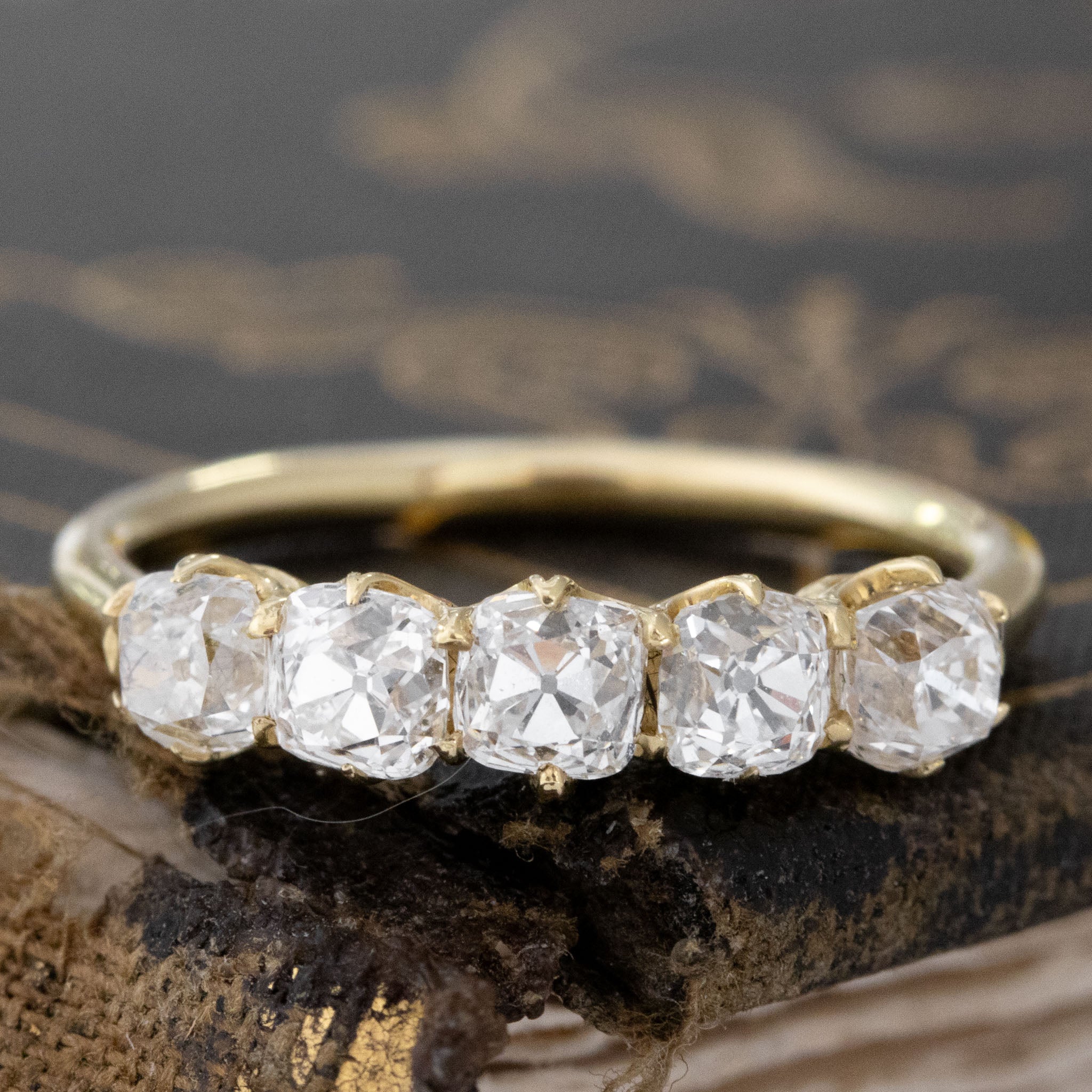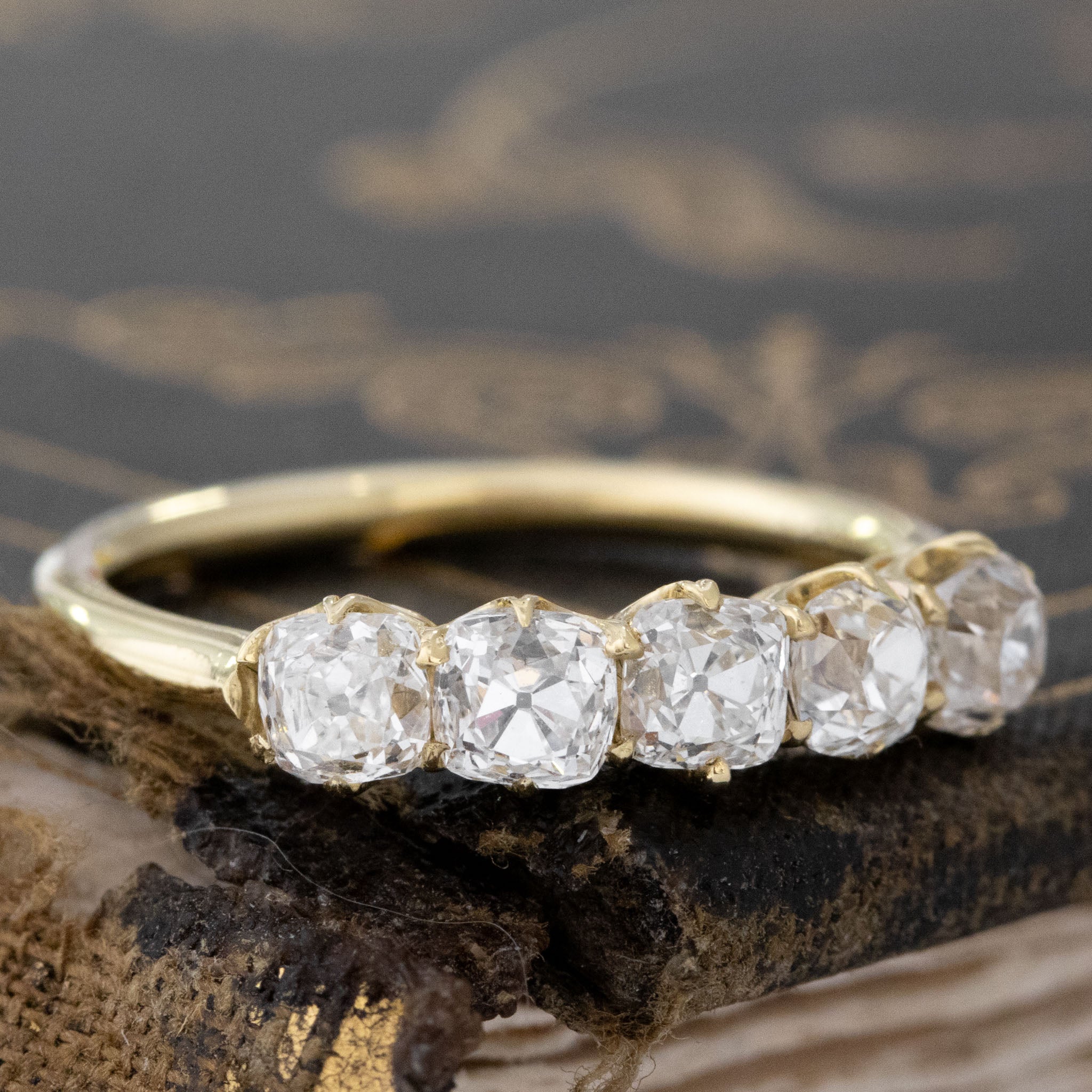 Modeled after antique diamond bands from the Georgian and Victorian eras, this 5-stone band is set with chunky and charming old mine cut diamonds in 18kt Yellow Gold! The diamonds are bright and sparkly and just looks so beautiful and elegant on the finger.