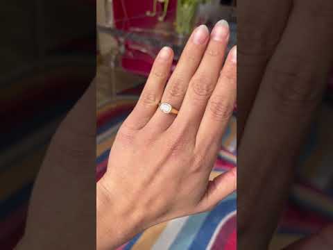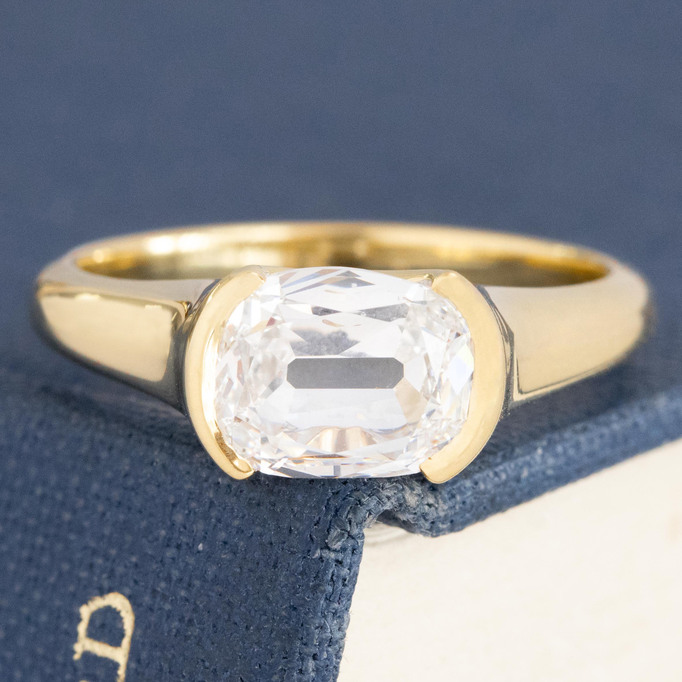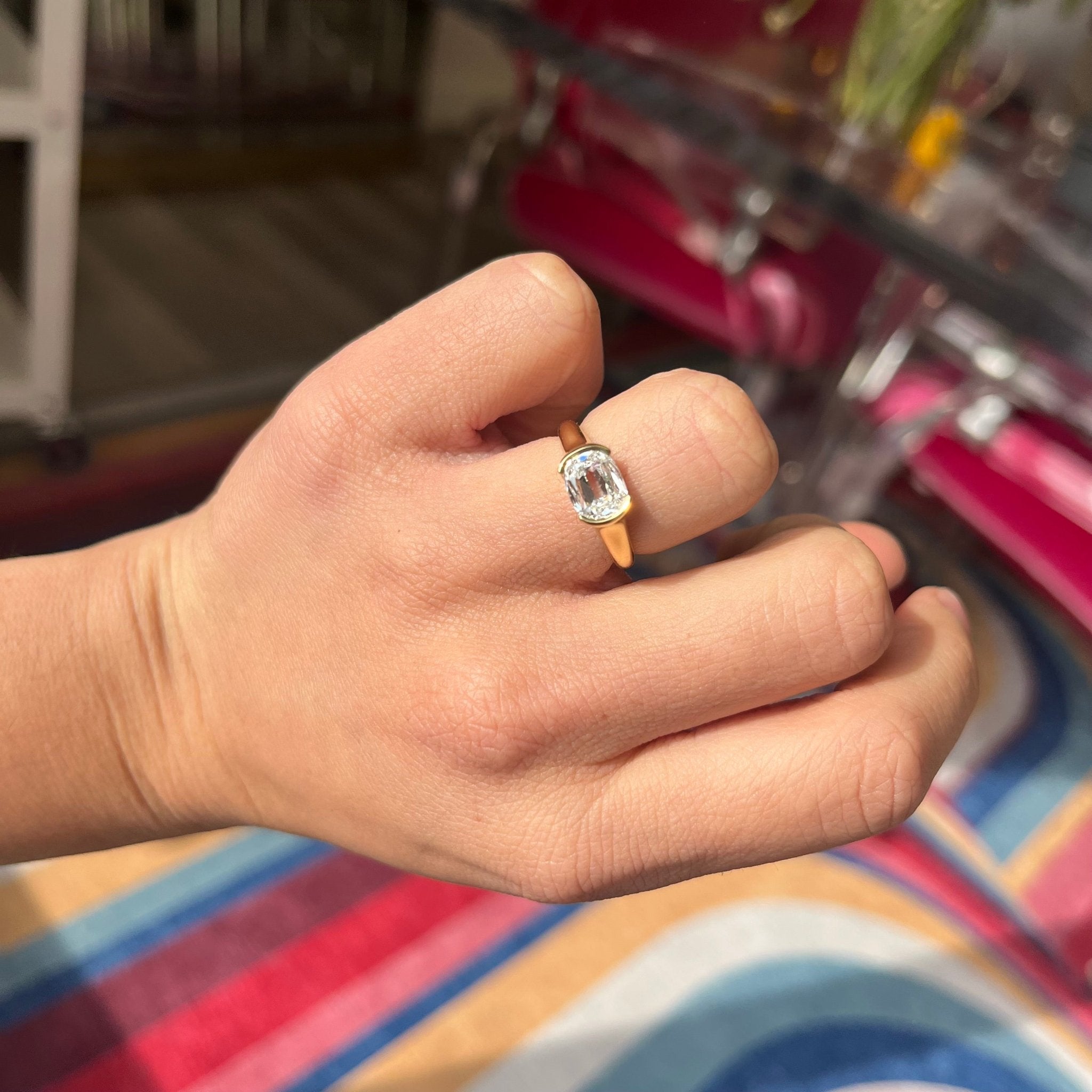 with a very desirable, slightly elongated shape that is universally flattering. The diamond is E color - she is icy-white and super bright! Incredibly lively too - perfectly set East-West in rich yellow gold. Clean, simple lines allow the diamond to literally shine. This setting style also allows a band to sit flush next to it. Perfection all around!