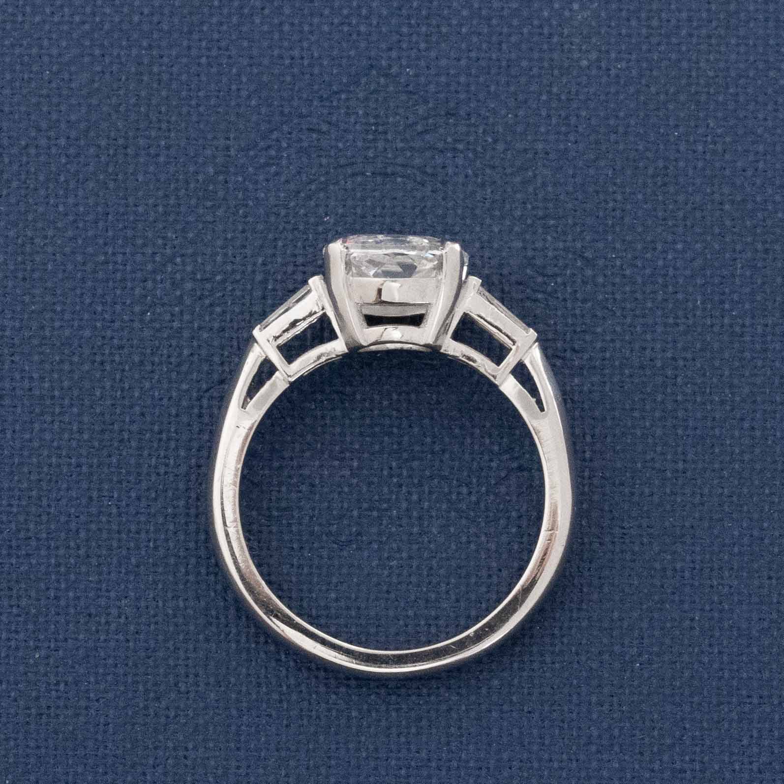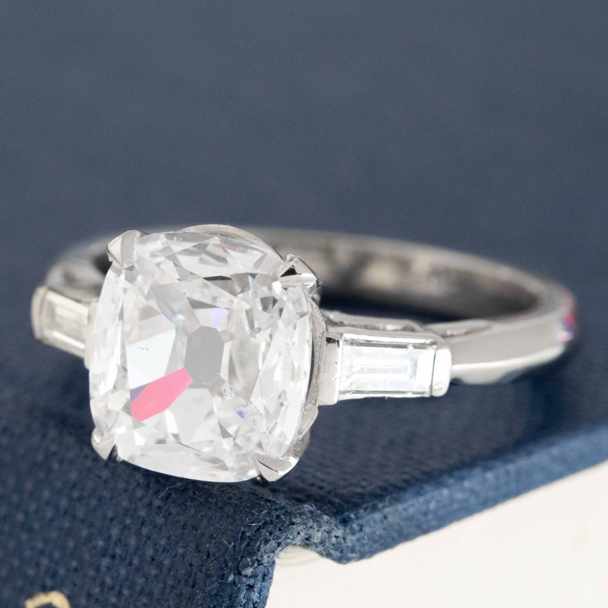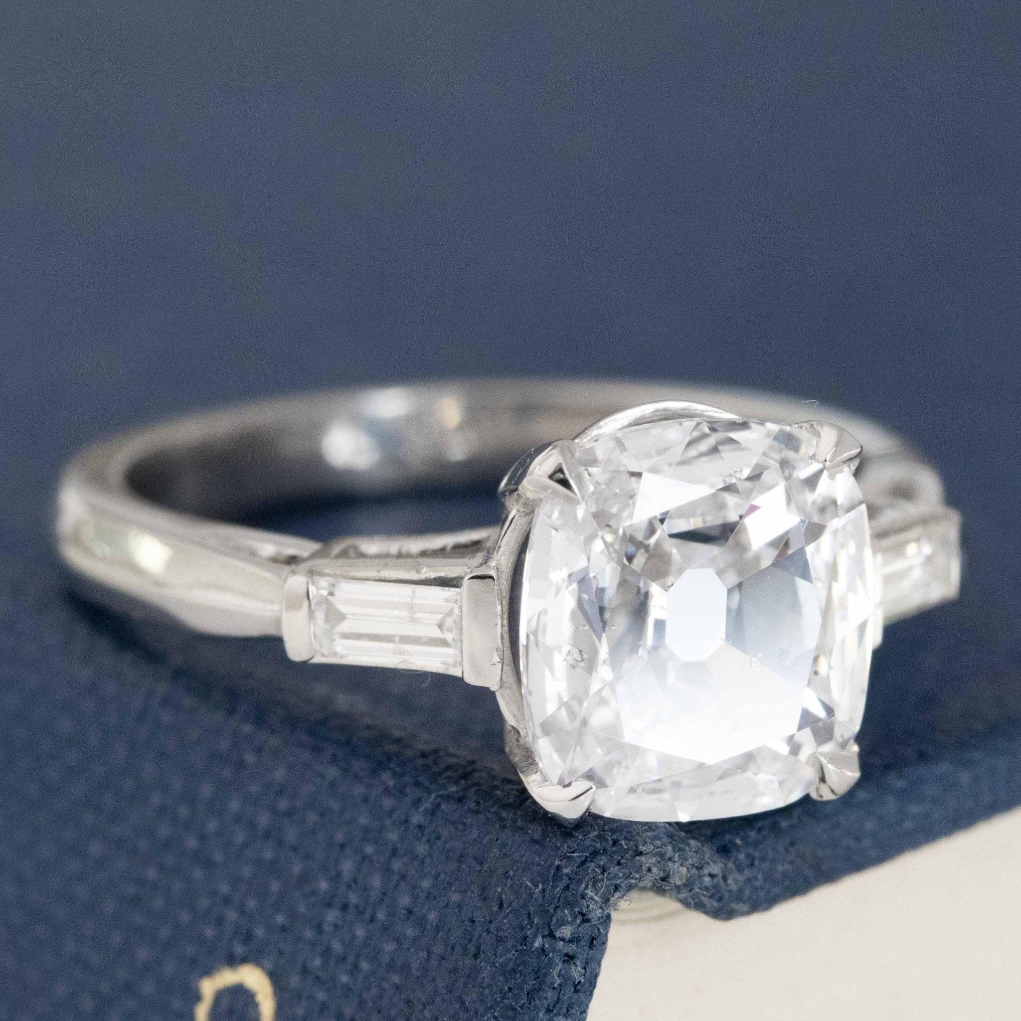 Big Harry Winston energy with this one! A modern take on a classic Deco motif, this 1.50ct cushion cut sits in the center flanked by two baguette cut diamonds. It is antique-style (hence the chunky facets and open culet), so you get a ton of spread and size