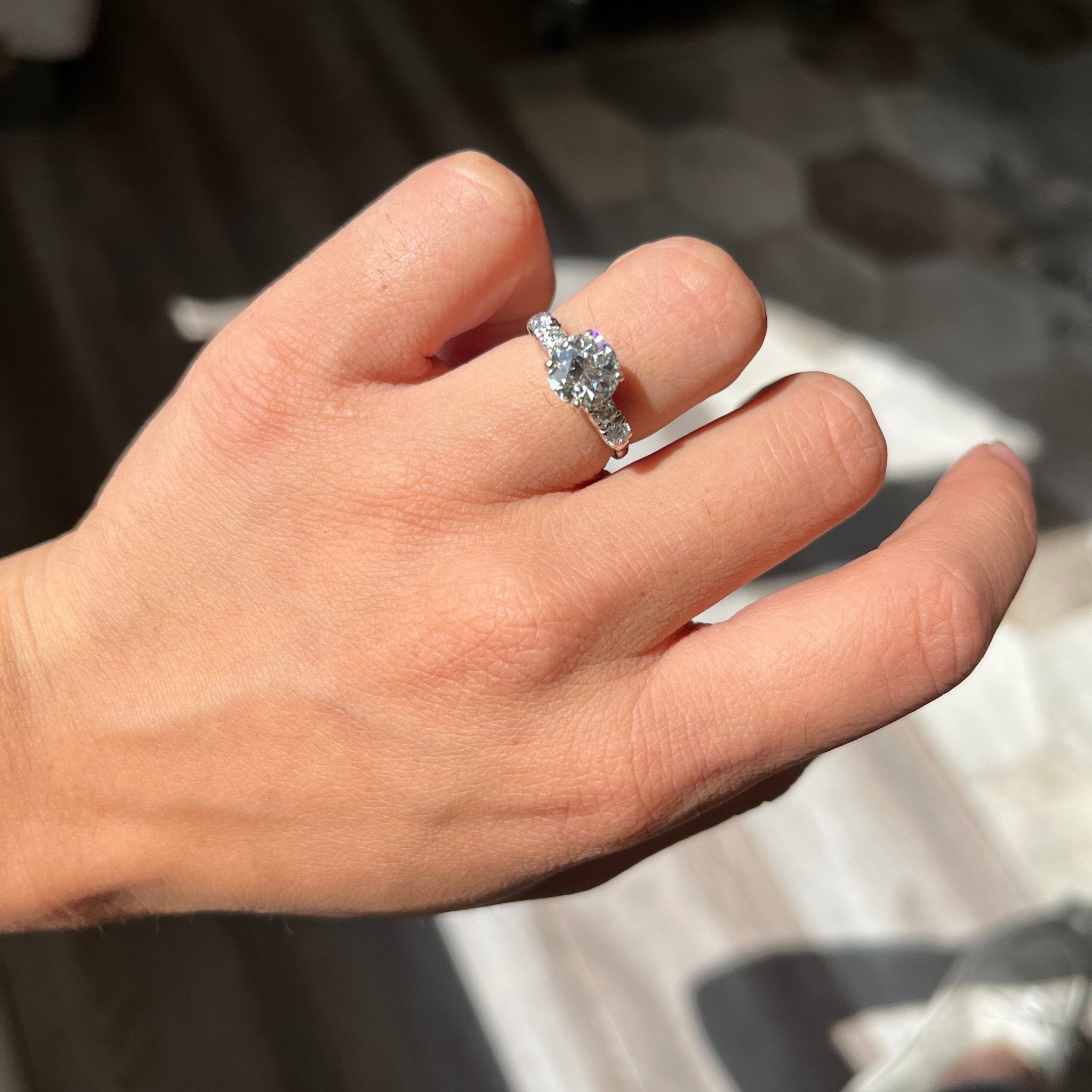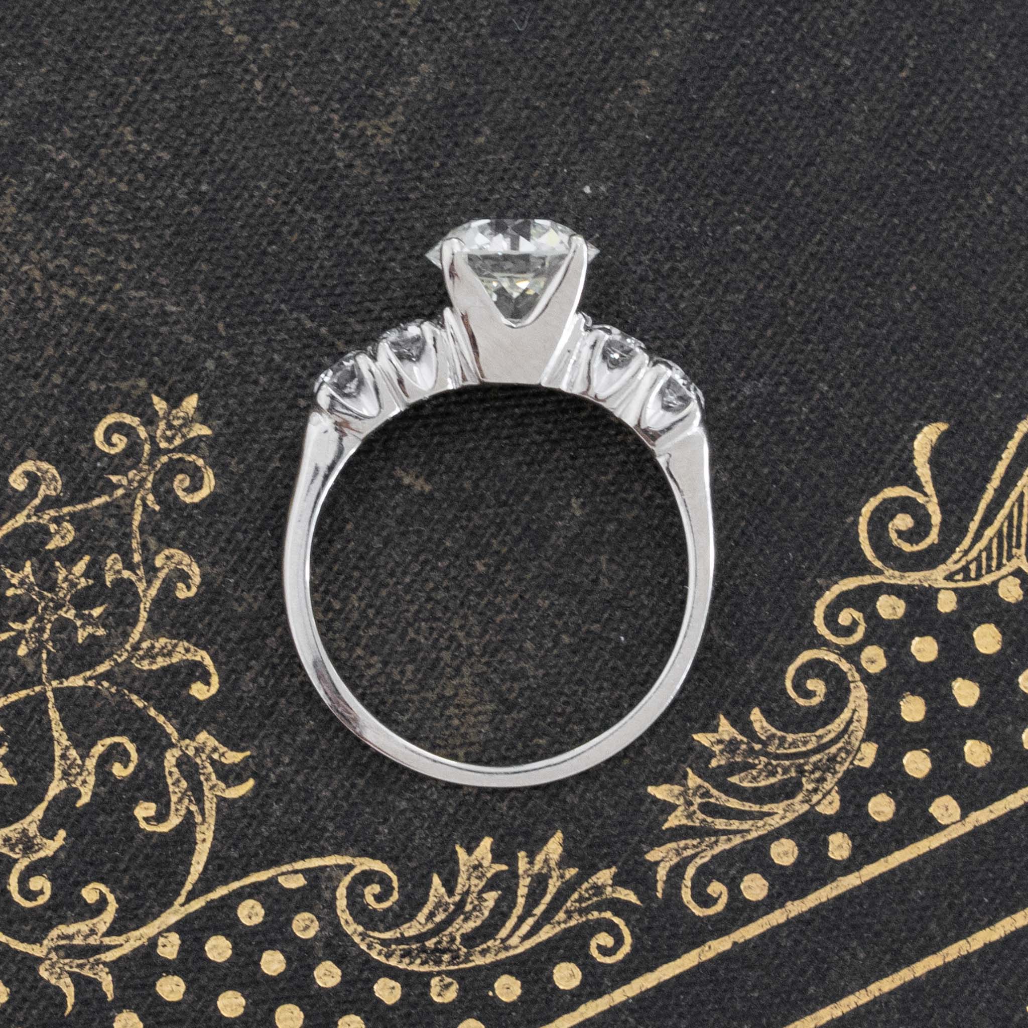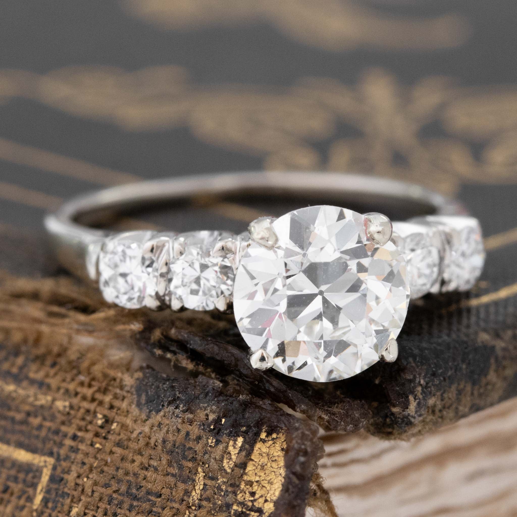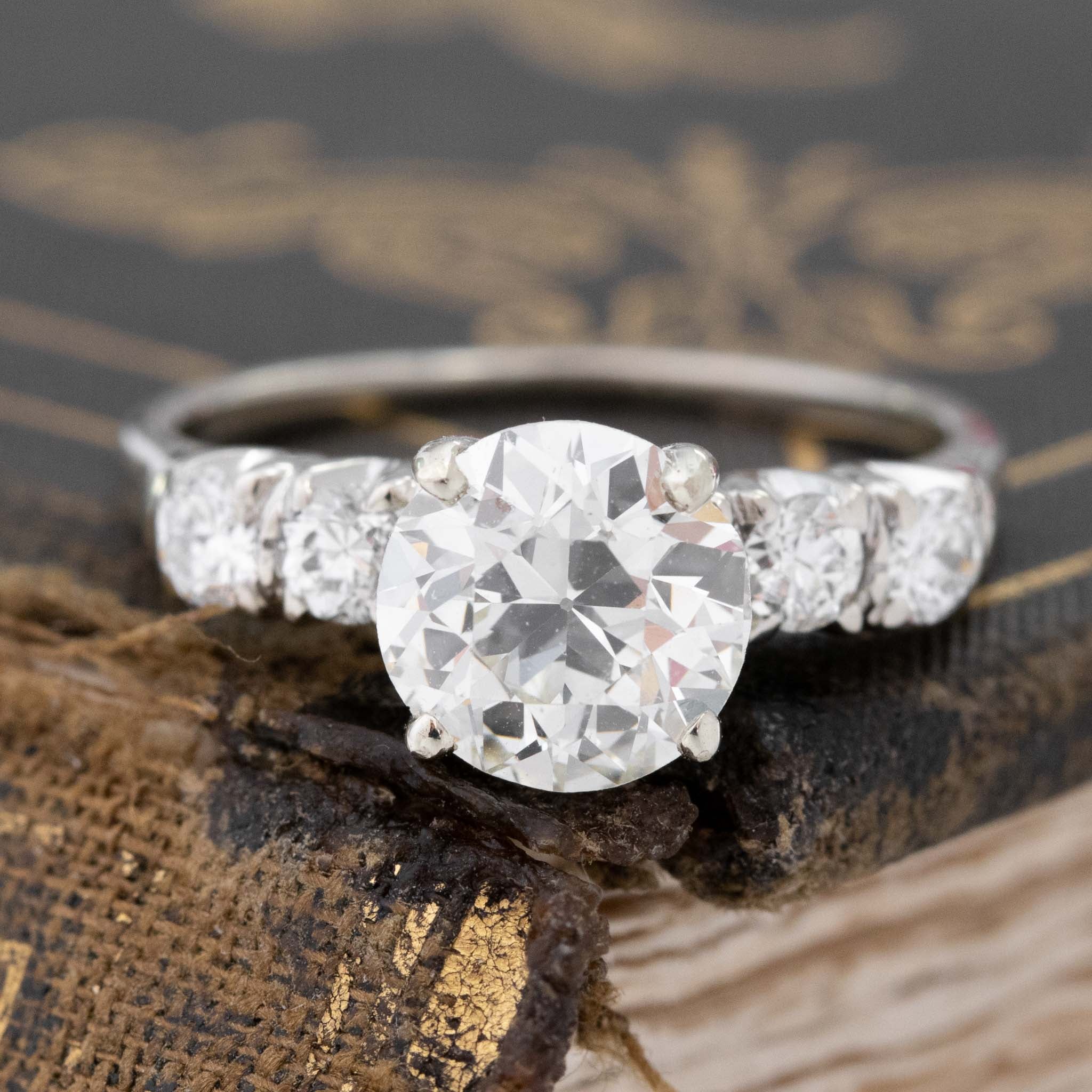 A quintessential vintage ring, and set with a sizable 1.50ct old European cut diamond to boot too! Super bright and sparkly on the finger, the central stone is enhanced by a trio of OECs on the shoulders, set in fishtail prongs. The center stone has the prettiest make, with that much desired flowery facet pattern under the table. She just twinkles on the finger!