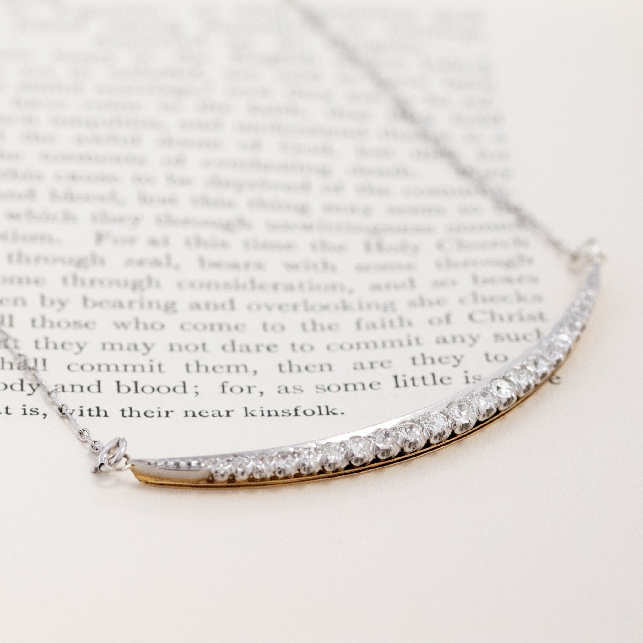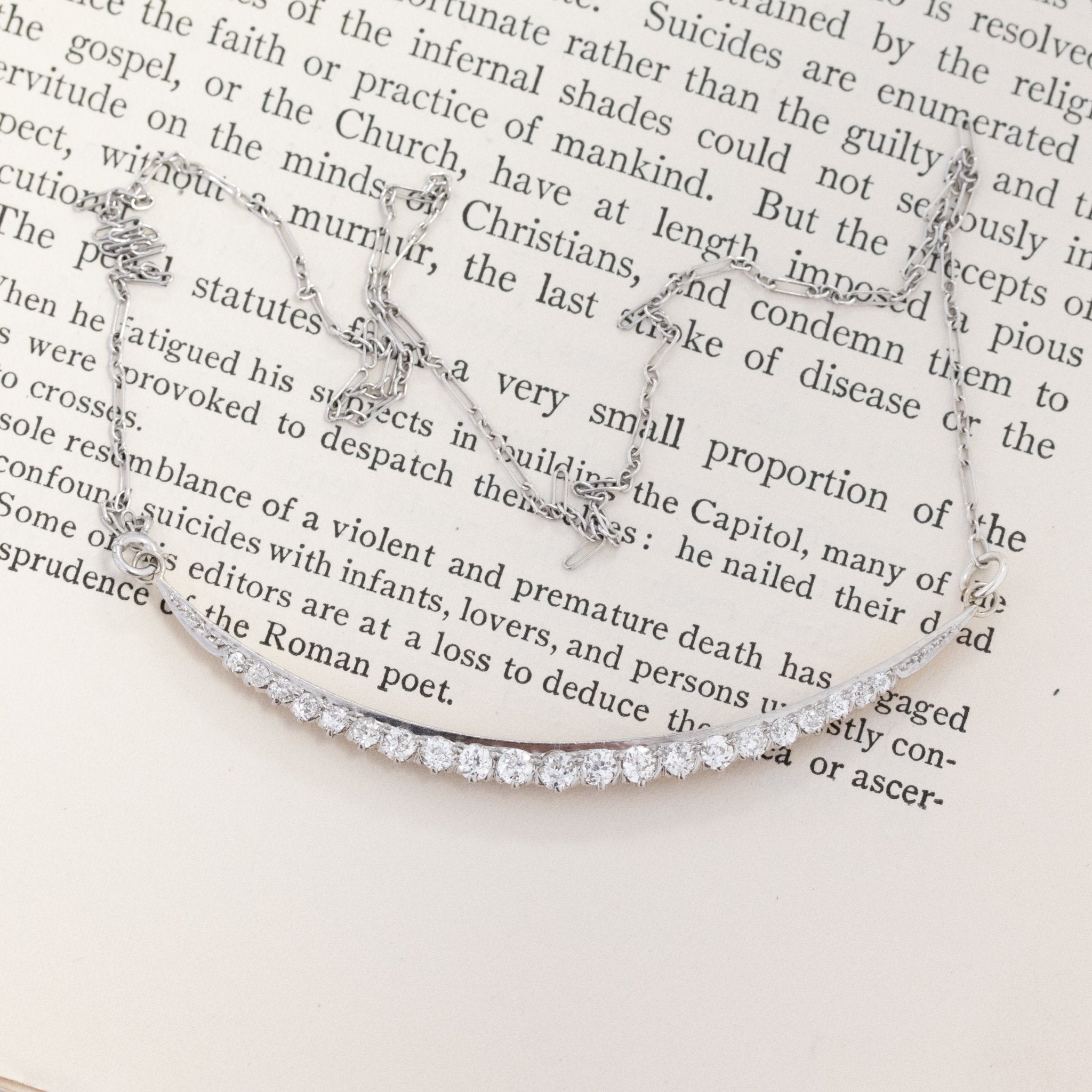 Set east-west for an elegant and spready look, this crescent is station to a simple vintage platinum cable link chain that allows the diamonds to do all that talking. We love how this necklace sits on its’ own, but stacked together with a few gold chains couldn’t hurt anybody.