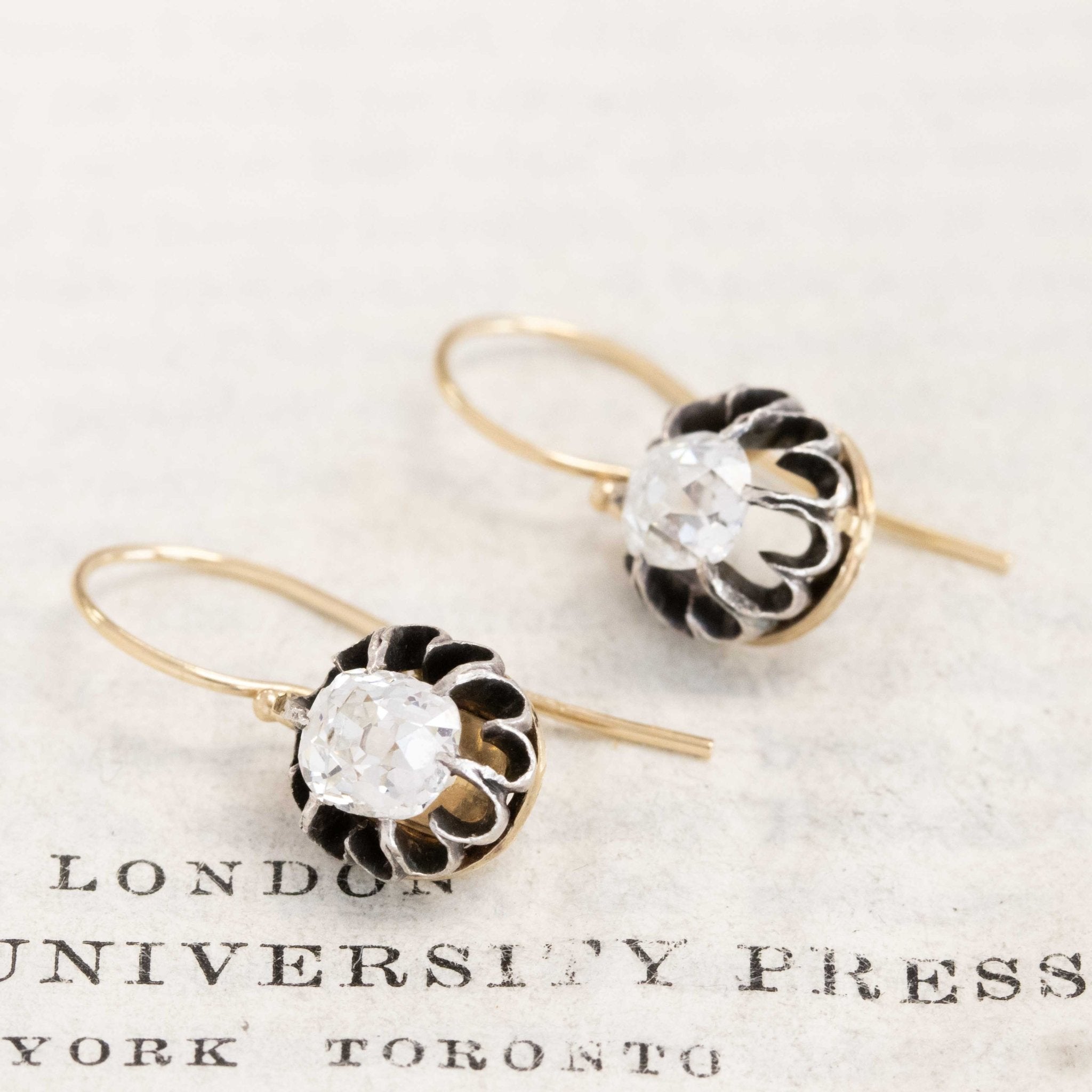 Rare and much desired elongated old mine cuts , set in their original silver over gold scallop settings and strung on 14kt French wires. These earrings are the perfect juxtaposition of the (very) old and the new - a gorgeous pair of one of a kind earrings that will go beautifully from day to night! The elongated old mine cuts are beyond charming - catching light and fire with every movement.