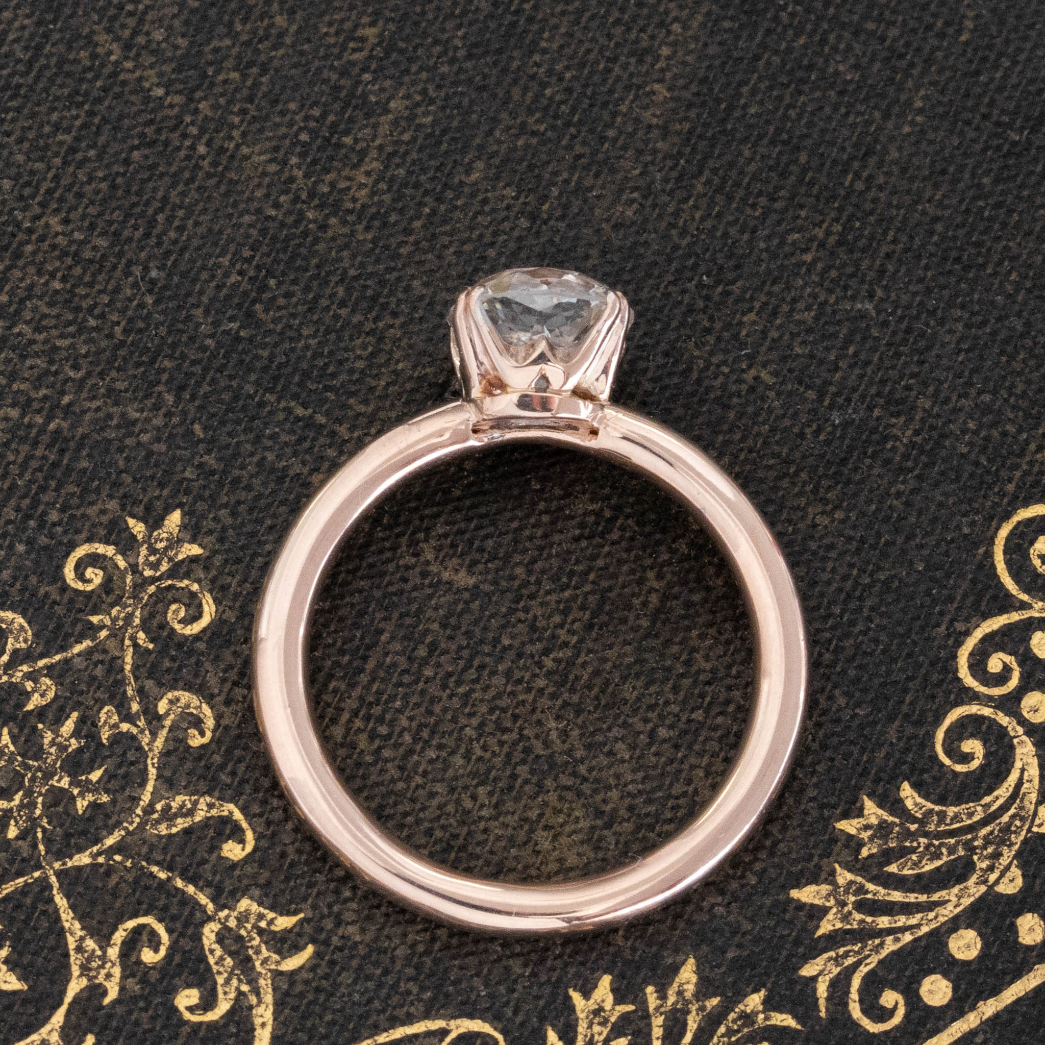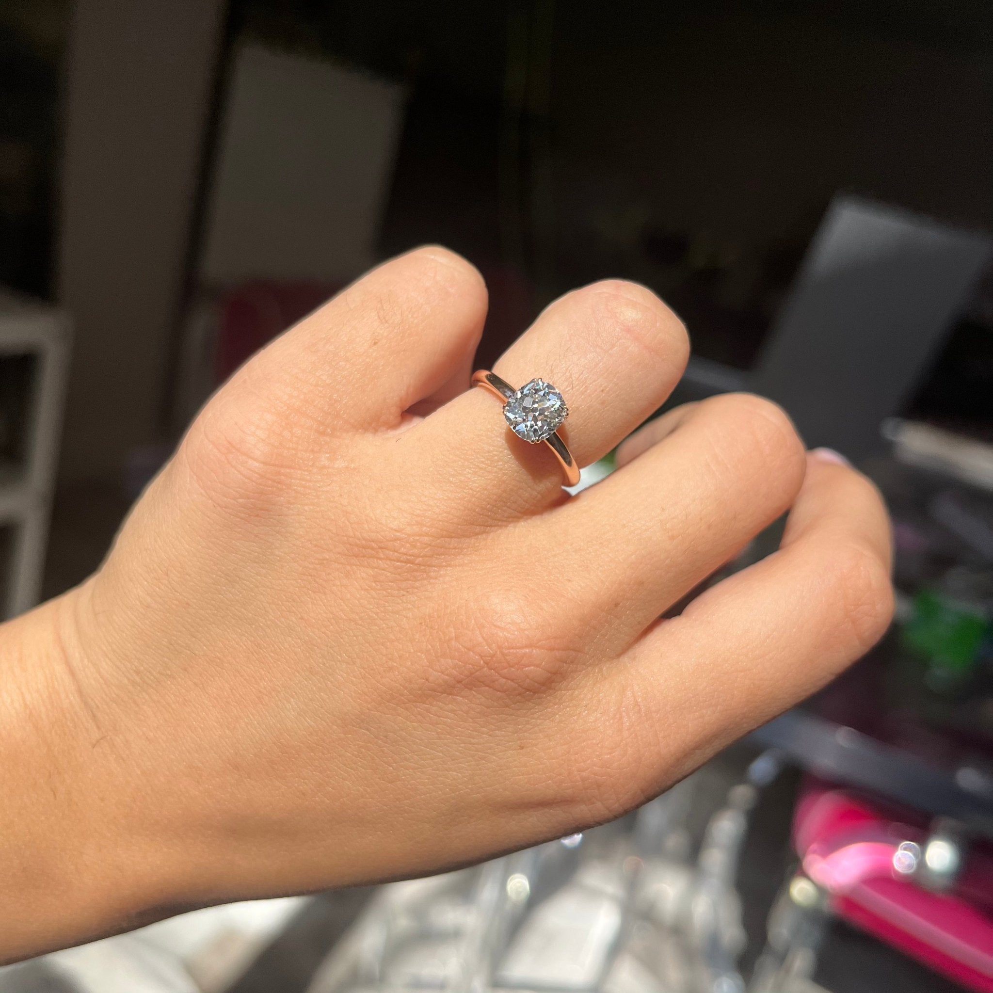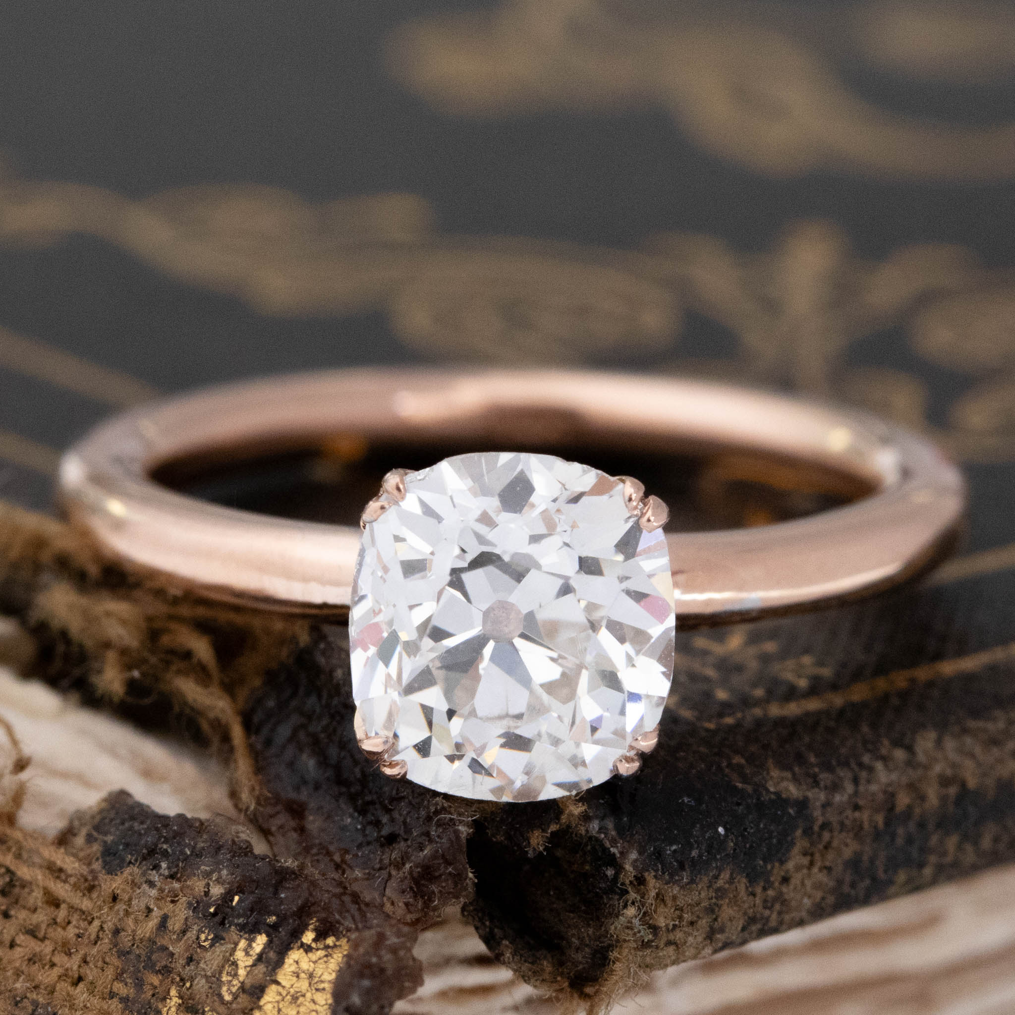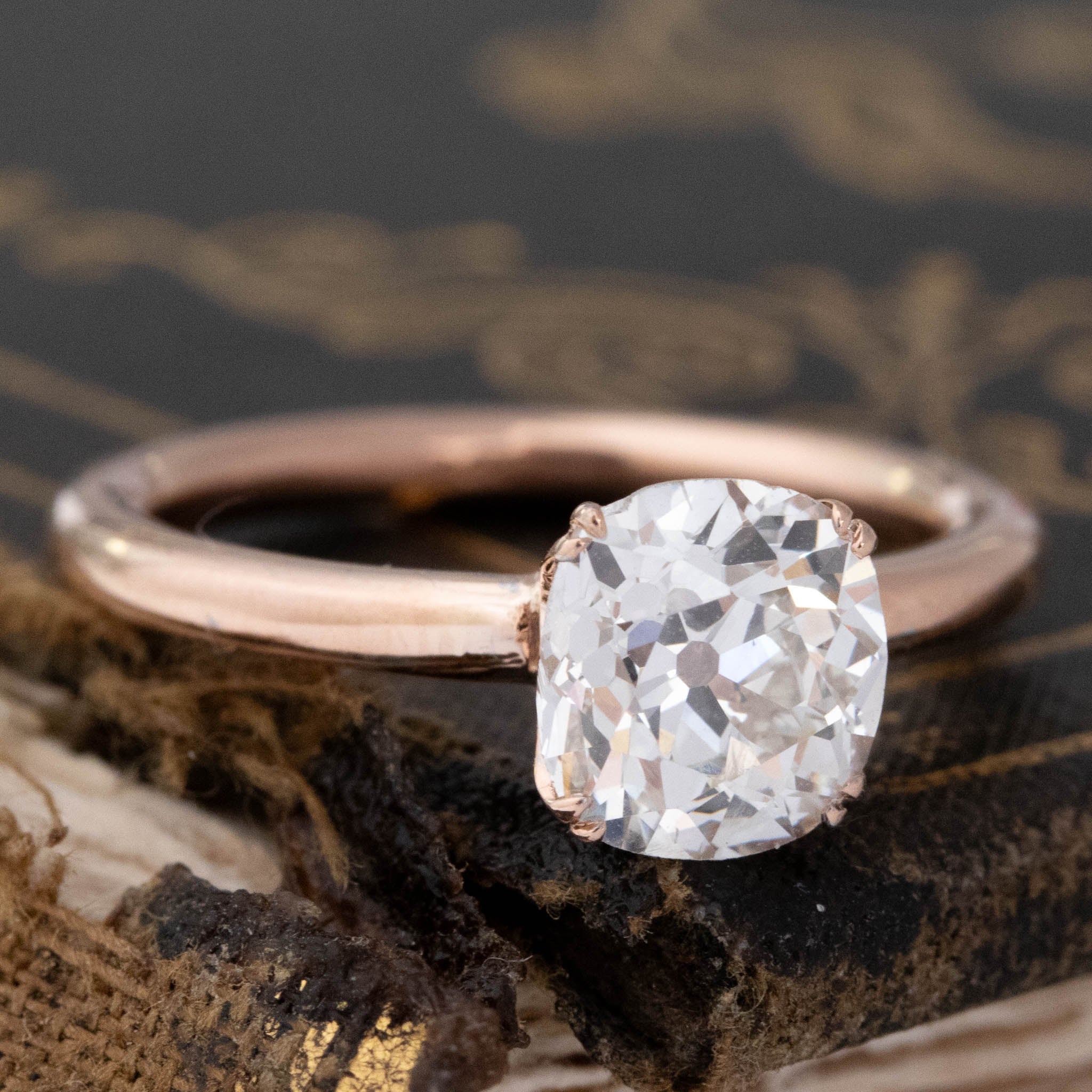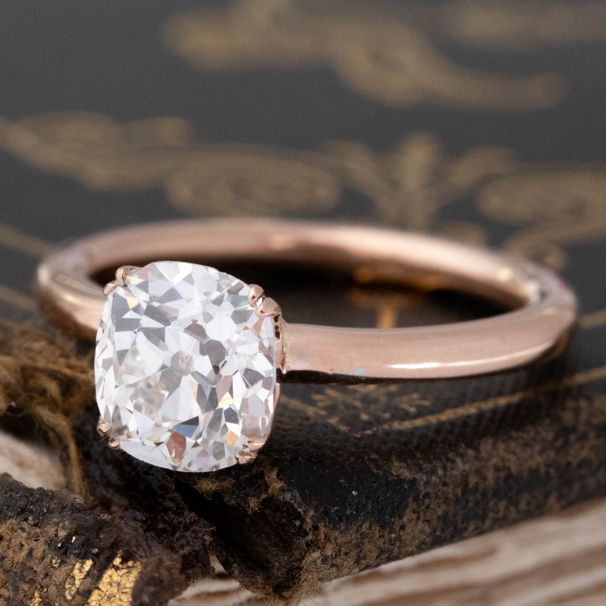 It doesn't get more classic than this! A sweet rose gold solitaire with a 1.51ct old mine cut diamond, a bright and shining GIA J color and VS2 clarity. The stone has very classic old mine faceting in an ever-so-slightly elongated, cushiony shape which we just adore. The rose gold leans into that antique gold which always has a touch of rosy color, with double claw prongs holding her together at the corners.