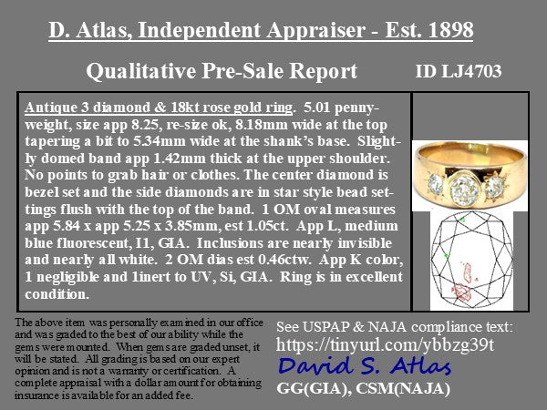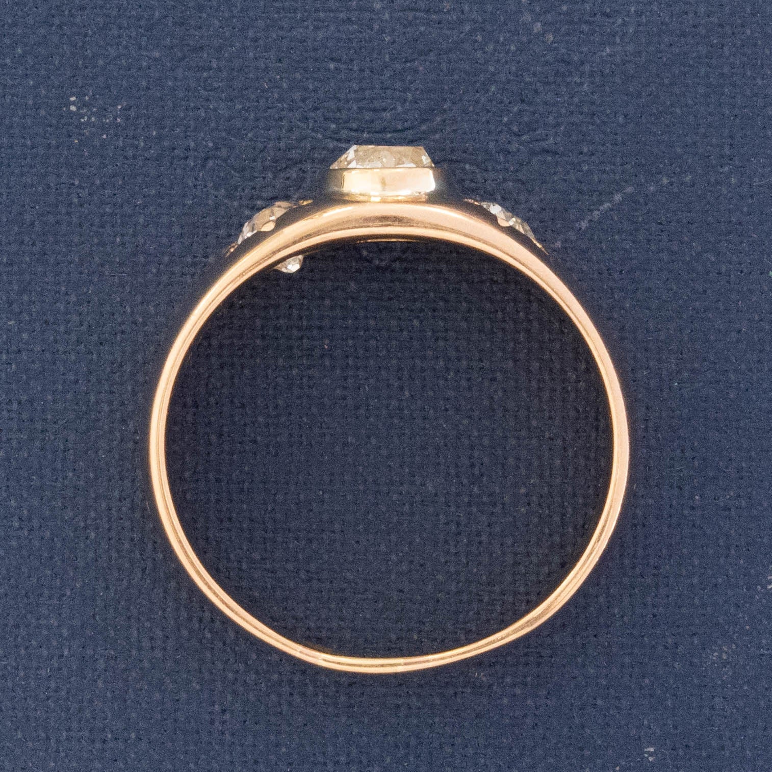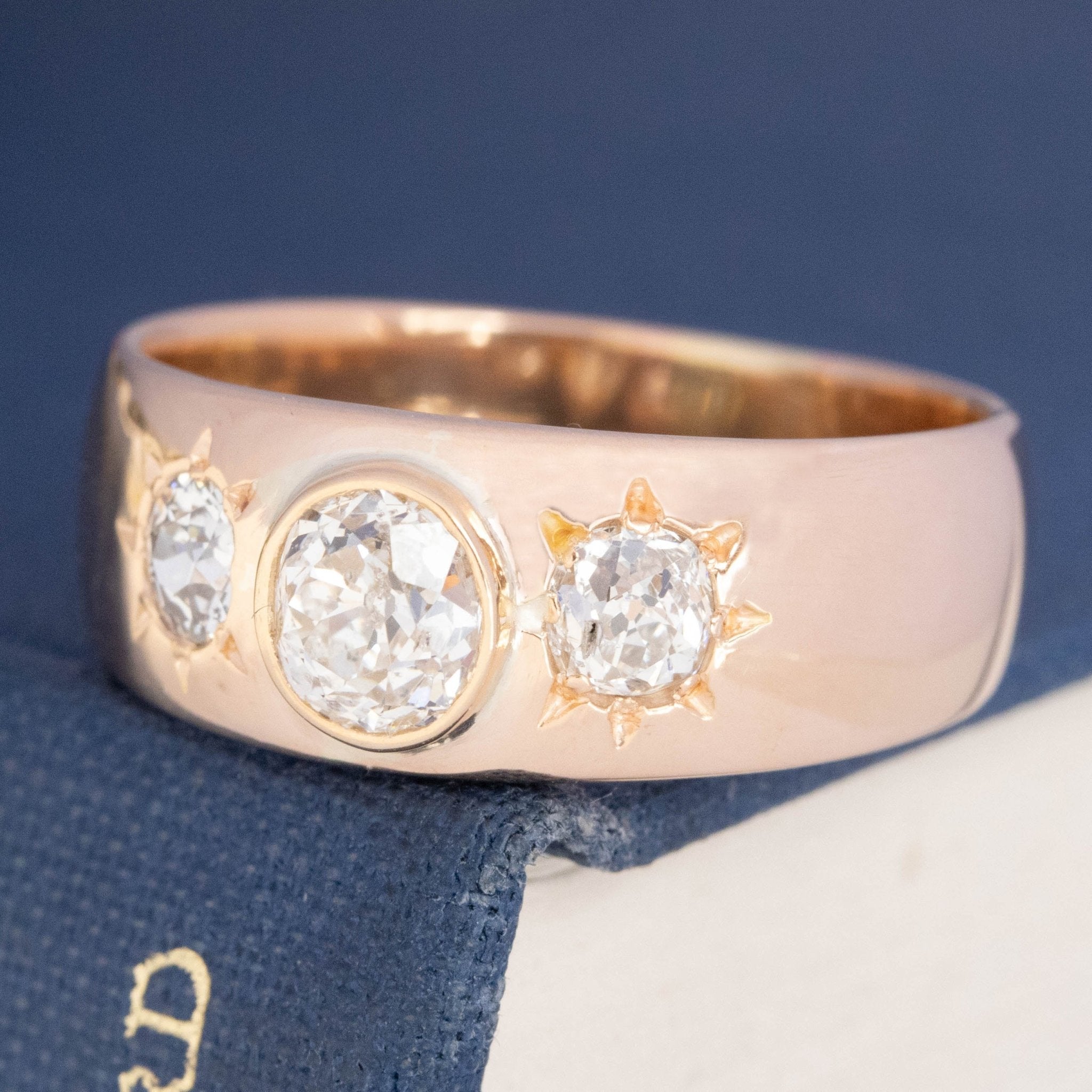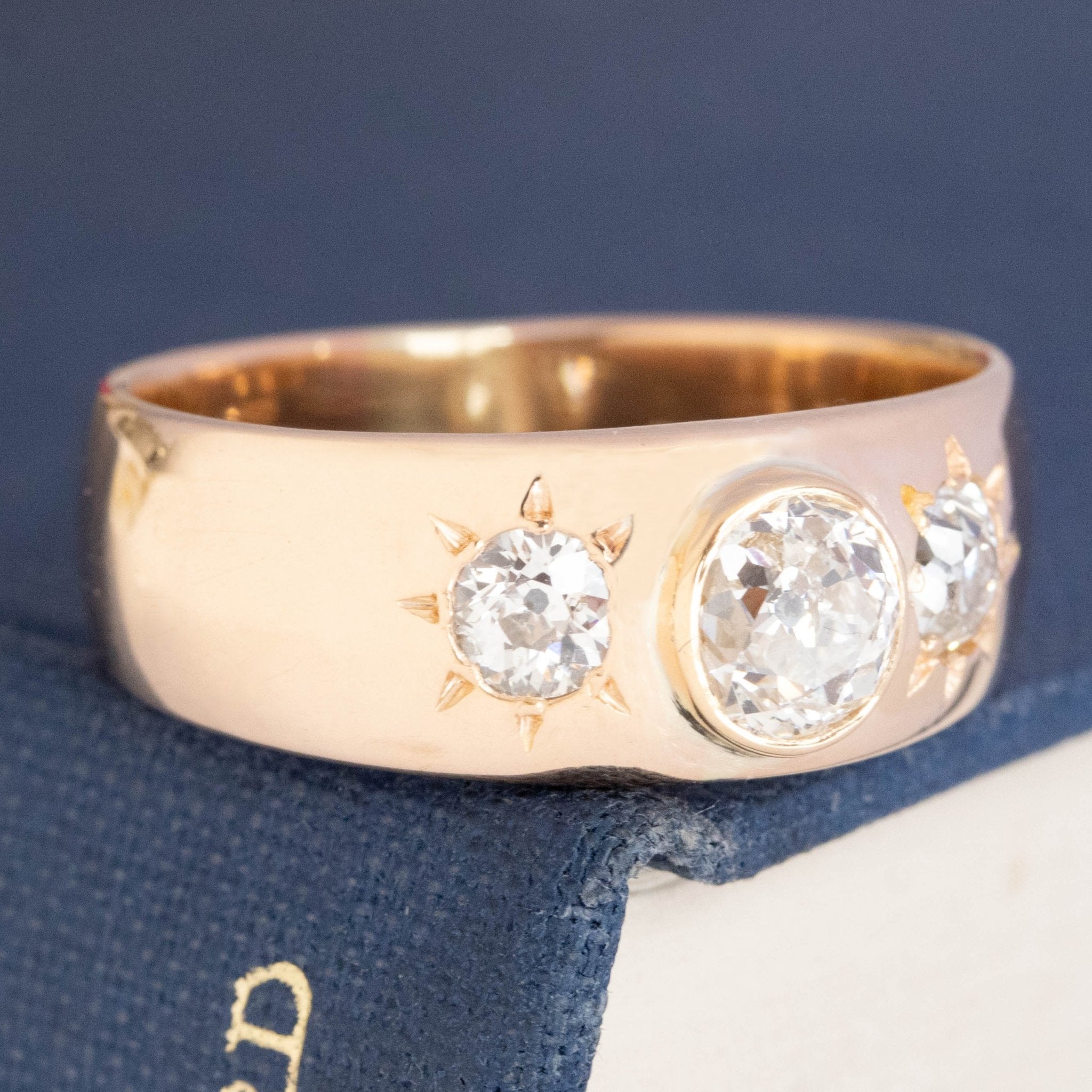 A rosey-gold antique chunky band, set with equally chunky old mine cut diamonds! Each in a slightly-elongated oval shape, the center stone sits in a bezel with a puffy crown which you can see from the profile of the ring. The two side stones are each flush-set into the band with star engraving details, a motif quite common to the era.