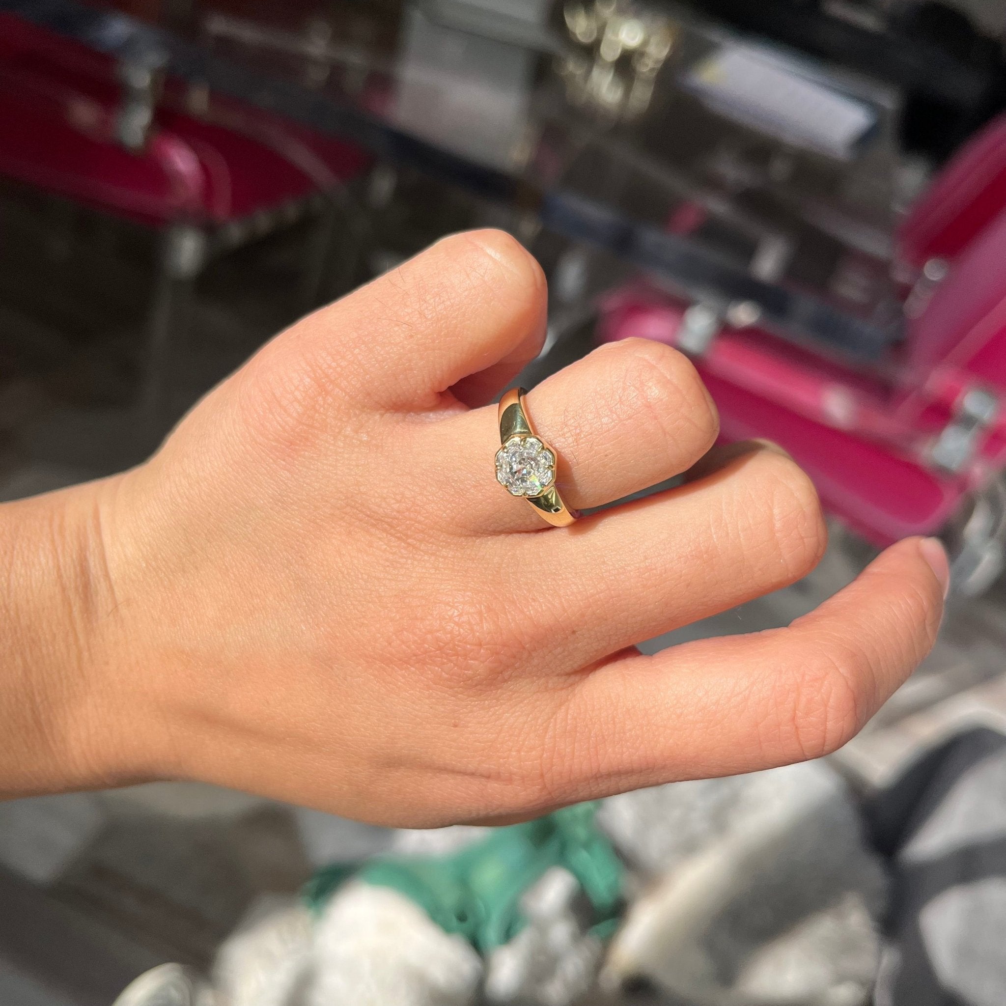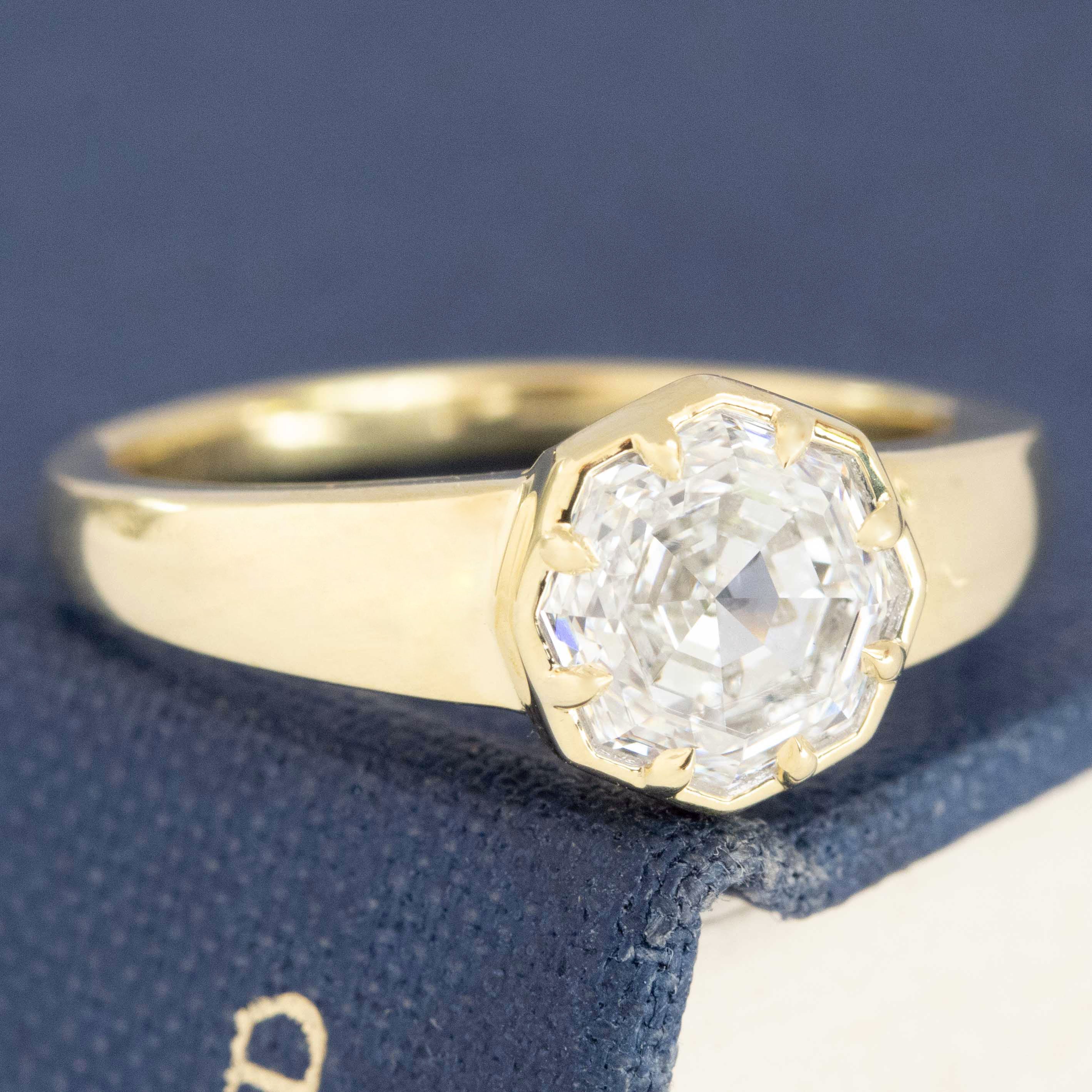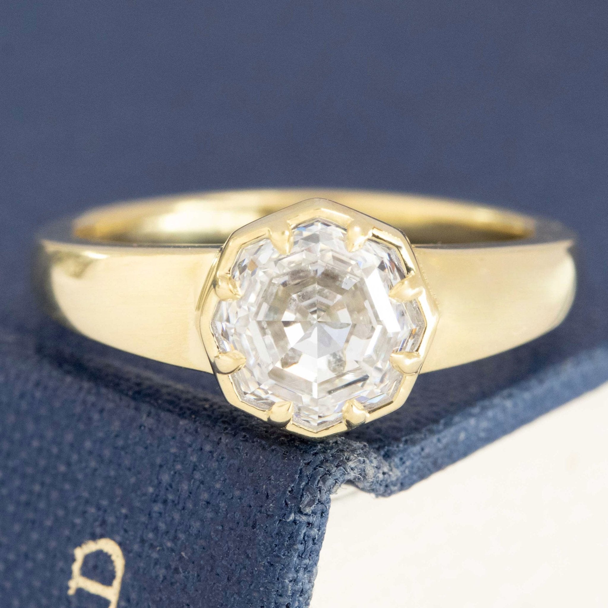 One of the prettiest octagons we have had the pleasure of owning of late - we just love everything about it - the size, the higher color and clarity, and just how its so easy to get lost in its facets! We wanted to soften those corners by a hair in the setting and voila - never did we imagine that we would have a ring that resembles a flower on the finger. Low set on the finger, with a wider band - she is sleek, modern, and incredibly beautiful.