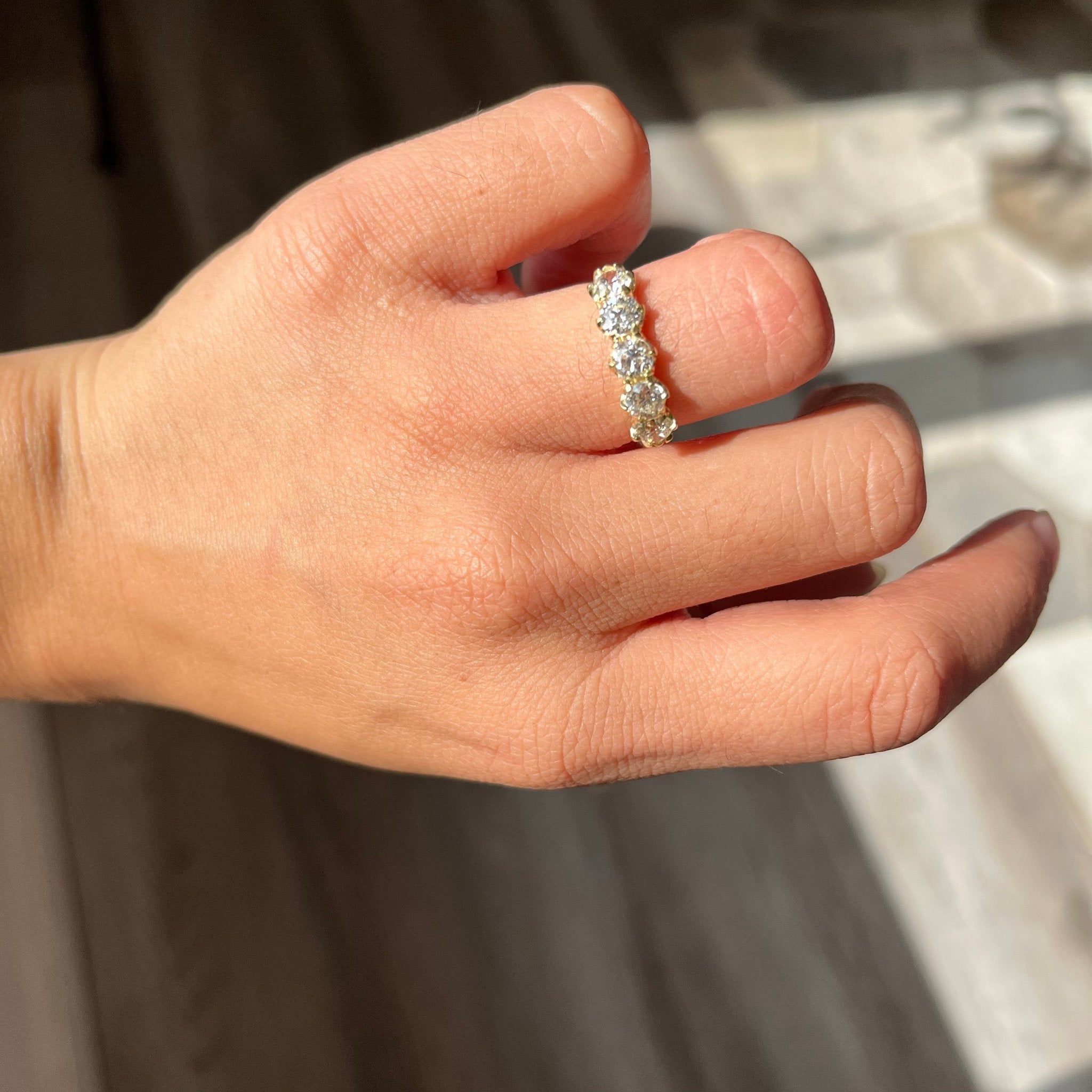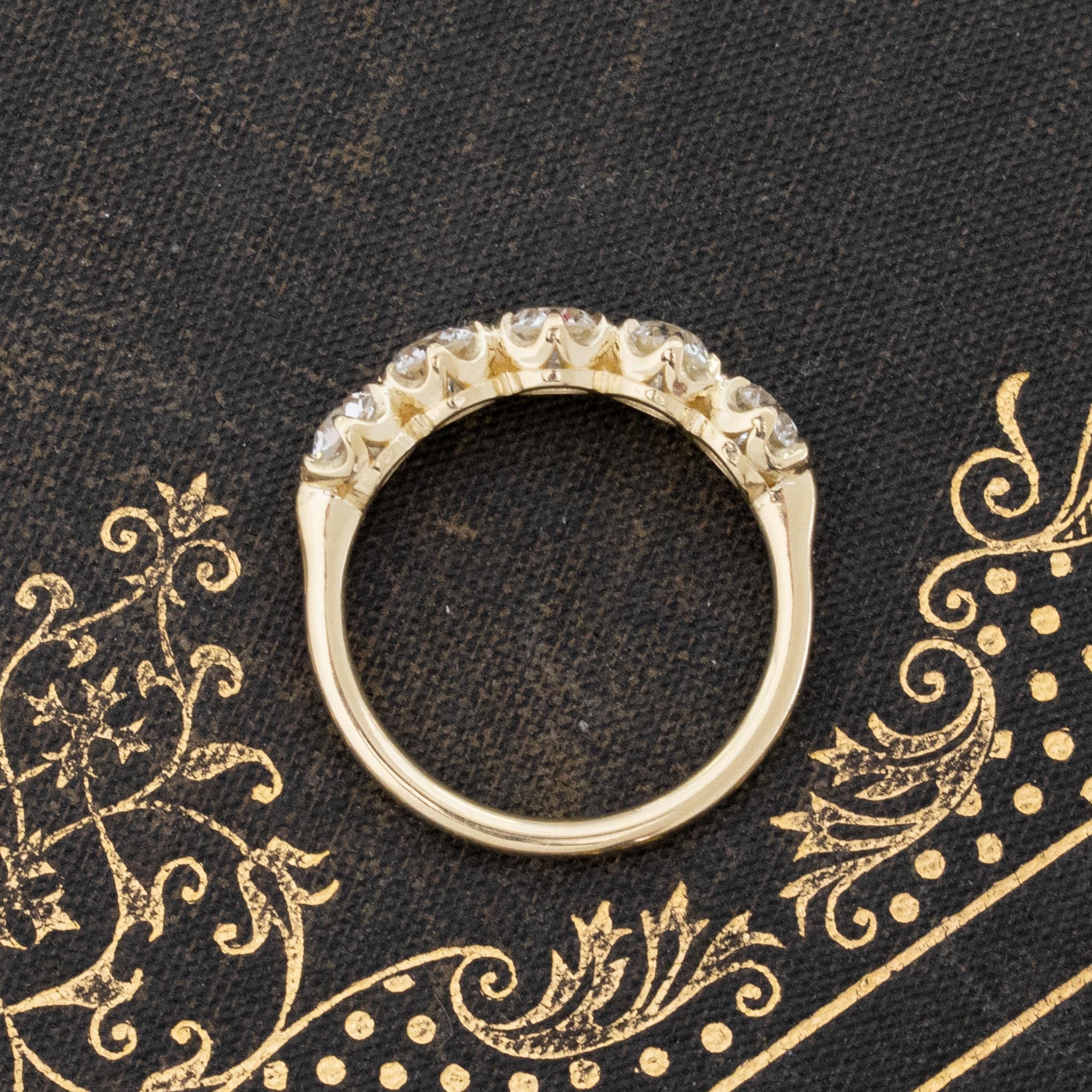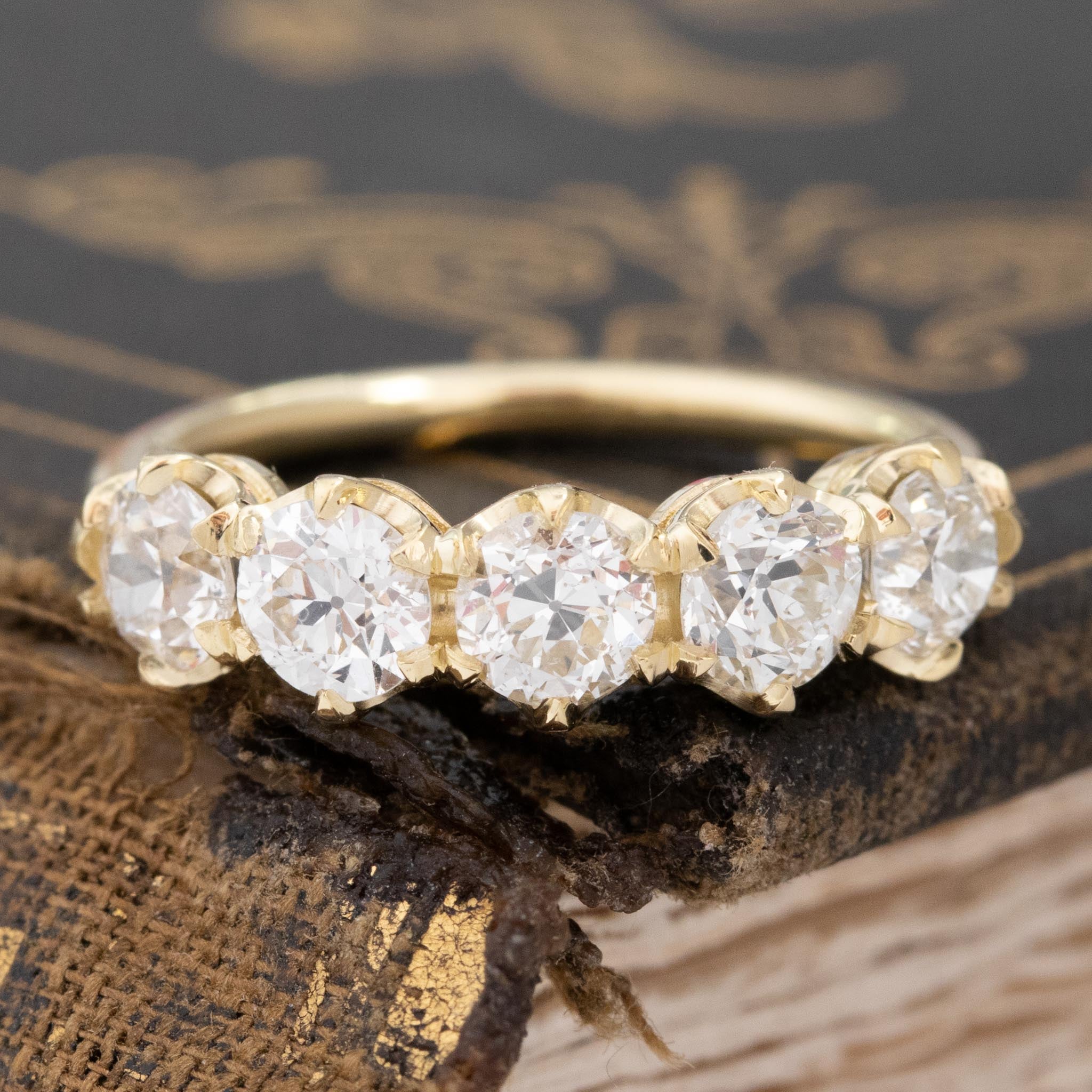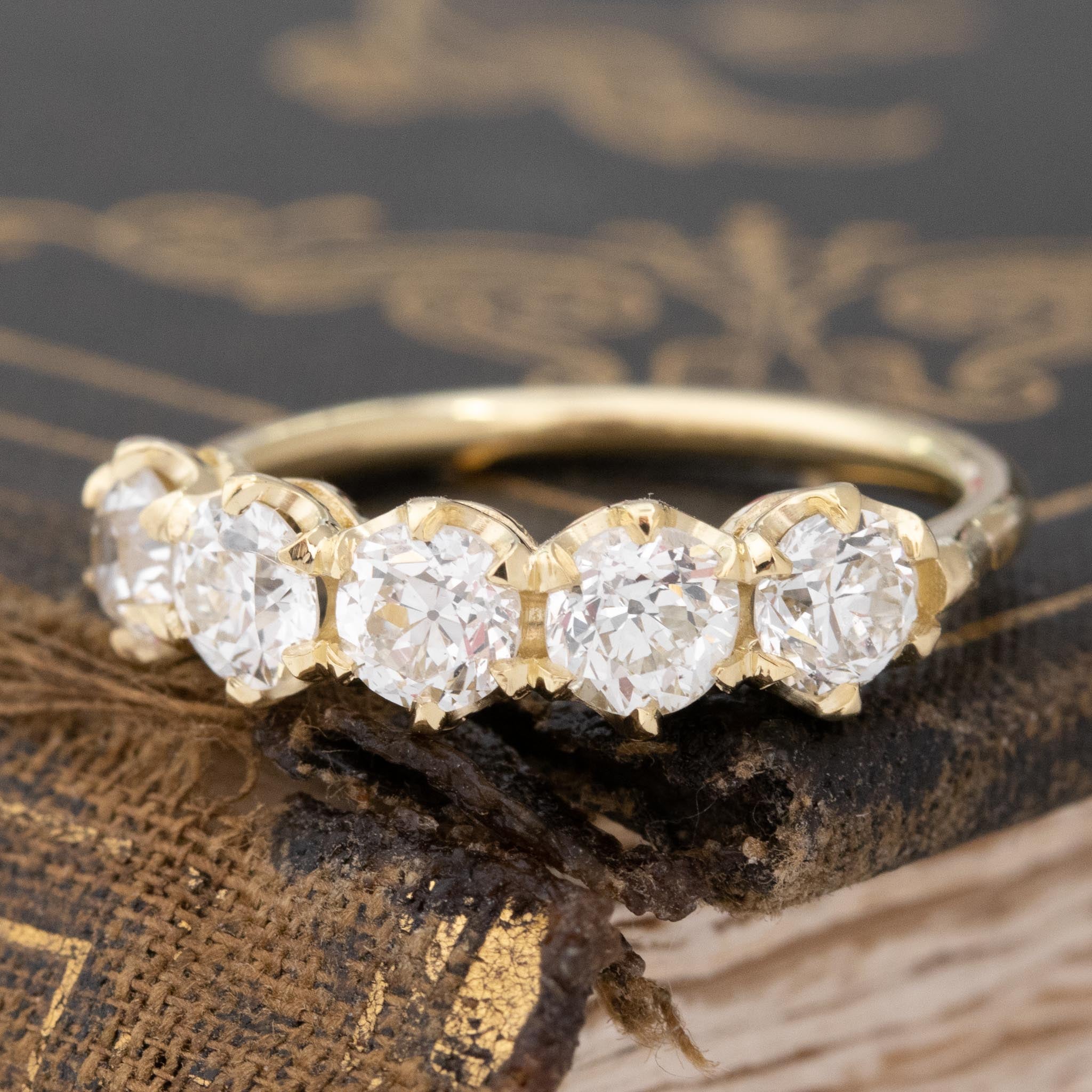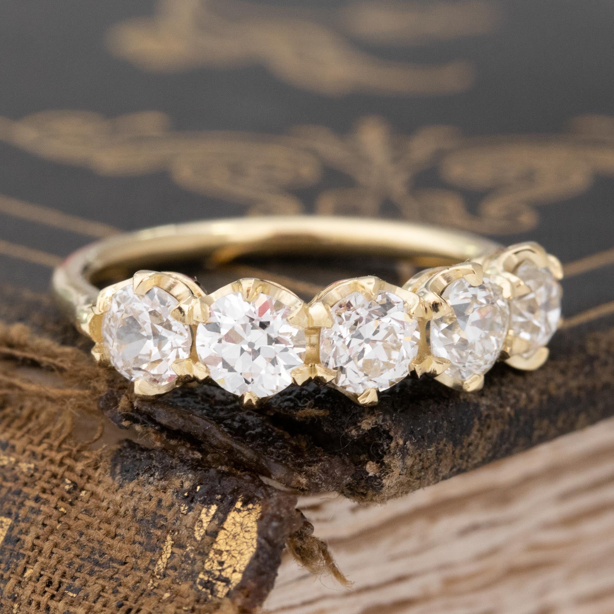 Modeled after antique diamond bands from the Georgian and Victorian eras, this 5-stone band is set with 5 chunky and charming old European cut diamonds in 18kt yellow gold! The diamonds are bright and sparkly and just looks so beautiful and elegant on the finger.