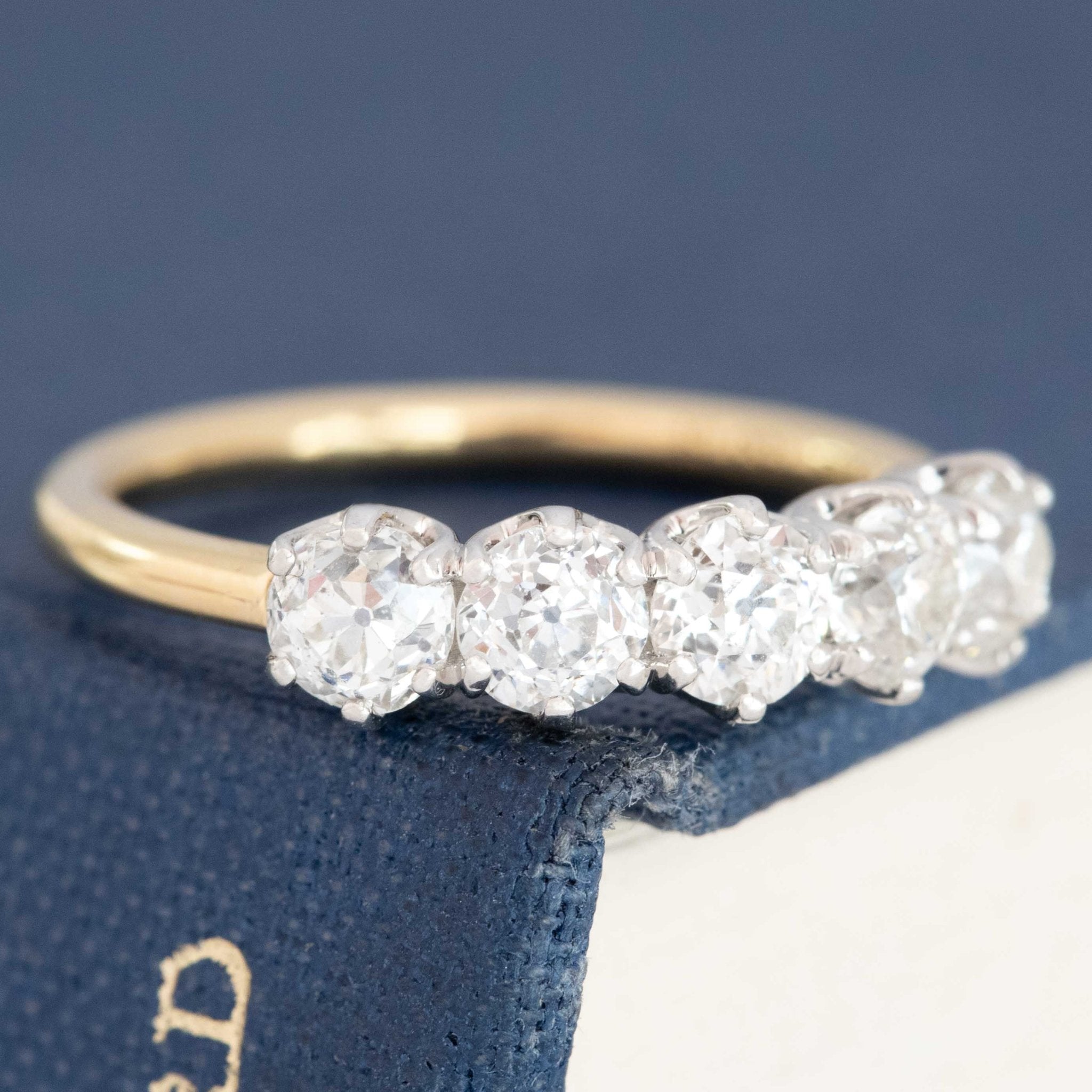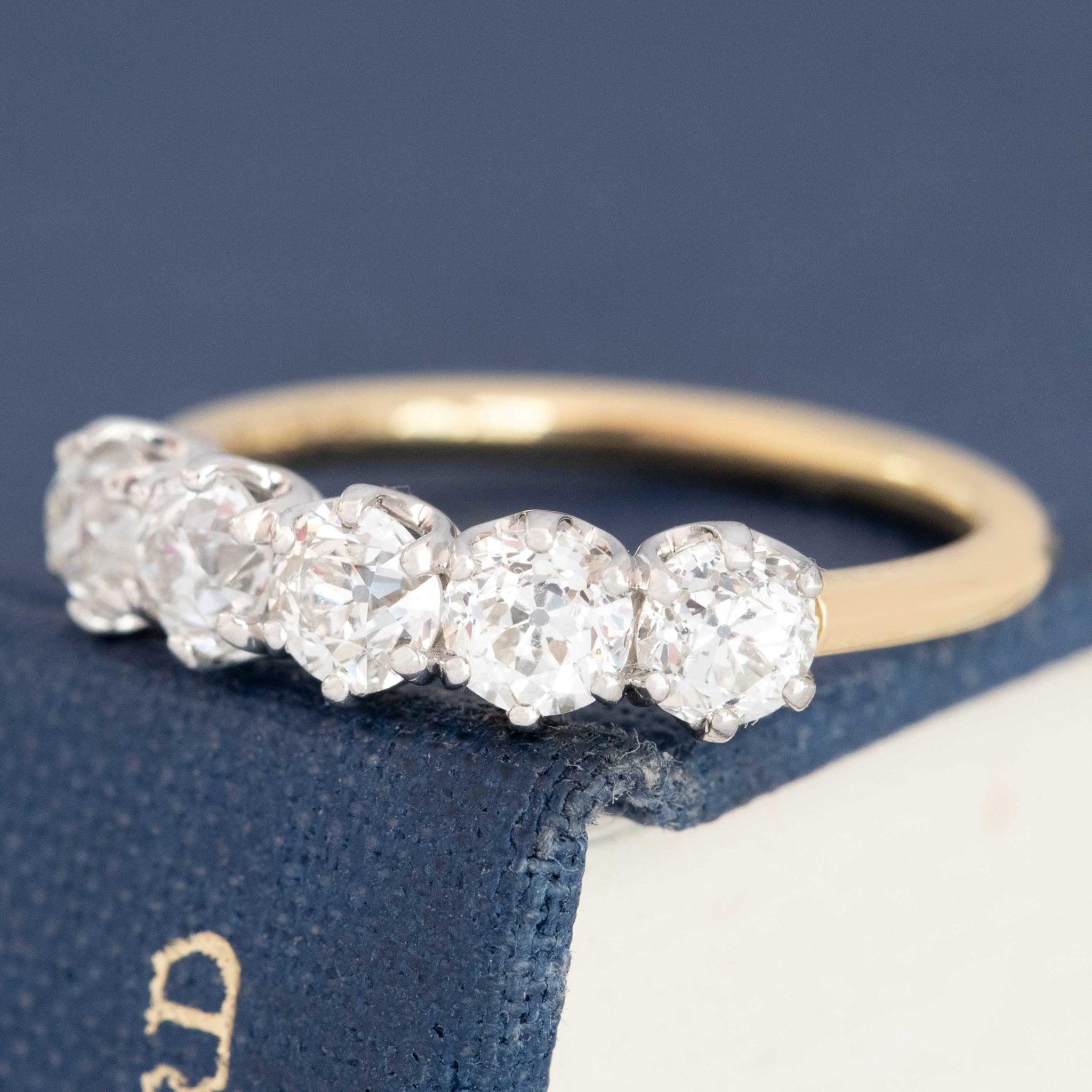Modeled after antique diamond bands from the Georgian and Victorian eras, this 5-stone band is set with 5 chunky and charming old European cut diamonds in a platinum gallery along a yellow gold shank. The diamonds are bright, sparkly, and just look so elegant on the finger. Easy to stack but just as beautiful when worn solo.