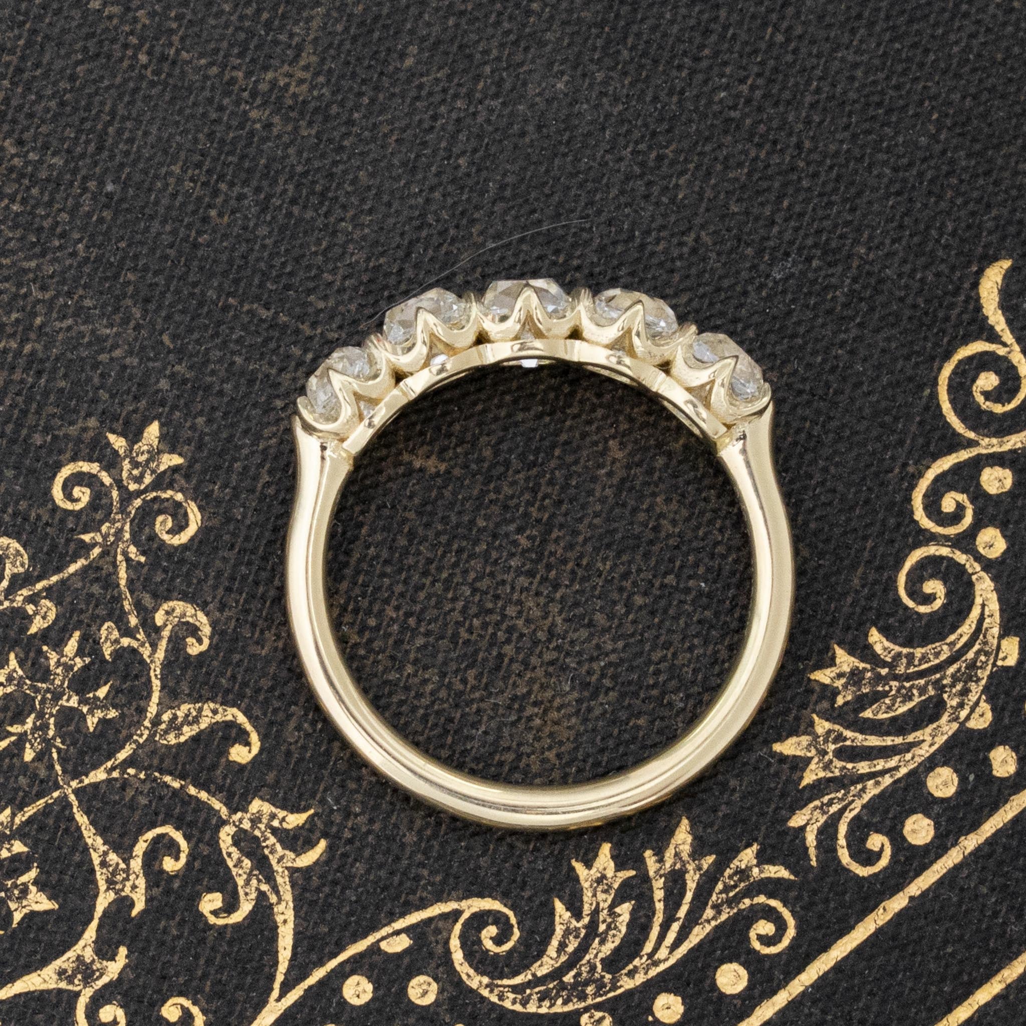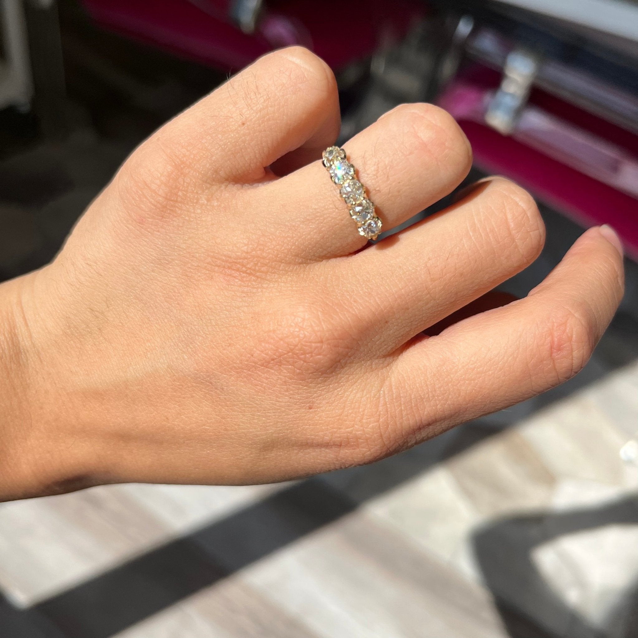 Modeled after antique diamond bands from the Georgian and Victorian eras, this 5-stone band is set with chunky and charming old mine cut diamonds in simple settings with swoopy, airy gallery details. The diamonds are bright and sparkly and just looks so beautiful and elegant on the finger. Our favorite bands by far!