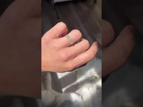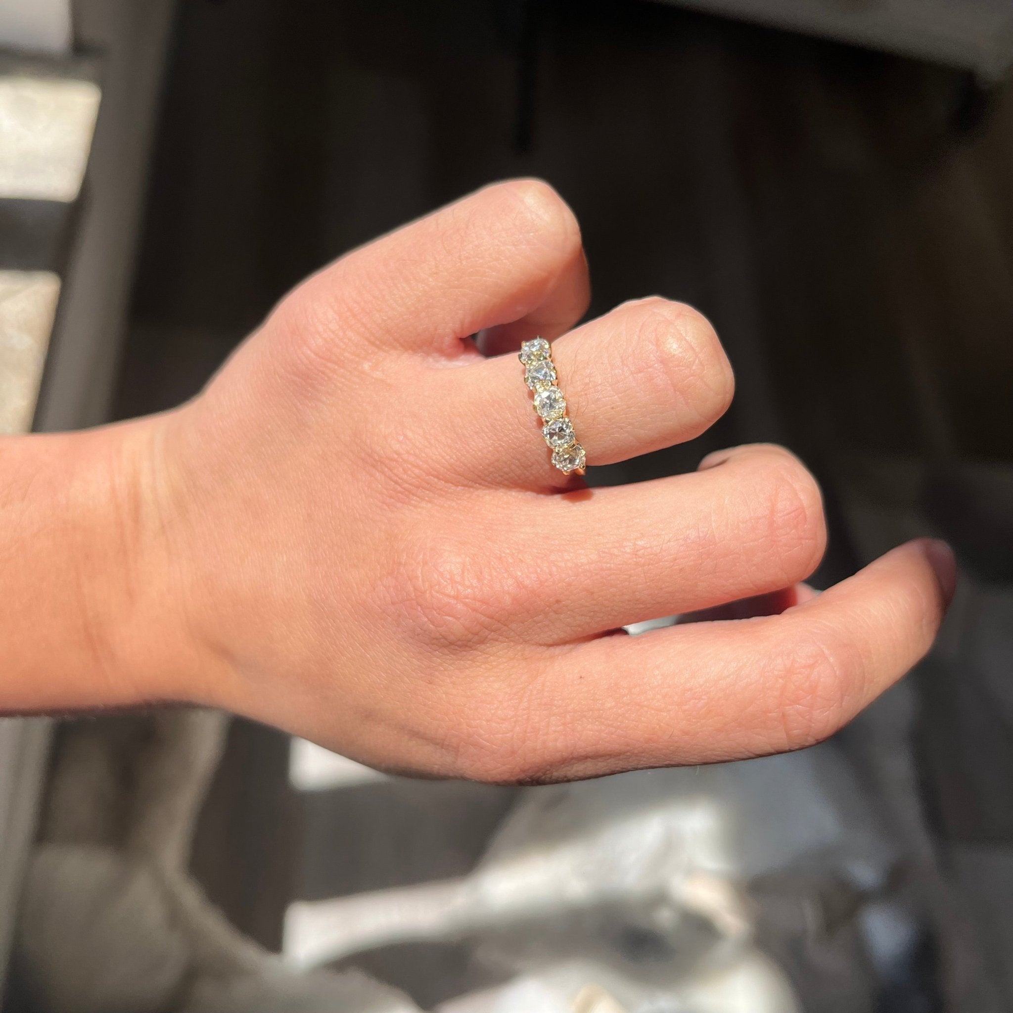 Modeled after antique diamond bands from the Georgian and Victorian eras, this 5-stone band is set with chunky and charming old mine cut diamonds in simple settings with swoopy, airy gallery details. The diamonds are bright and sparkly and just looks so beautiful and elegant on the finger. Our favorite bands by far!