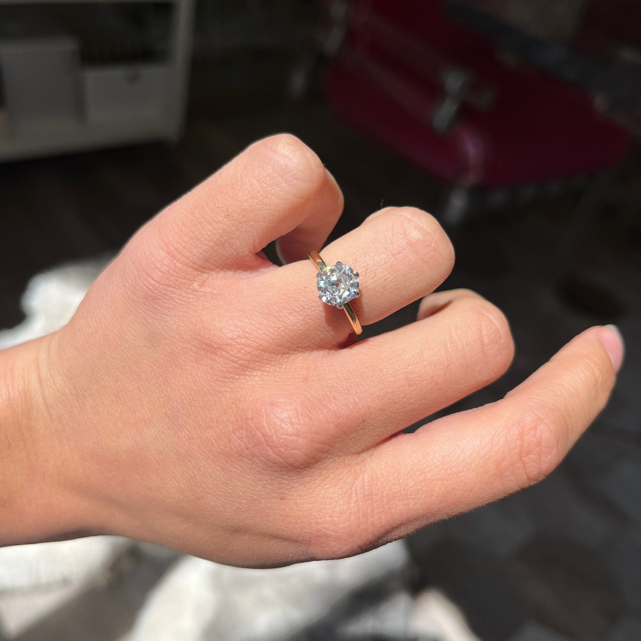 The stone itself is insanely white-facing, 100% eye-clean, and super prismatic in the light. We’ve set it in platinum in a 6 prong setting for a “floating on the finger” look - the yellow gold shank adds an element of color contrast without being too different. She’s got the classic cushion-y shape we all know and love, with plenty of chunky facets to boot.