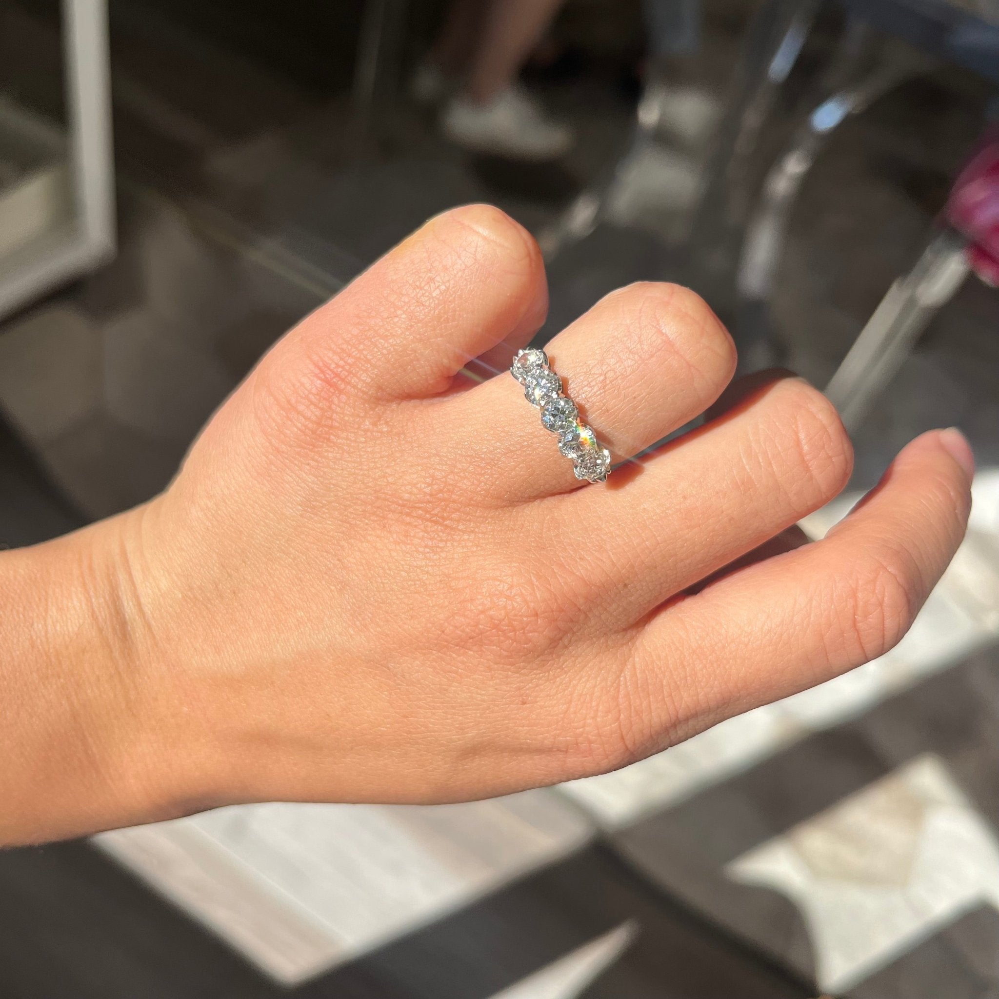 Modeled after antique diamond bands from the Georgian and Victorian eras, this 5-stone band is set with 5 chunky and charming old European cut diamonds in platinum. The diamonds are bright, sparkly, and just look so elegant on the finger. Easy to stack but just as beautiful when worn solo.