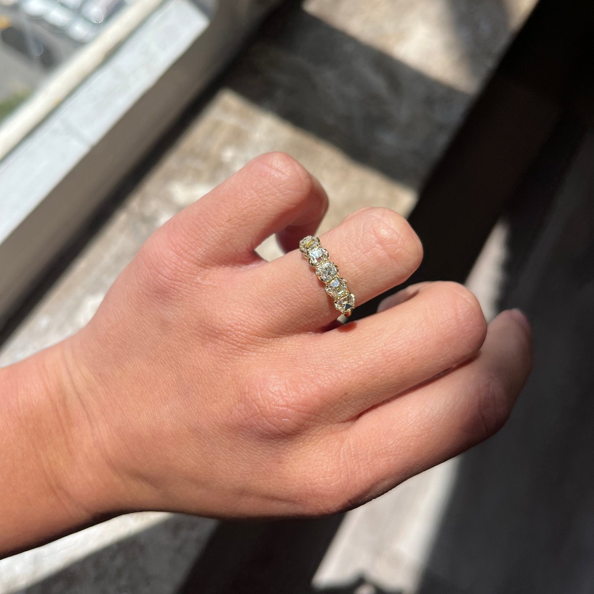 Modeled after antique diamond bands from the Georgian and Victorian eras, this 5-stone band is set with chunky and charming old mine cut diamonds in simple settings with swoopy, airy gallery details. The diamonds are bright and sparkly and just looks so beautiful and elegant on the finger. Our favorite bands by far!