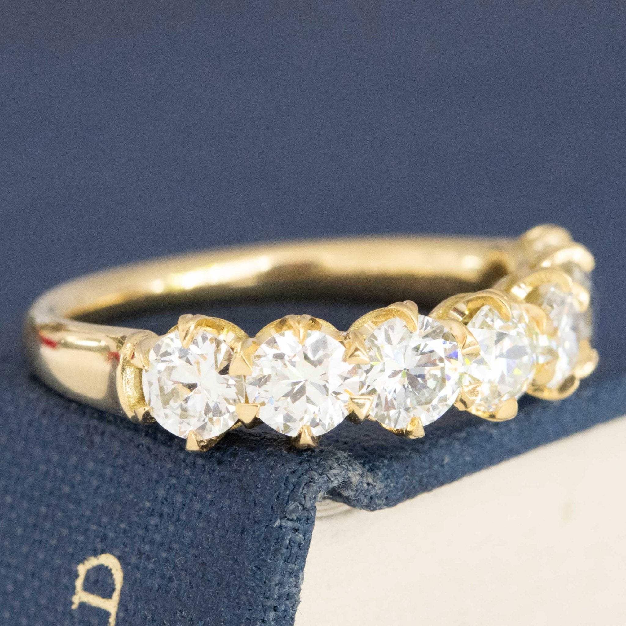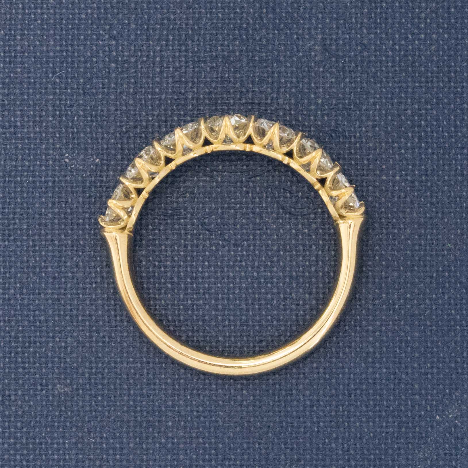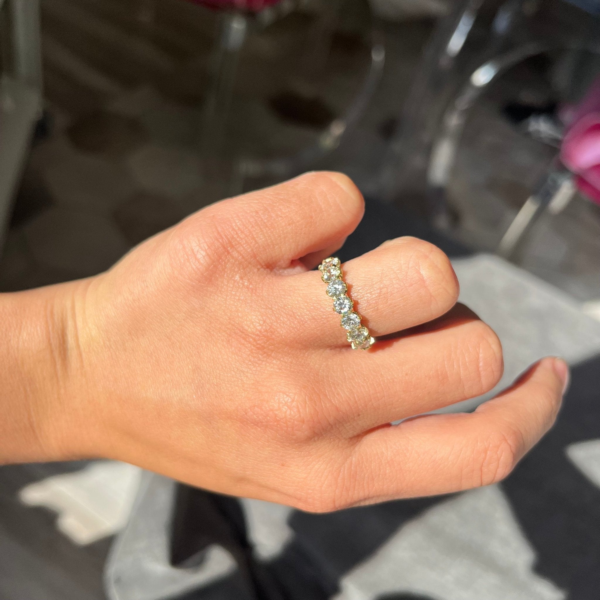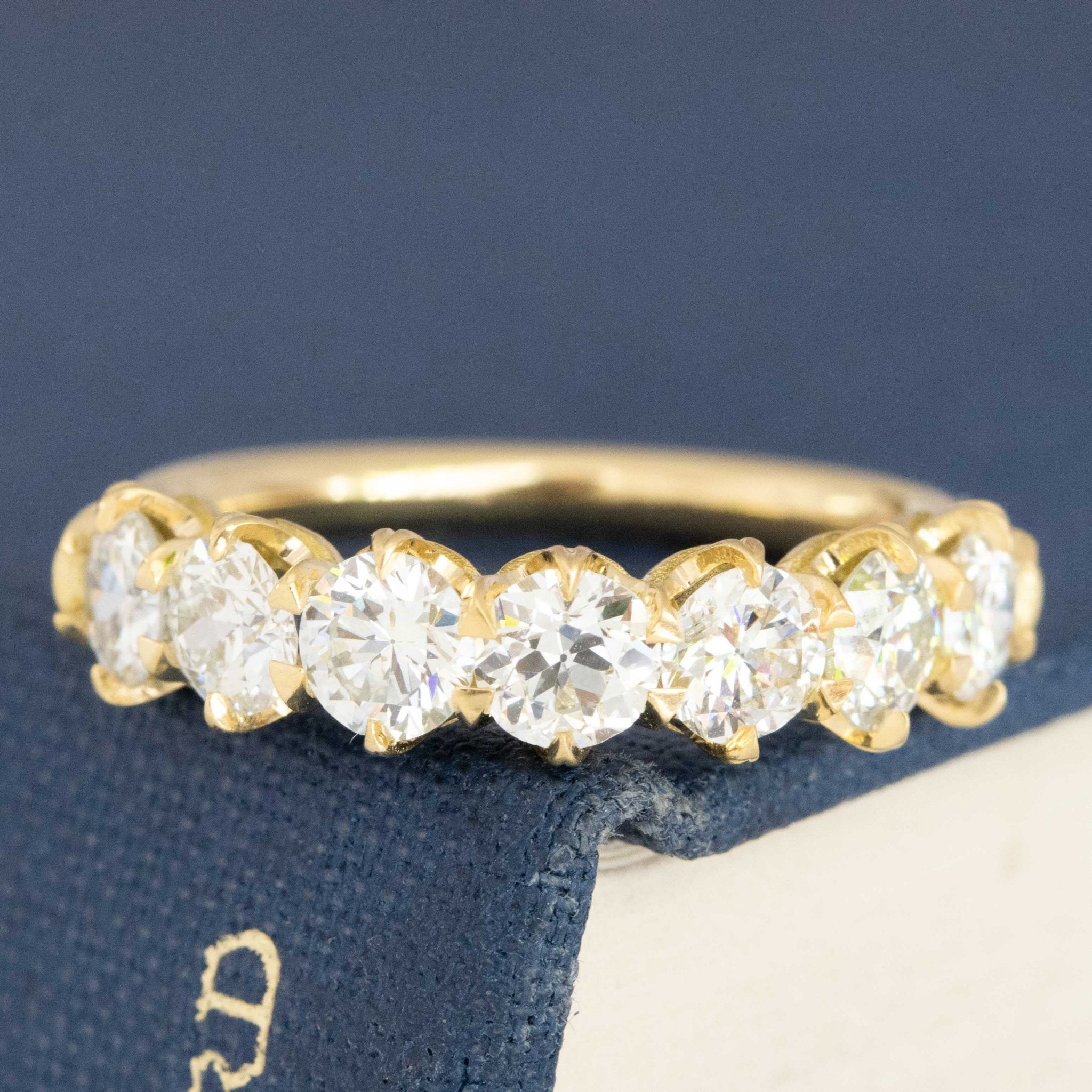 Modeled after antique diamond bands from the Georgian and Victorian eras, this 7-stone band is set with chunky and charming old European cut diamonds in yellow gold. The diamonds are bright, sparkly, and just look so elegant on the finger.