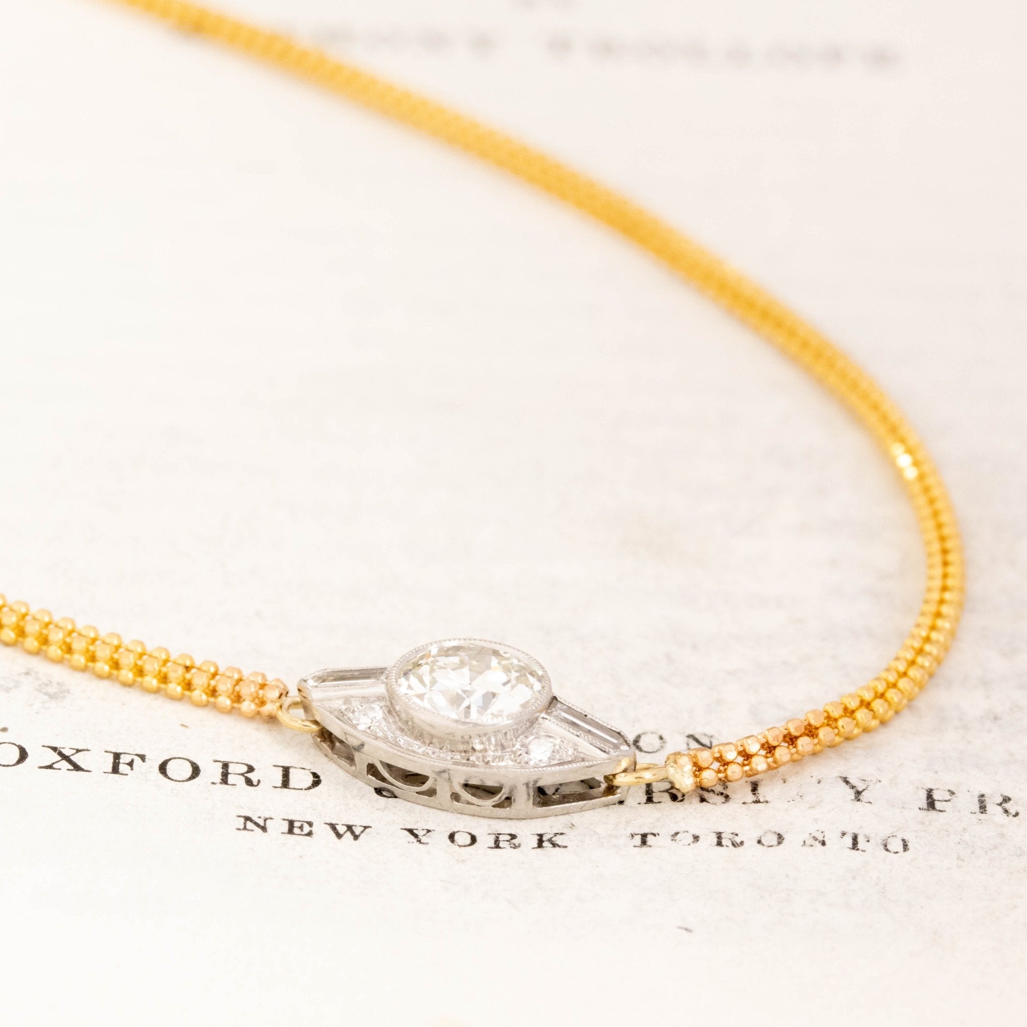 The contrast between the rich high karat gold and the diamond in platinum is stark - making for a great pop of color. We purposely set the diamond component so that it sits on the side of the neck, much like they were worn over a century ago.