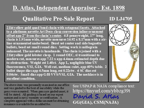 We took our beautiful art deco era diamond clasp and attached her to a high karat double bead antique chain - the result? A diamond pendant that is stunning in every way - melding 2 eras into one contemporary jewel that can be worn day and night, with a tee shirt or a little black dress.