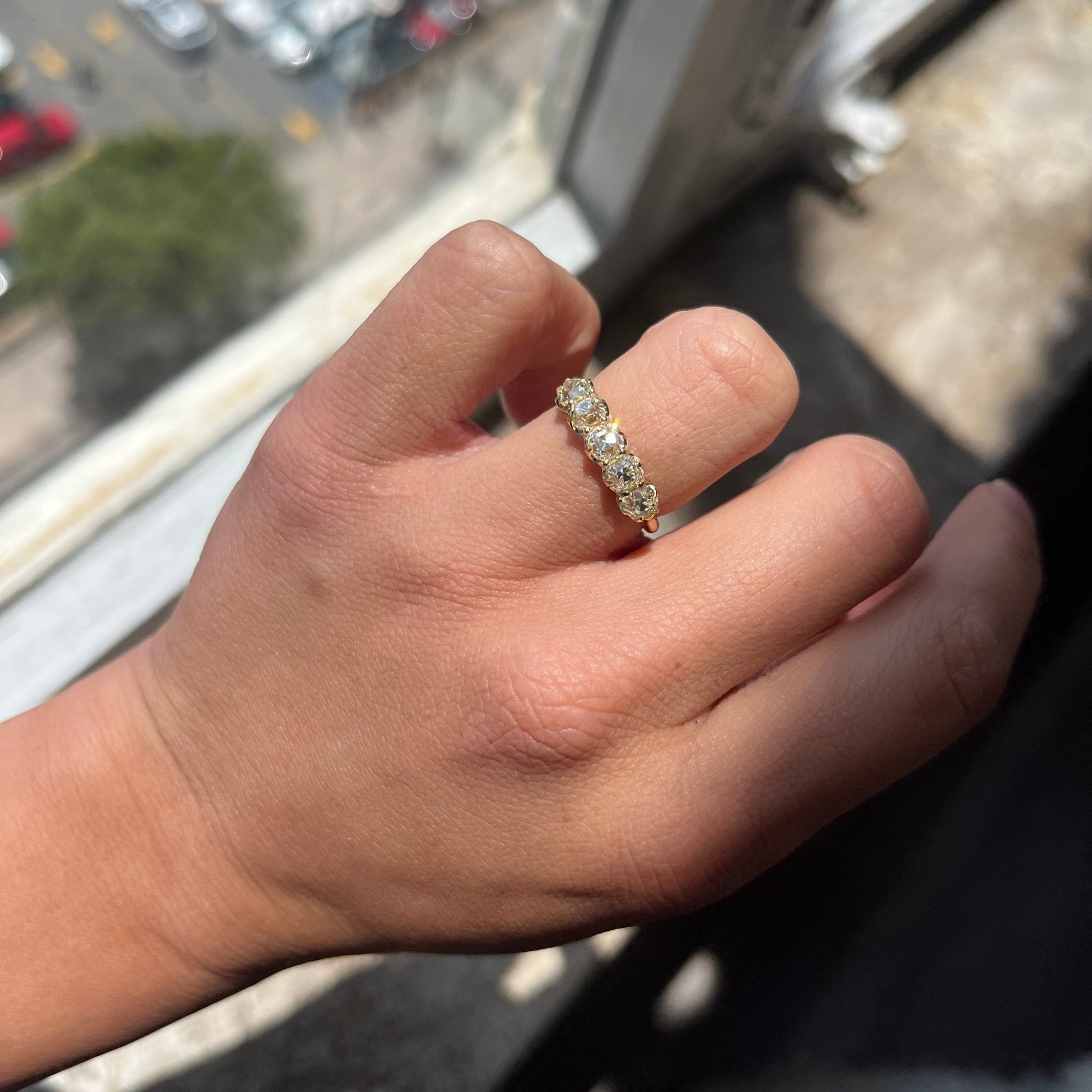 Modeled after antique diamond bands from the Georgian and Victorian eras, this 5-stone band is set with chunky and charming old mine cut diamonds in simple settings with swoopy, airy gallery details. The diamonds are bright and sparkly and just looks so beautiful and elegant on the finger. Our favorite bands by far!