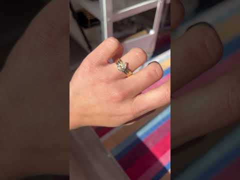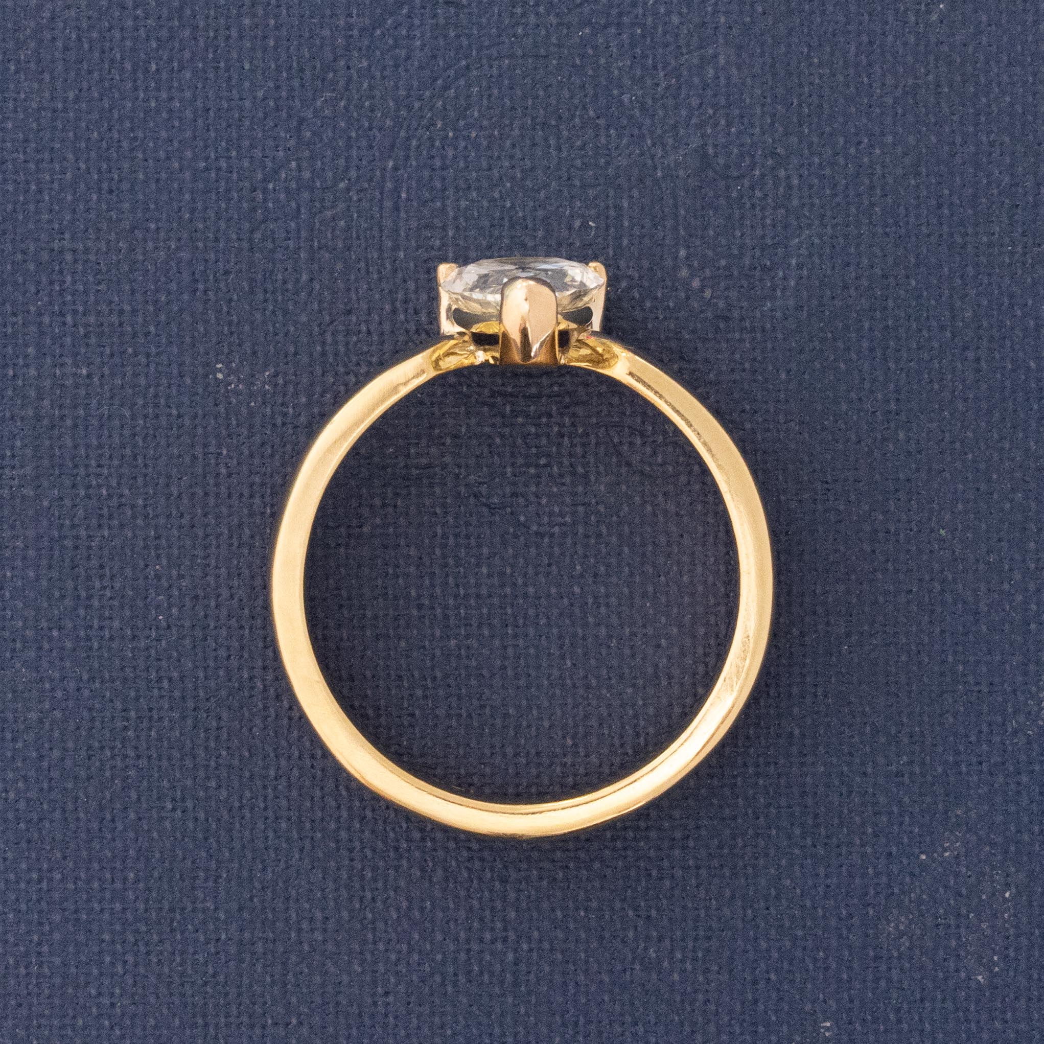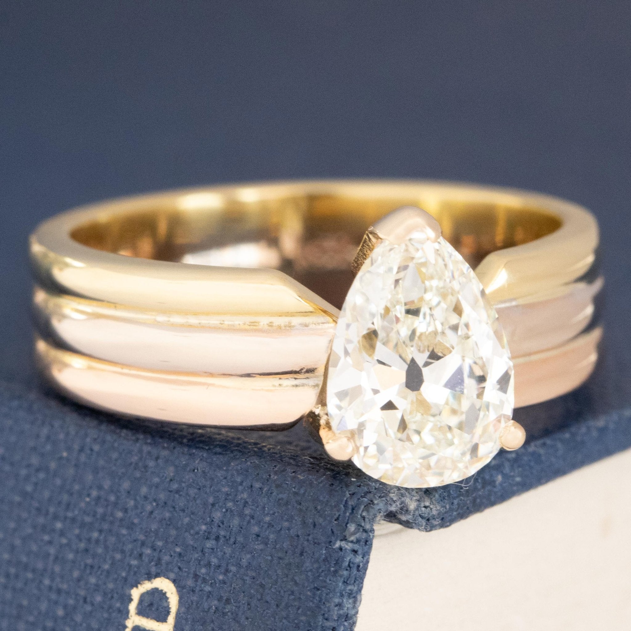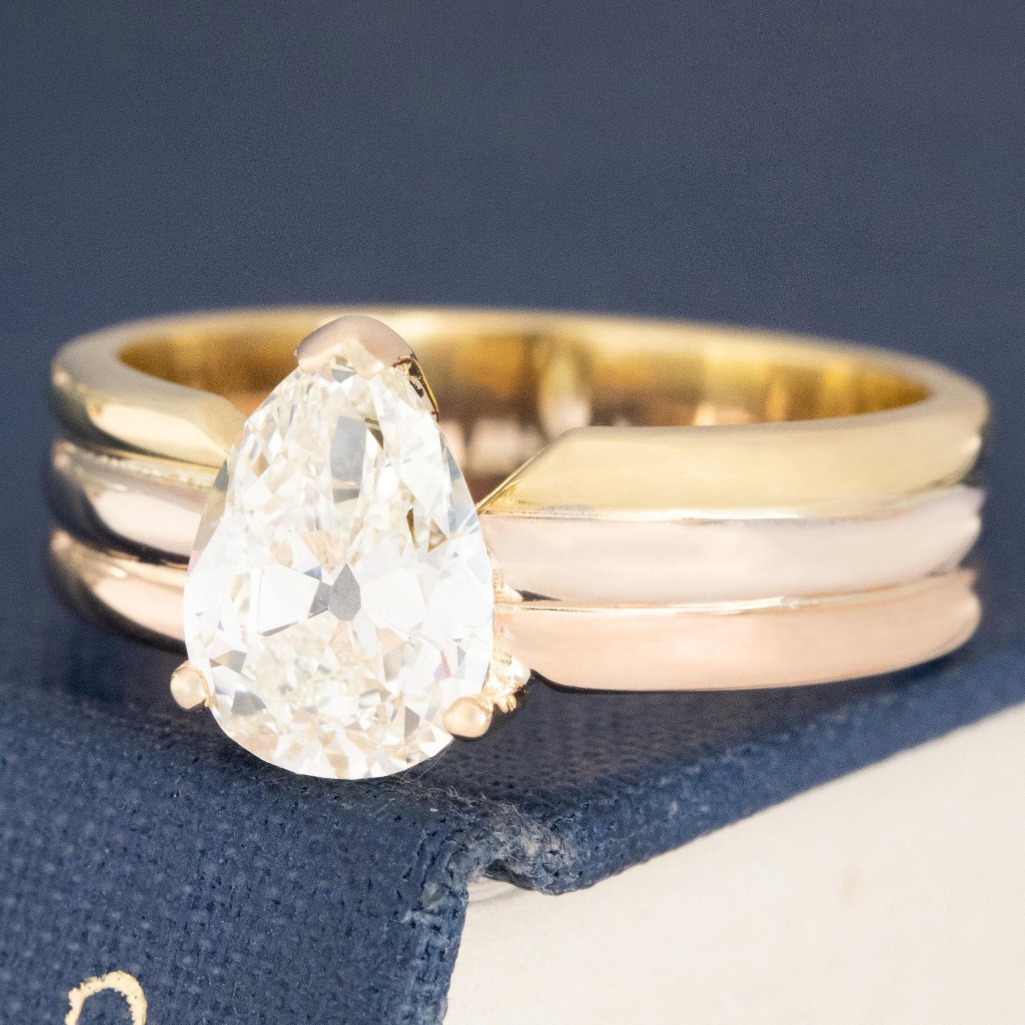 This vintage triple-tone mounting came to us separate from the center stone, but we find them to be an absolute match made in heaven! A wider band which tapers and pinches in at the shoulders, a spready vintage pear cut diamond sits in the front with so much prismatic light play. She's a GIA L color which reads as a cool ivory on the hands, especially when surrounded by those different gold colors. The stone gives you a near-2ct look at that weight and measurements, and in tandem with the stone's specs, makes her a great value.