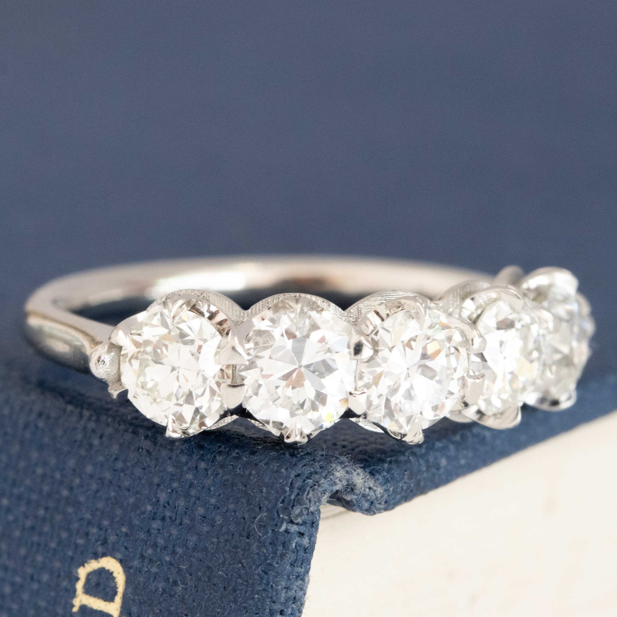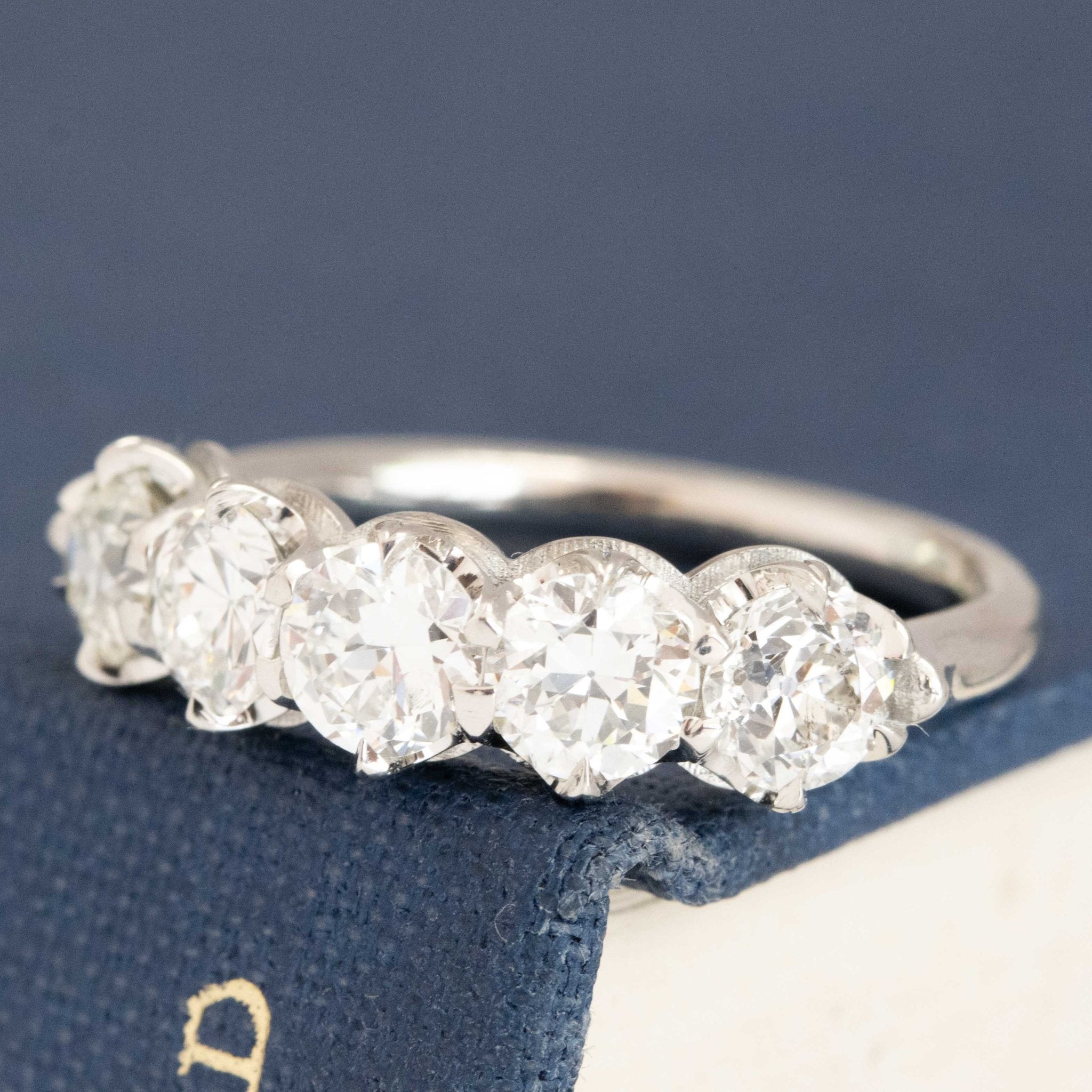 Modeled after antique diamond bands from the Georgian and Victorian eras, this 5-stone band is set with 5 chunky and charming old European cut diamonds in platinum. The diamonds are bright, sparkly, and just look so elegant on the finger. Easy to stack but just as beautiful when worn solo.