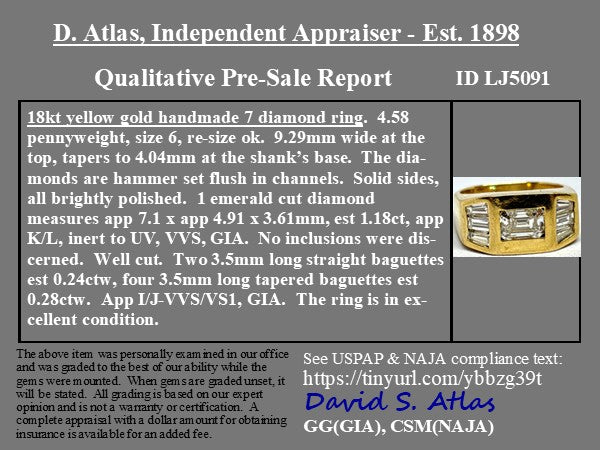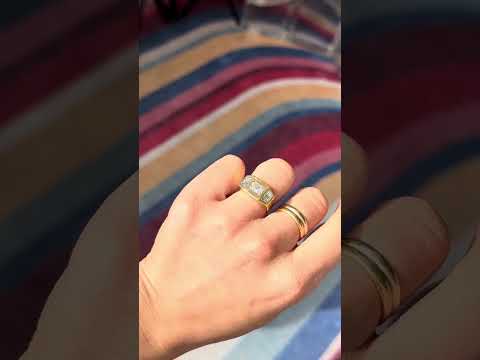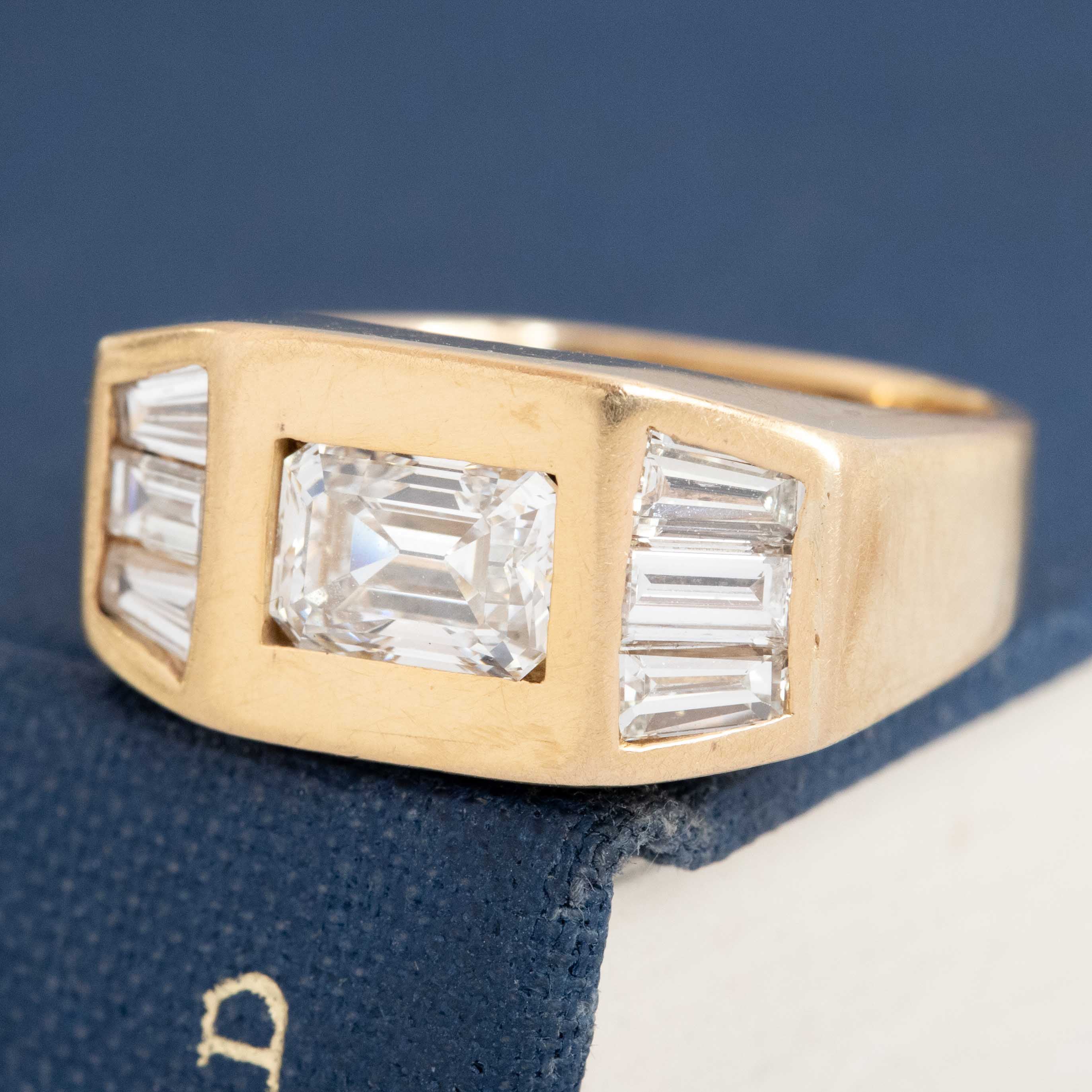 A chunky and bold step cut diamond ring - with a geometric form crafted in solid 18kt gold! The diamonds (baguettes, tapered baguettes, and an emerald cut center) are flush set in a faceted top section of the ring, which is set quite low and therefore comfortably on the hand. The sparkle on the diamonds is unique and hall-of-mirrors-like, and the width of the gold ring wears like a cigar band. All the good things!