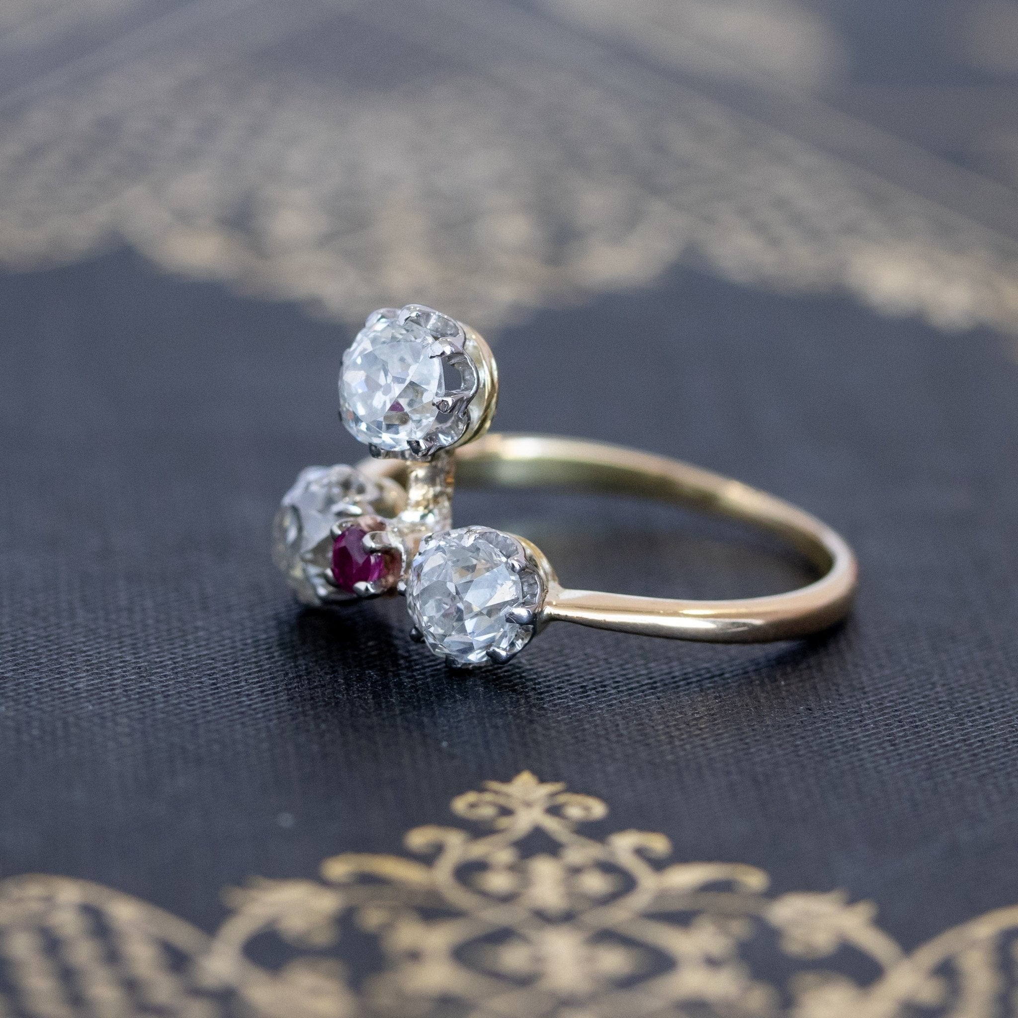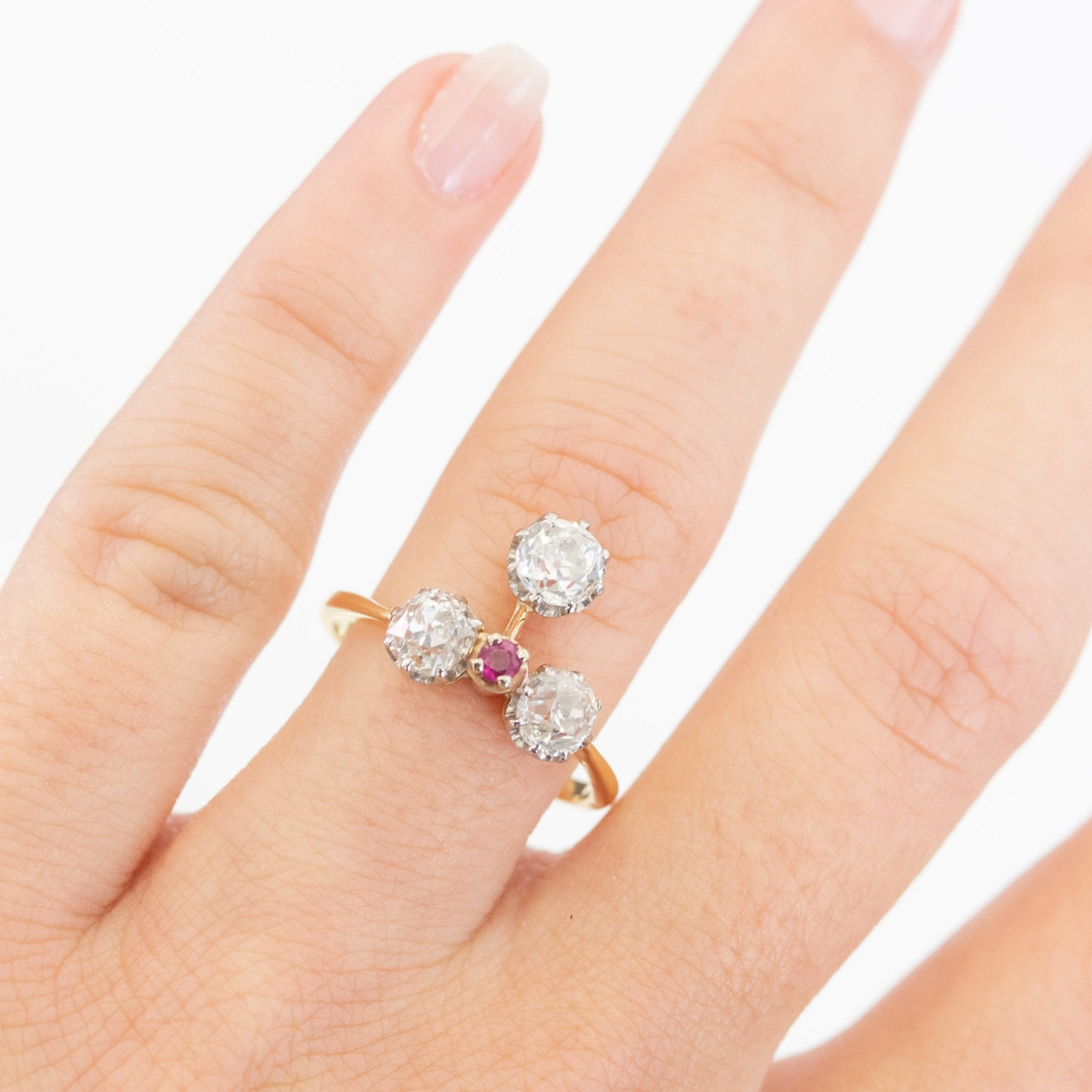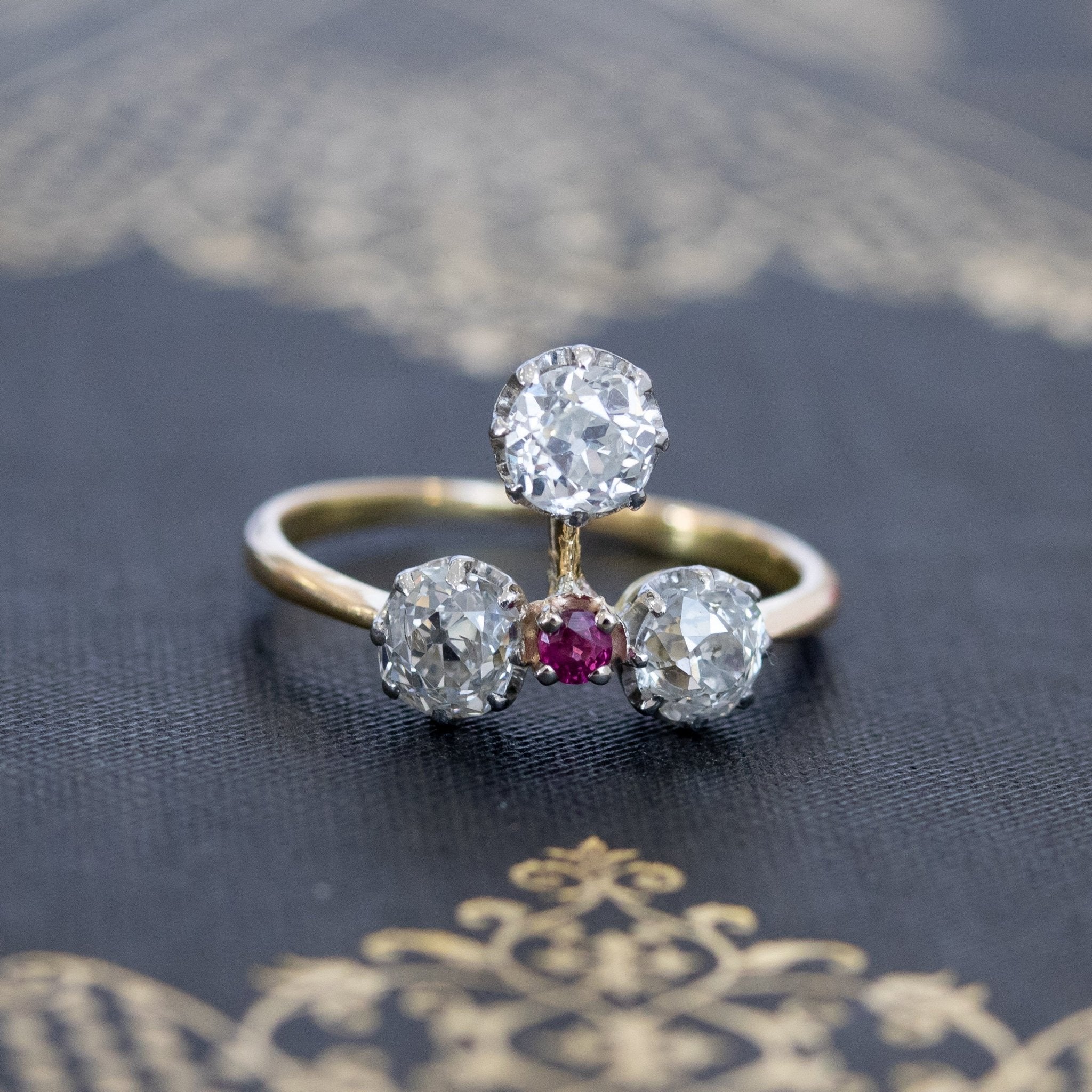 Another super charming ring - a French number set with the juiciest old mine cut diamonds in a triangular formation, accented by a rich, red ruby in the center. The old cut diamonds are big and juicy, with so much charm! With French hallmarks.