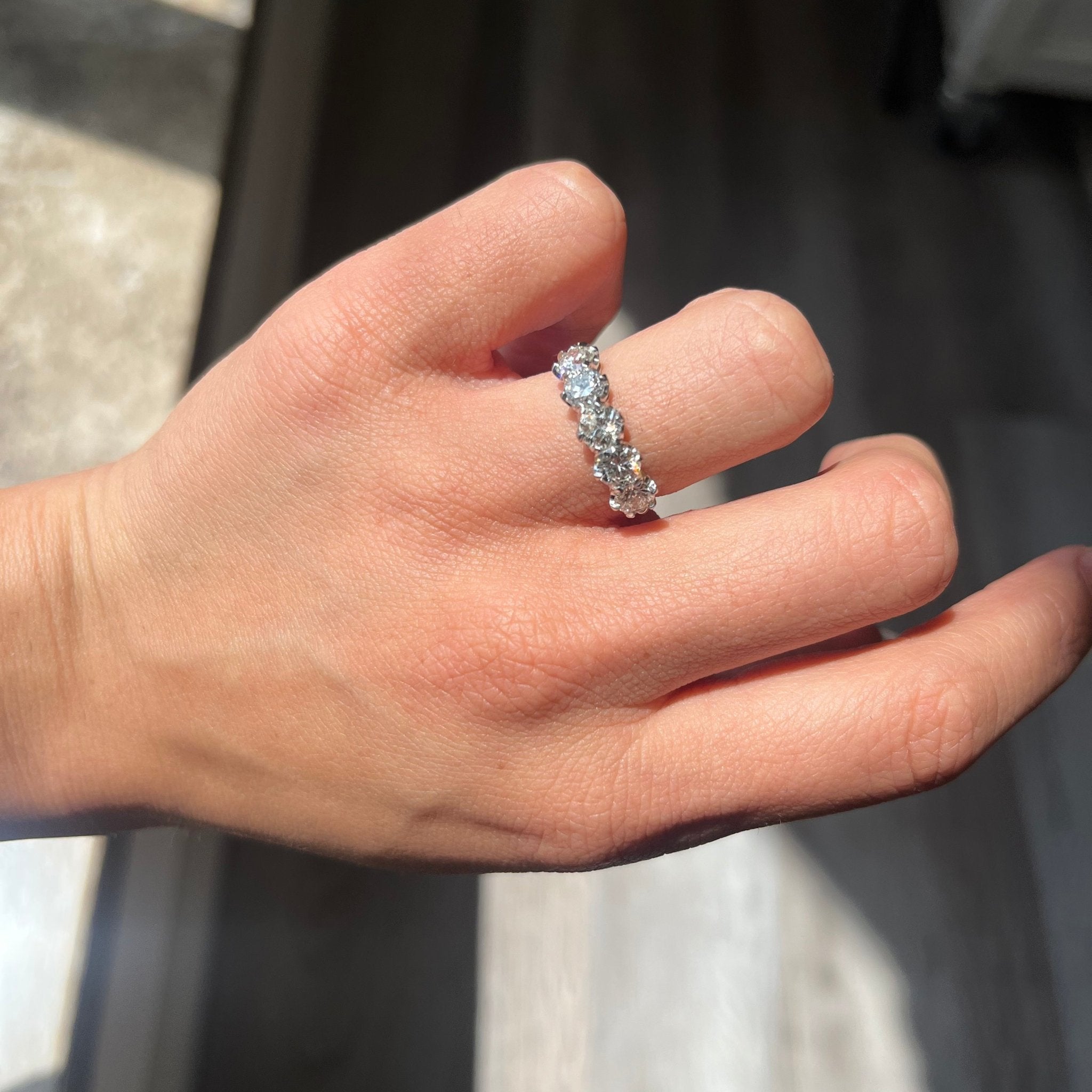 Modeled after antique diamond bands from the Georgian and Victorian eras, this 5-stone band is set with 5 chunky and charming old European cut diamonds in Platinum! The diamonds are bright and sparkly and just looks so beautiful and elegant on the finger.