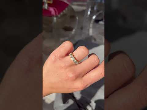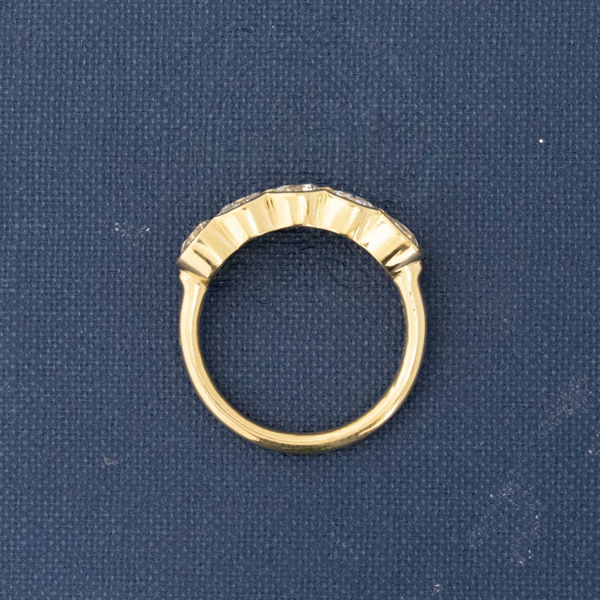 A sweet bezel band with recycled Old Euro cut diamonds which sit side-by-side (kissing, if you will). The diamonds are so fiery and playful in the light, we are quite taken with how they spread along the top of the finger. Bright and sparkly, with so much character.