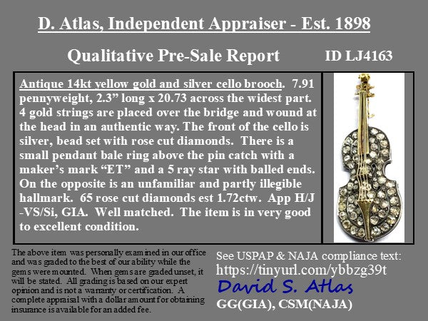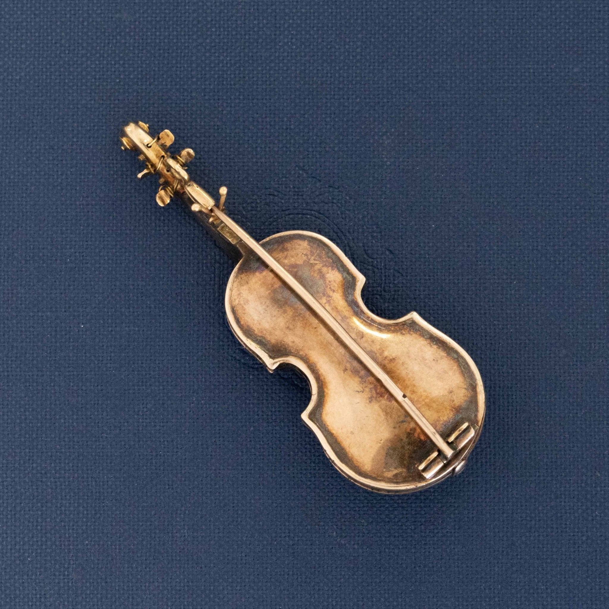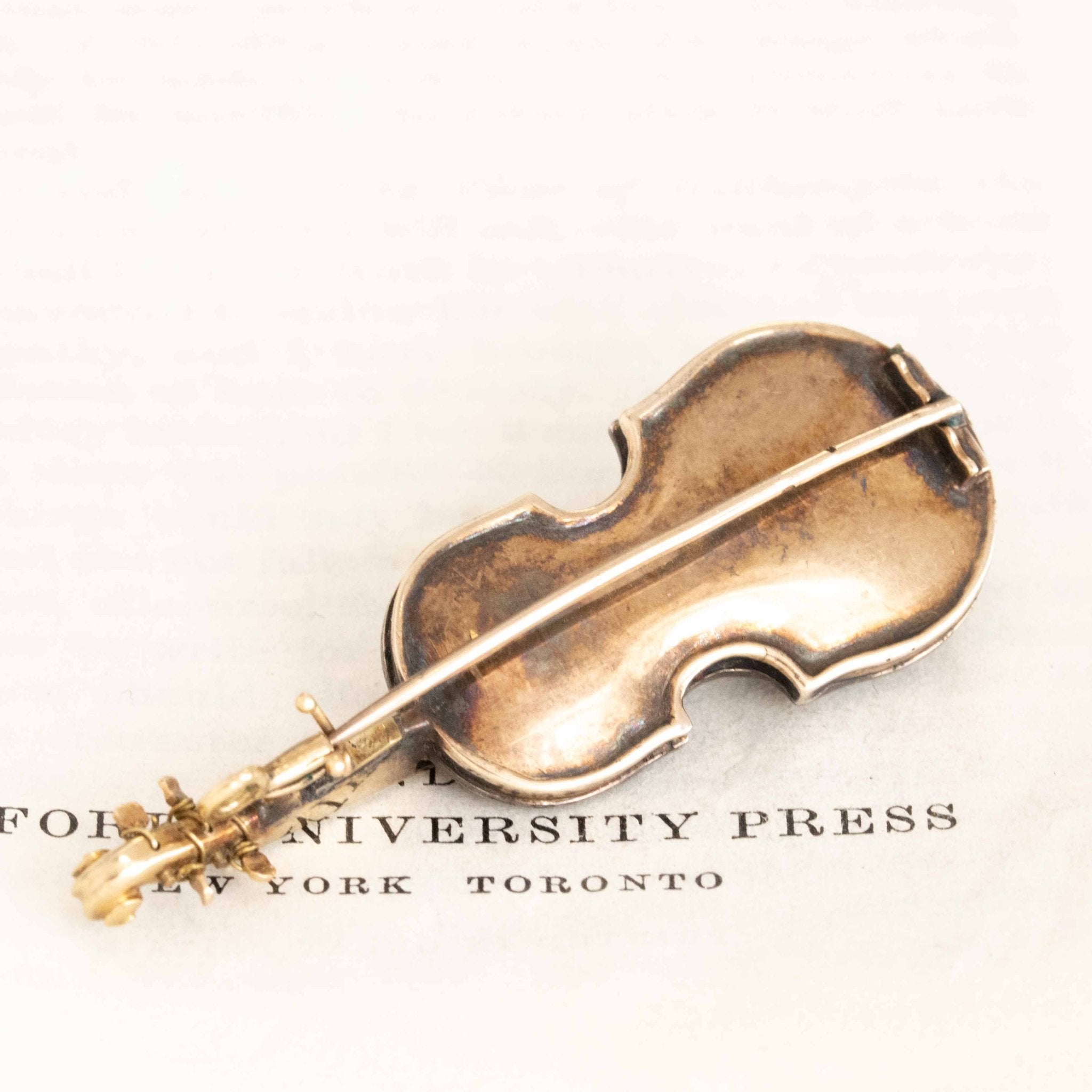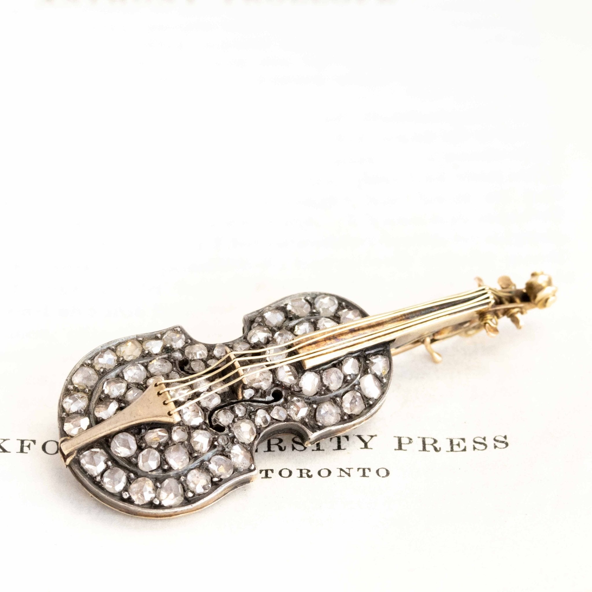 This charming antique cello brooch is one of those pieces with such incredible make, you're surprised to find that it doesn't actually function like a real cello! In silver-topped gold, the body of the instrument is covered in rustic rose cut diamonds and the most delicious dark patina. We love the presence this baby has when worn, perfect for the music lover in your life. With a preference for the string section, of course.