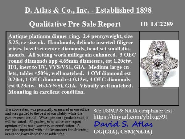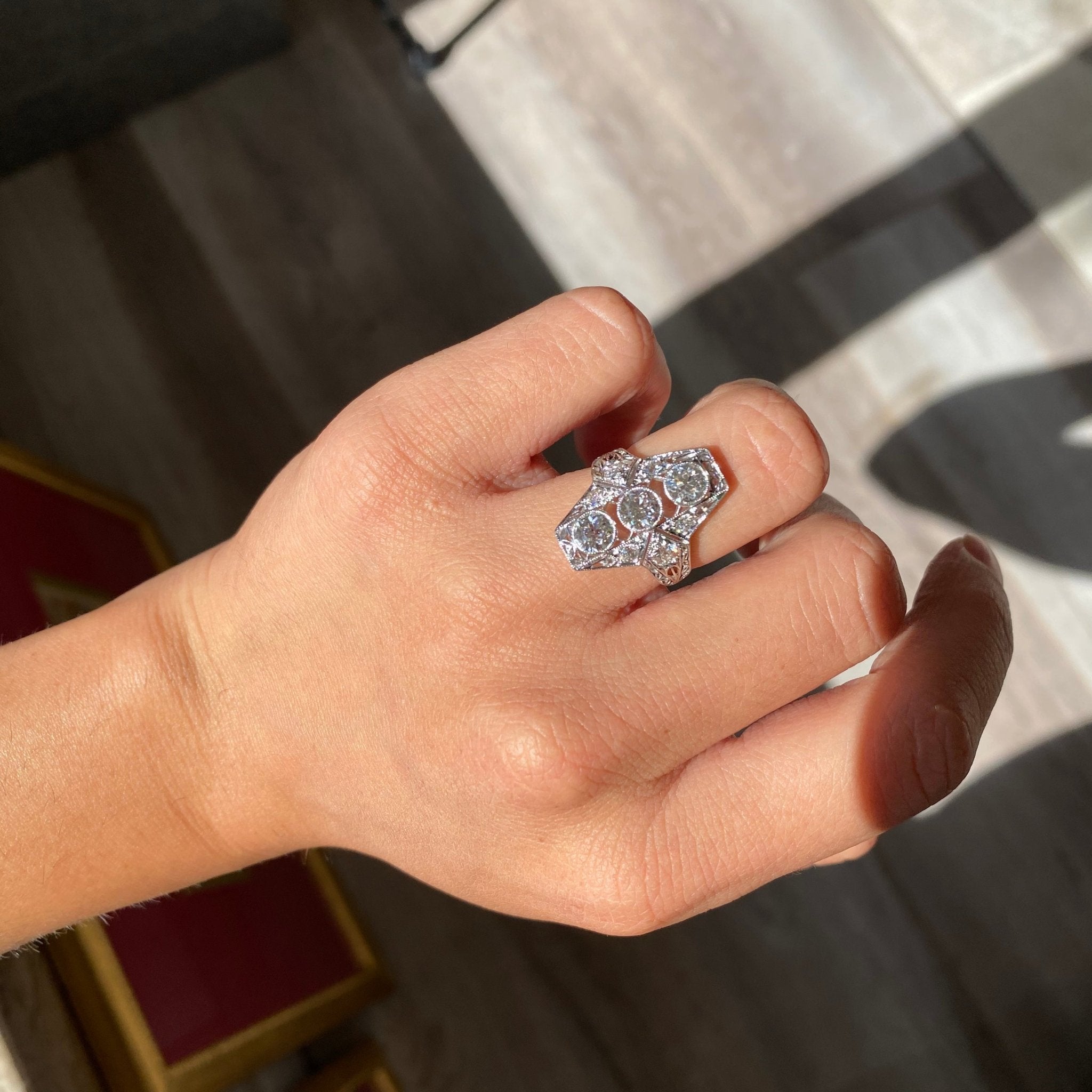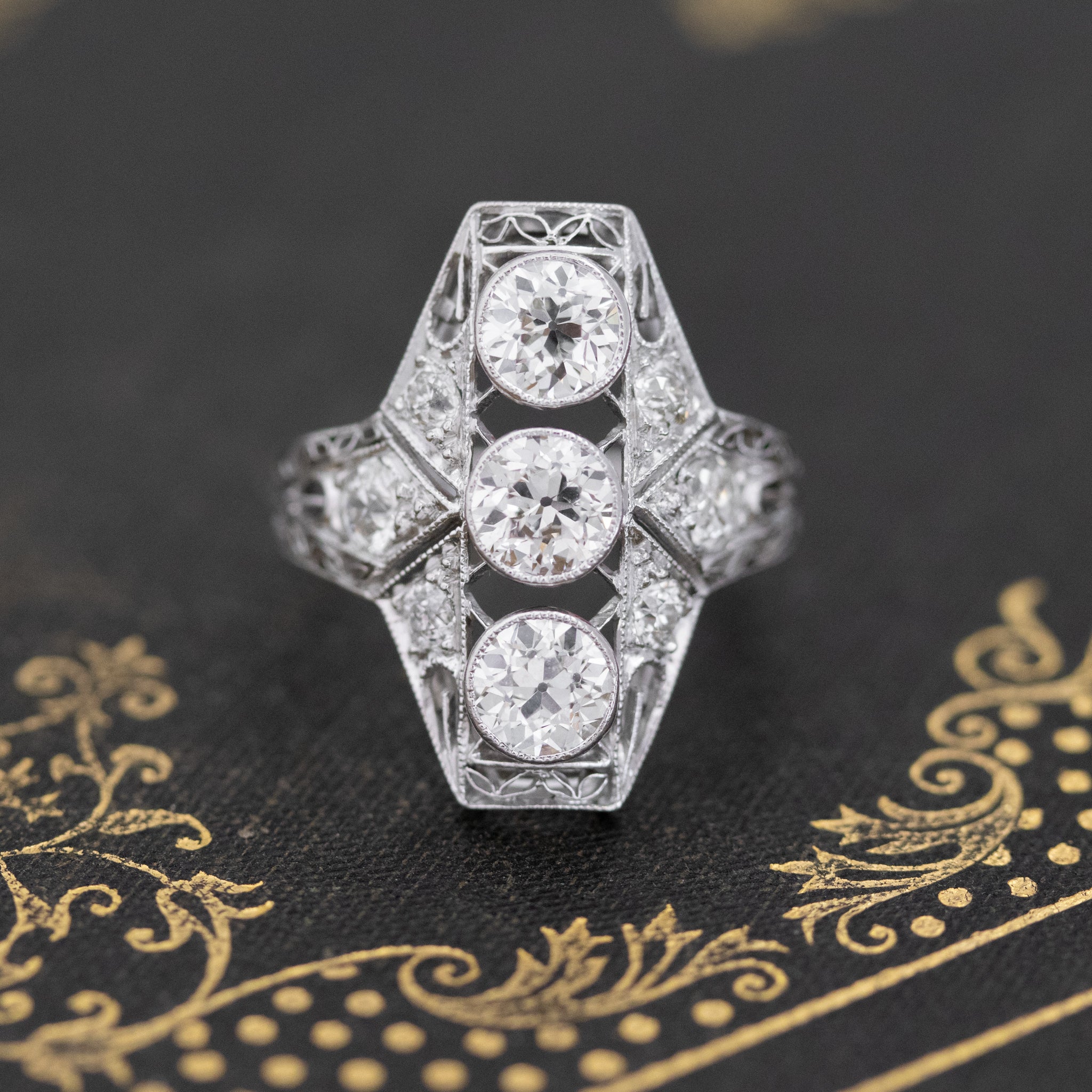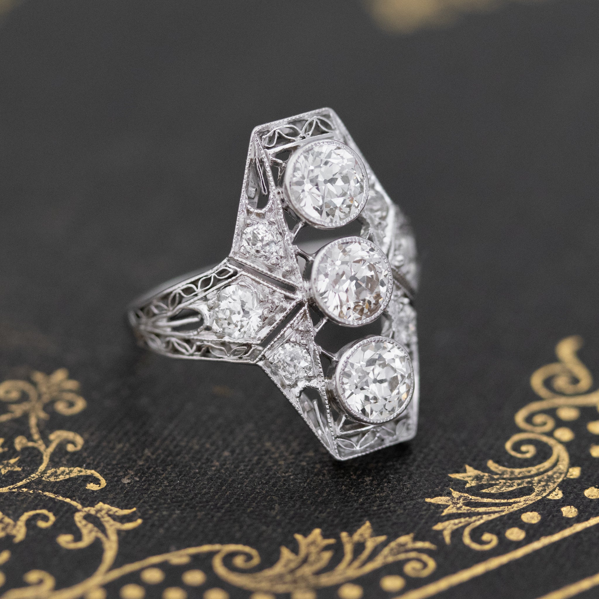 An antique diamond dinner ring with the most delicate, ornate, and beautiful handmade filigree! The three Old Euros that span the finger are absolutely delightful - playful in the light and super prismatic. We love a good dinner ring here at JbyG, especially one with such gorgeous detail. The filigree is swoopy and geometric at the same time, making for a ring that has chock full of detail and charm from every angle.