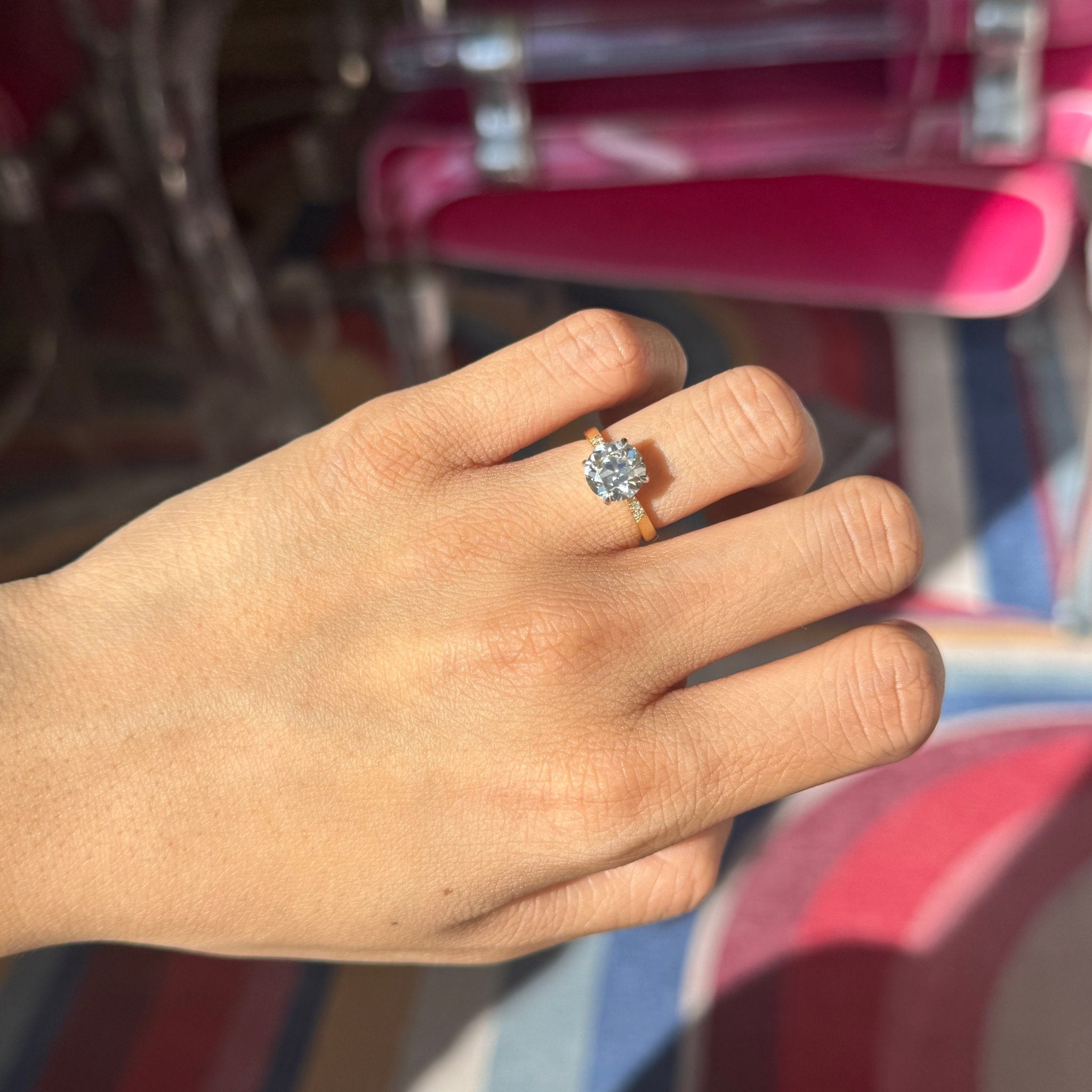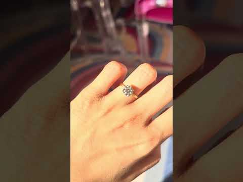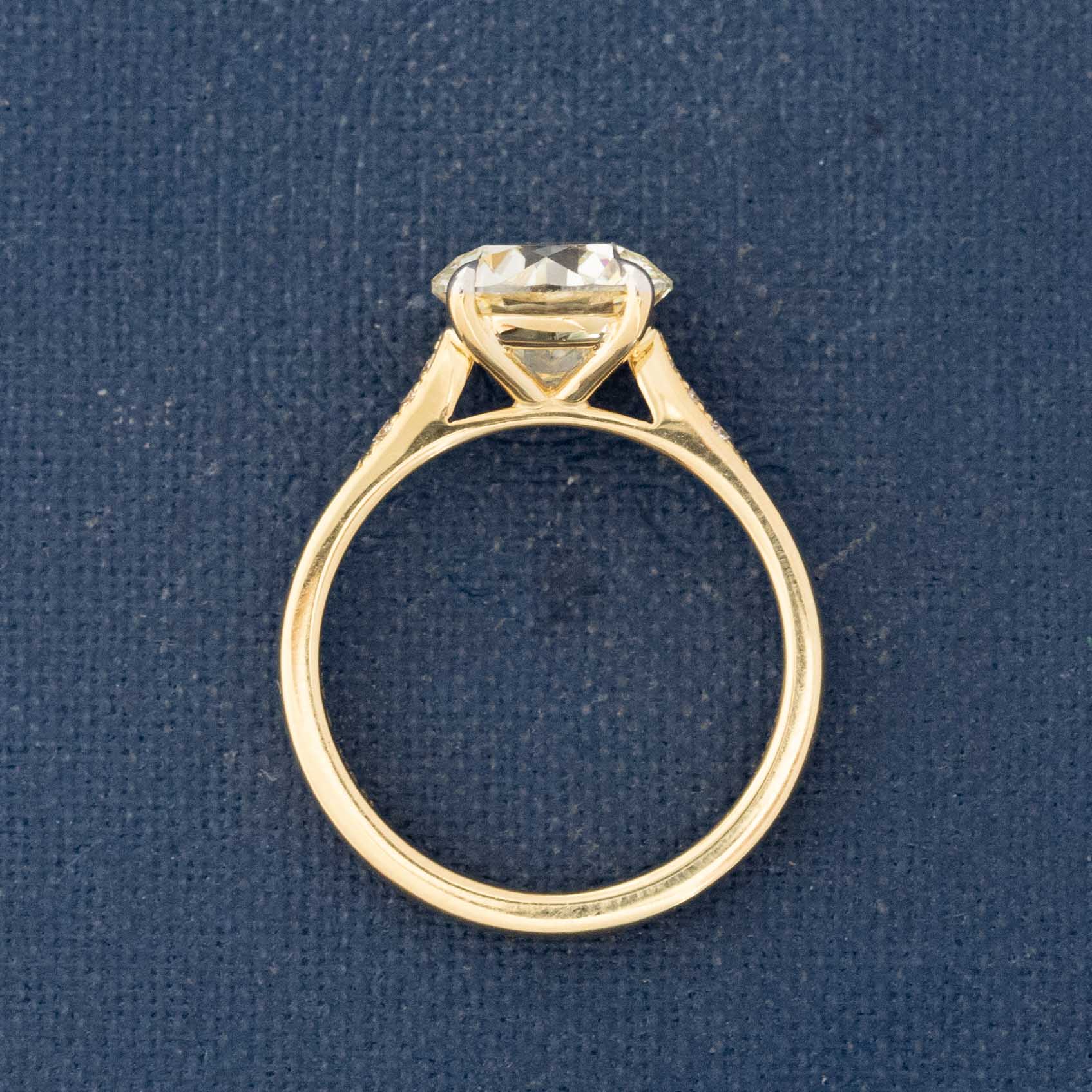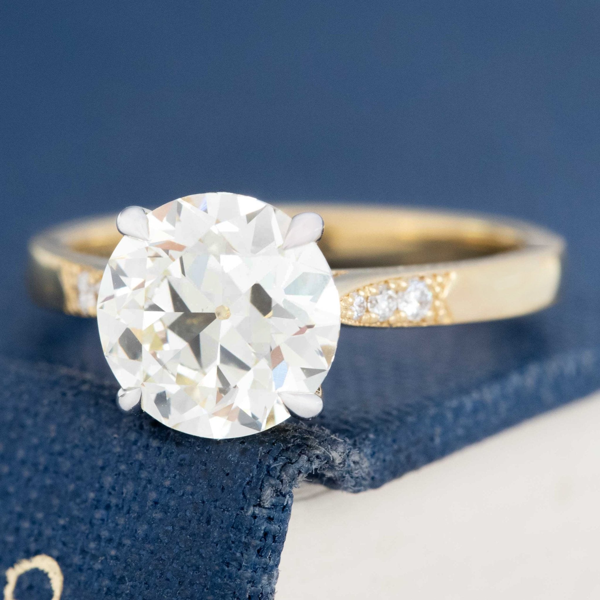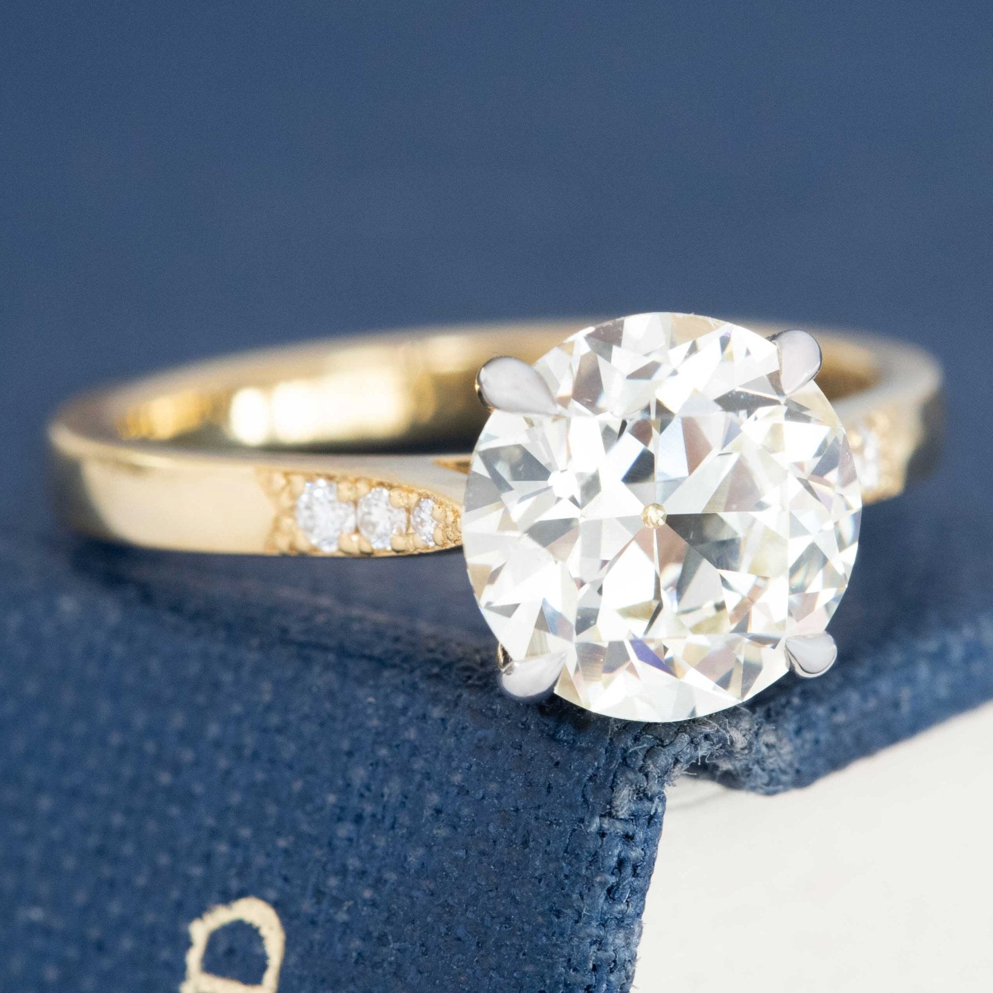 Can we say timeless? A beautiful old European cut diamond - a later cut OEC with killer faceting - is set in 18kt yellow gold, with pave set shoulders which showcase the center diamond beautifully. Just a most perfect engagement ring which would also allow a wedding band to sit close.