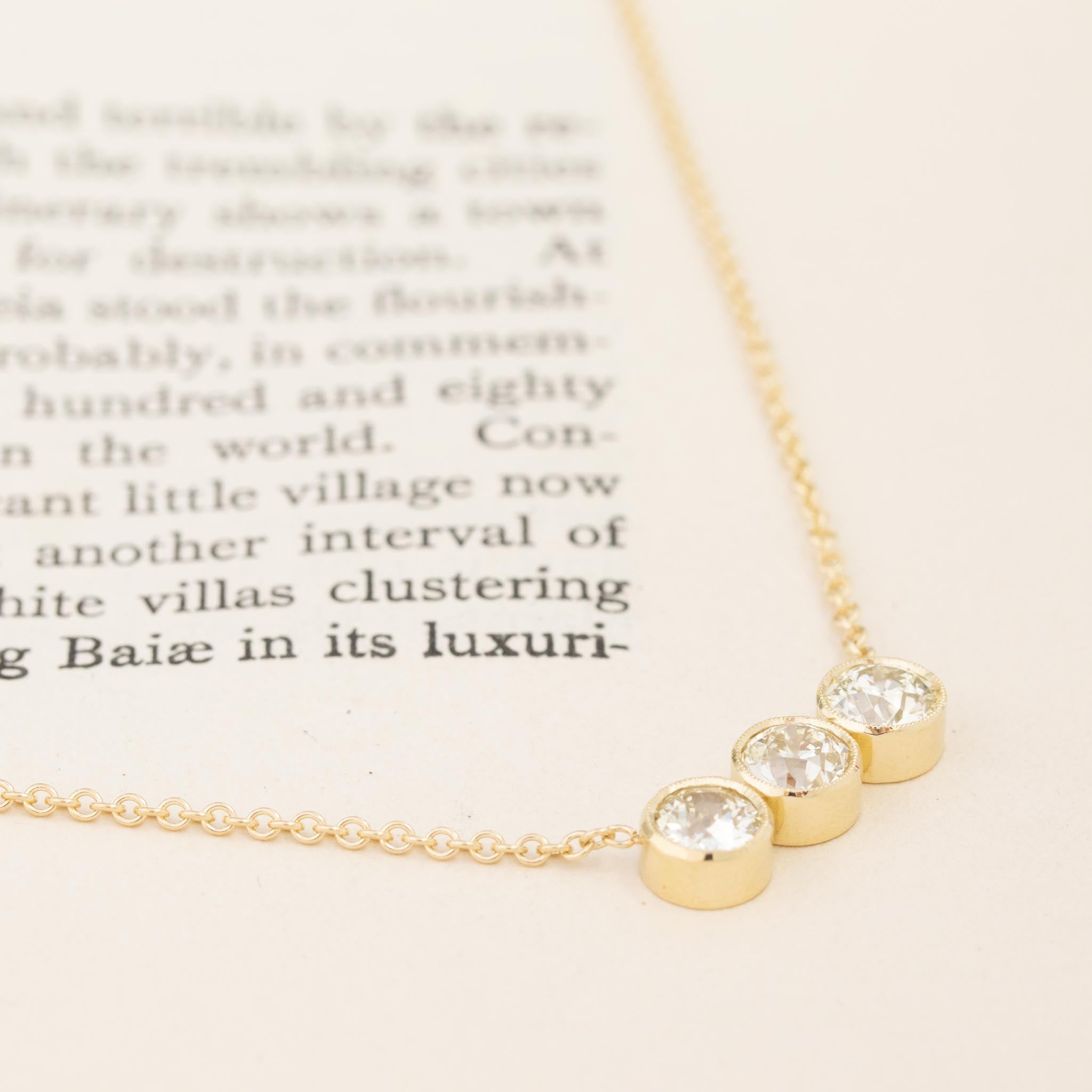 An OEC diamond trilogy pendant in gold bezels along a petite cable link chain - BRB, while we swoon! Each of the diamonds is bright and sparkly, with lots of prismatic light play coming from each movement. A chic and easy daily necklace option.