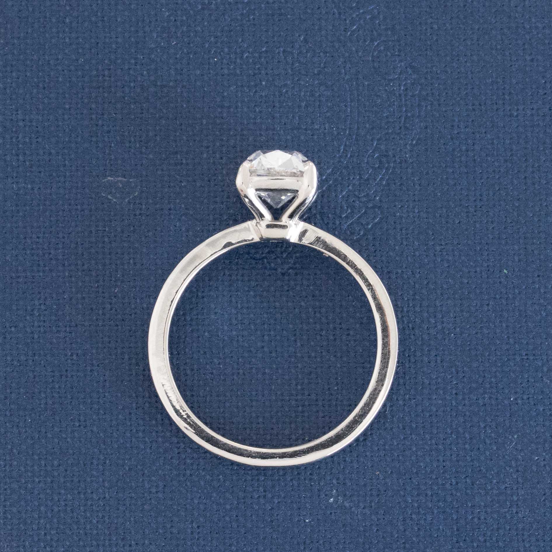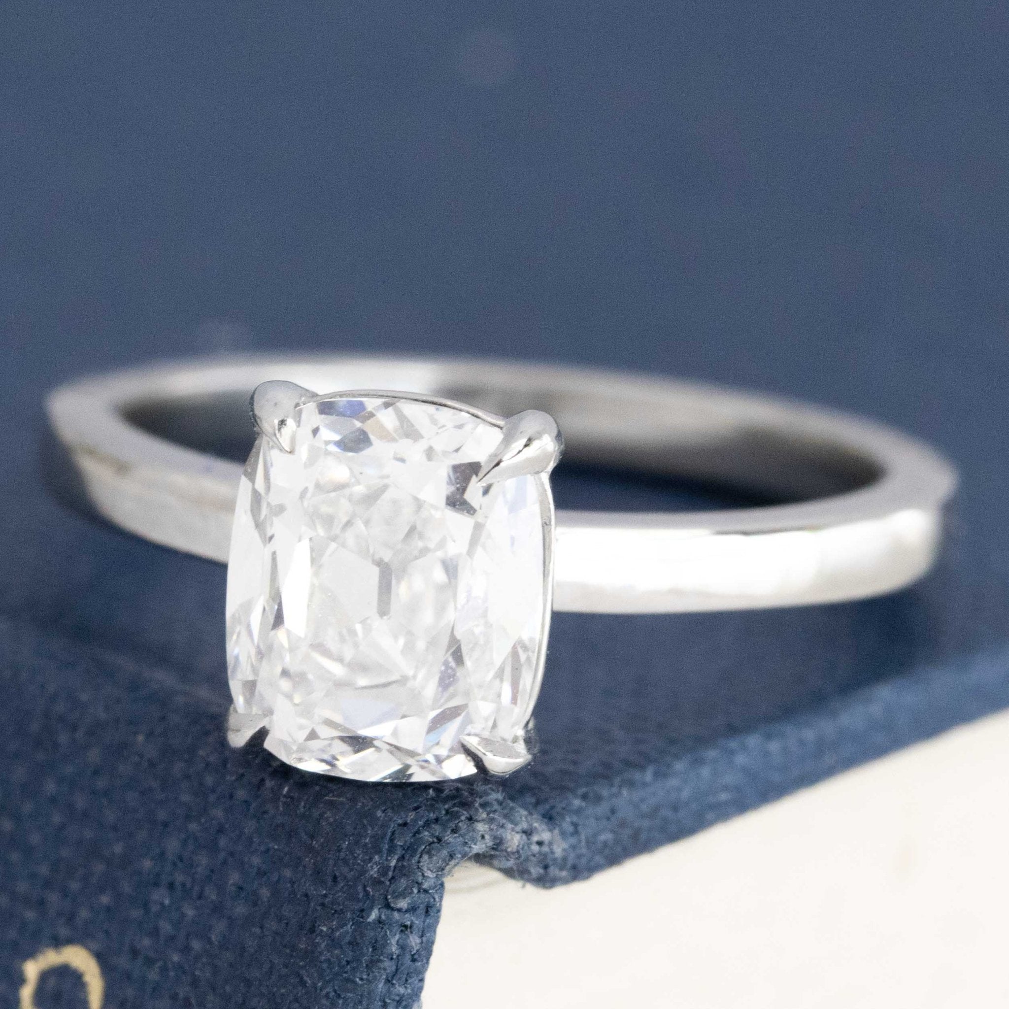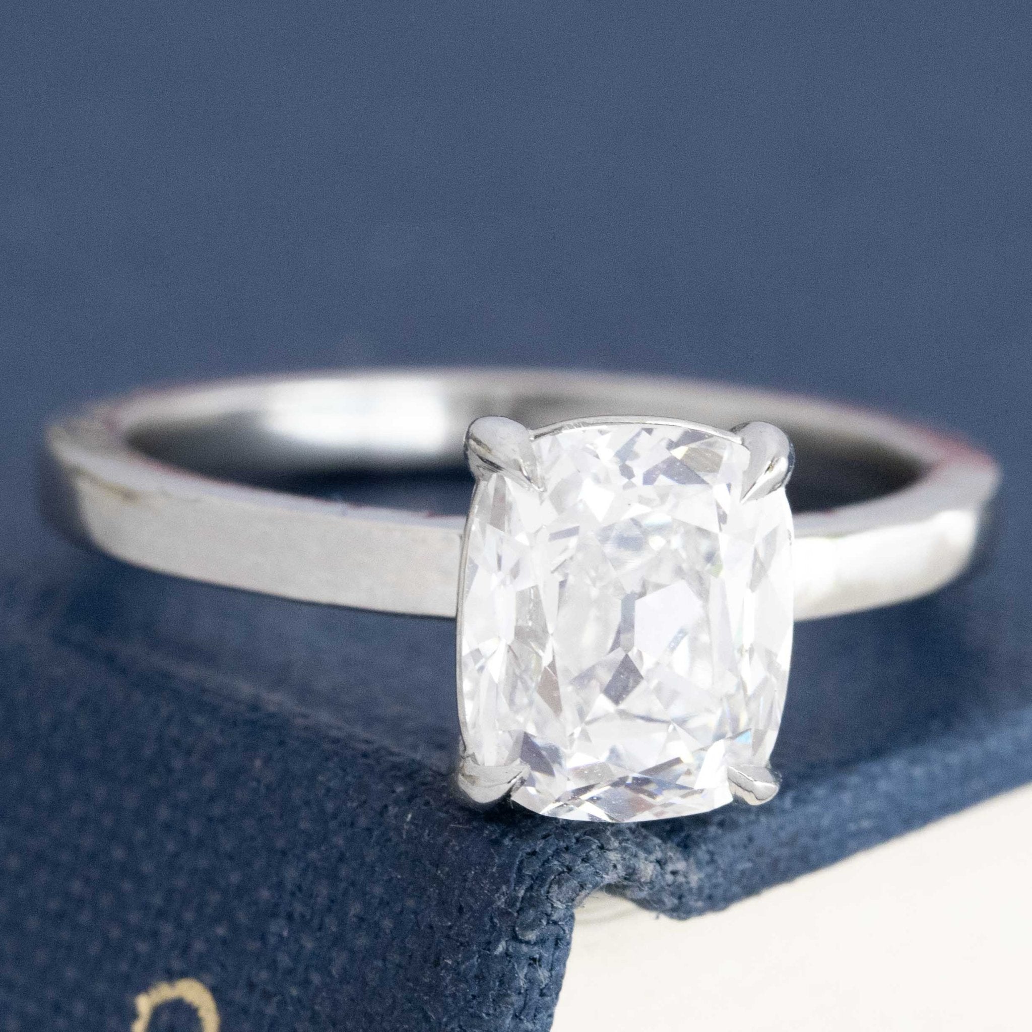 A classically beautiful old mine cut diamond solitaire in icy platinum - perfection if we ever did see it! This 1.75ct has that beautiful elongated shape which ya'll are digging so much these days, not to mention super high specs (a rare find when it comes to the old mine cuts!). We love how it sits on the finger and stacks with other bands - we'd love to see her paired with a chunky gold band or an equally sparkle diamond and platinum band!