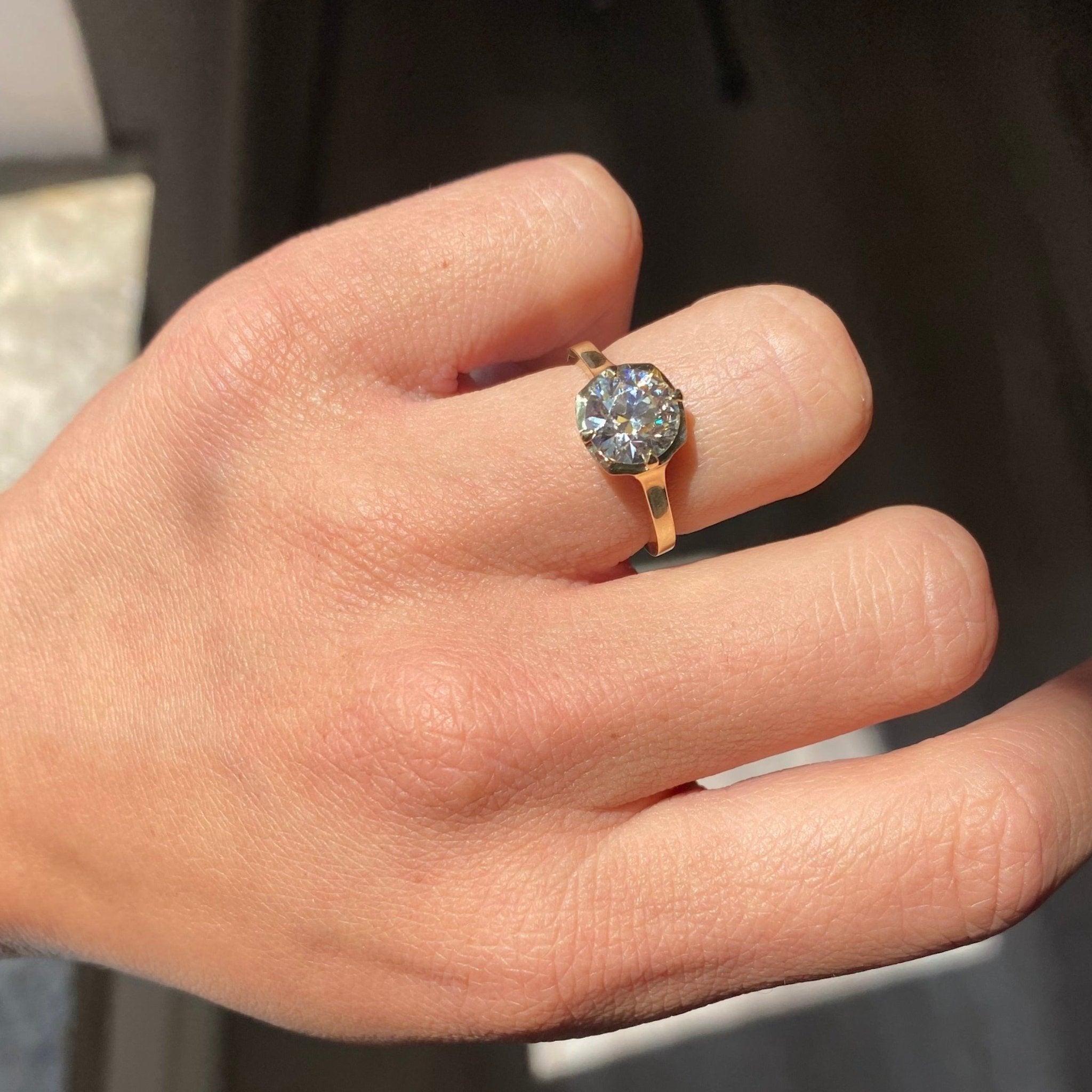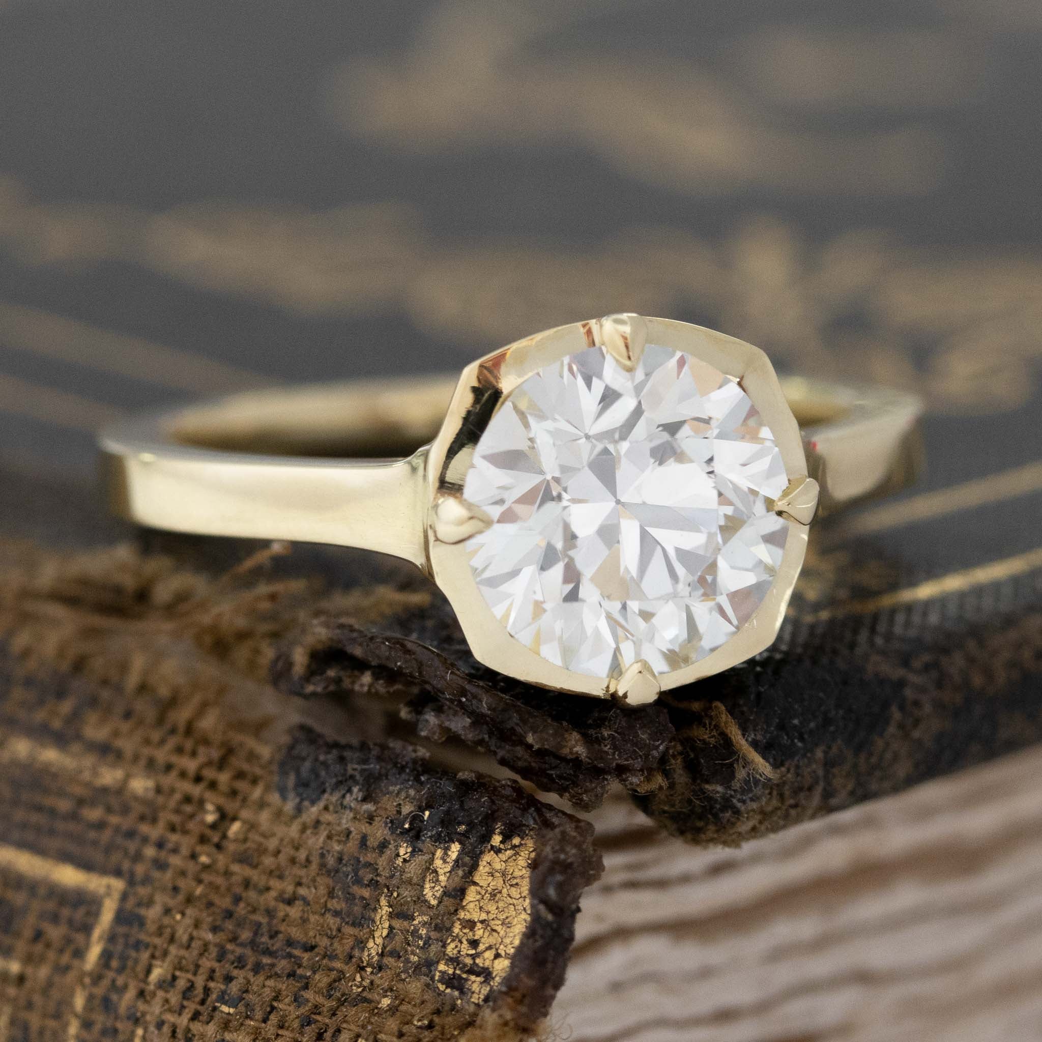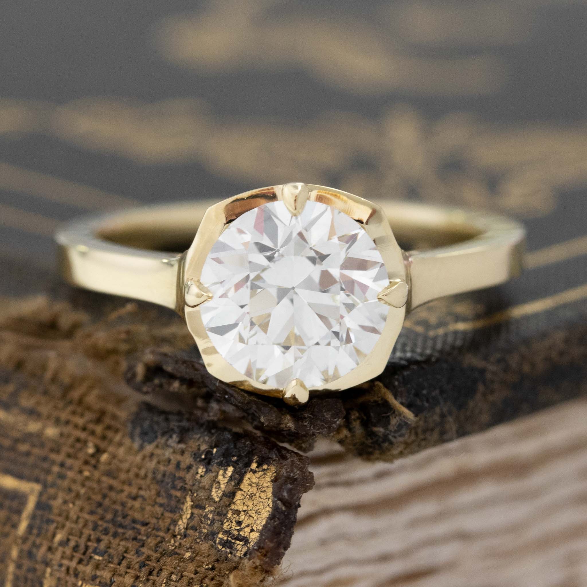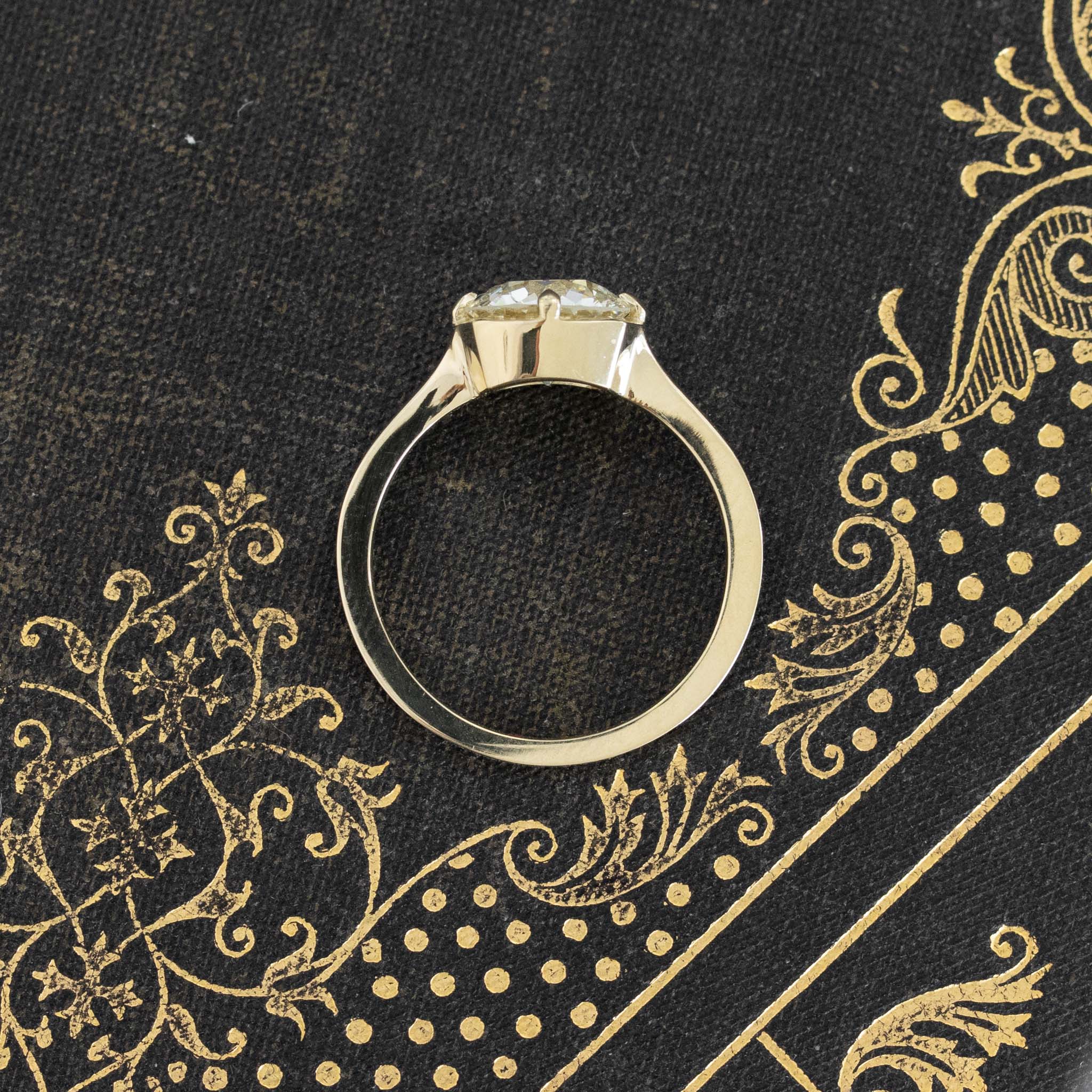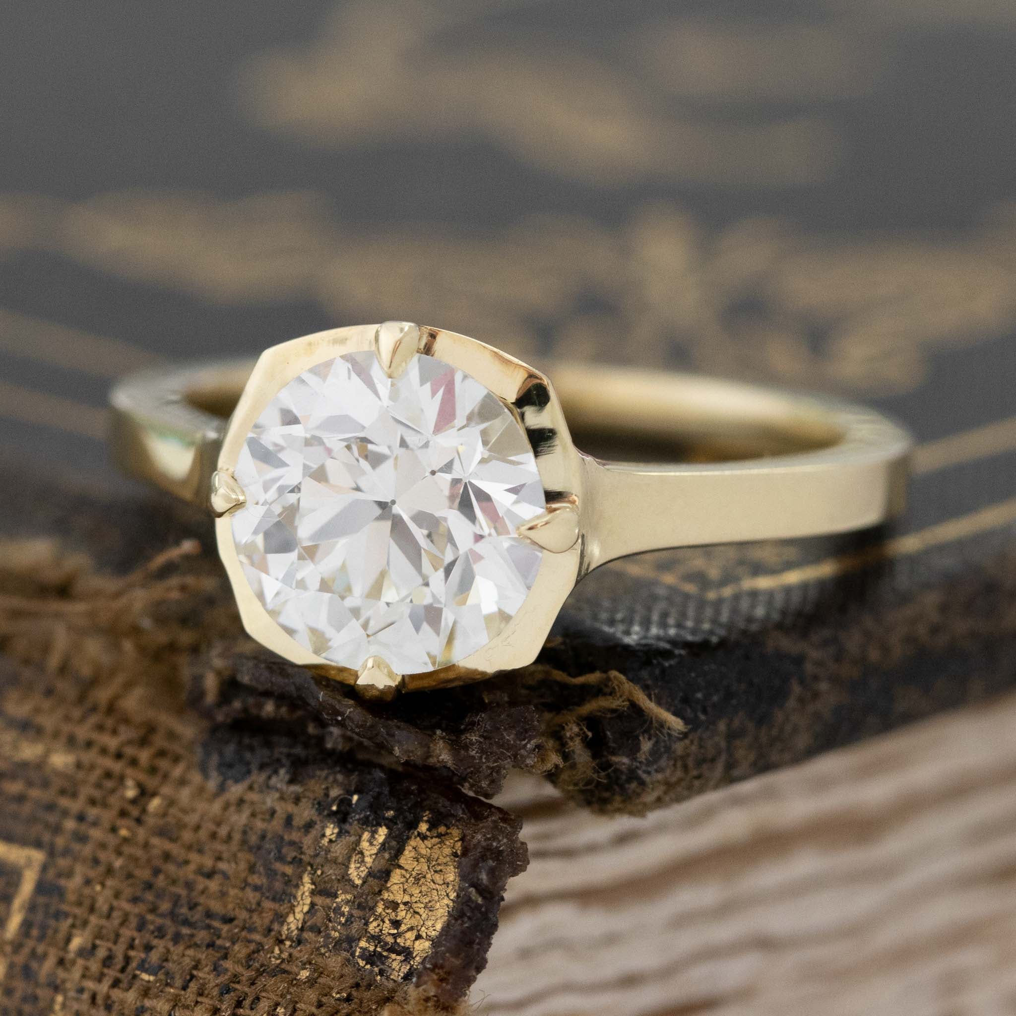 The most charming solitaire you ever did see! This gorgeous transitional cut diamond, with its crisp facets and small culet, sits beautifully in this yellow gold frame with prongs in the N/S/E/W.
