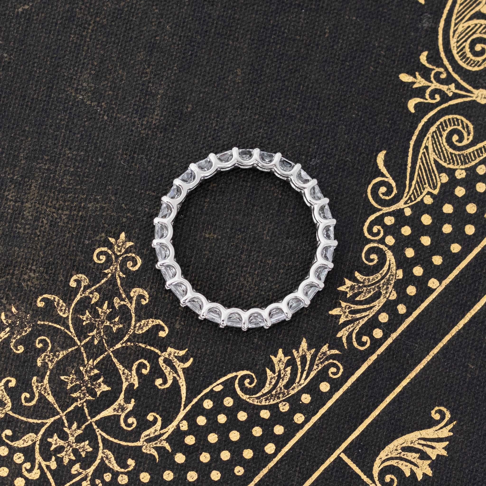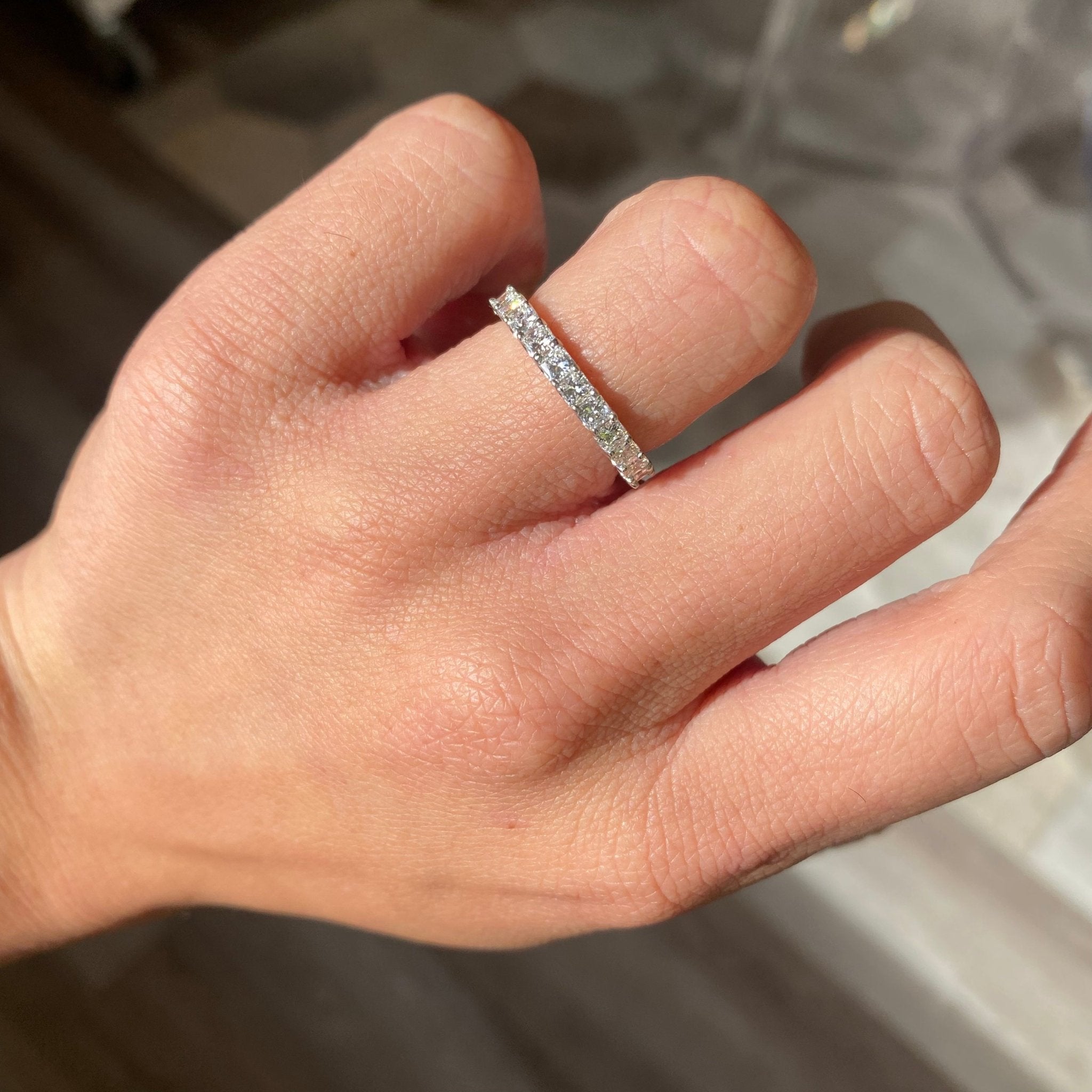 We came across this parcel of radiant cut diamonds and couldn’t help but make a band with them! We love the shape, the brightness, and sparkle of this eternity band, which sits low on the finger. Bold enough to be worn on its own, but will stack beautifully with other bands as well! Sleek, simple and elegant details on the setting.