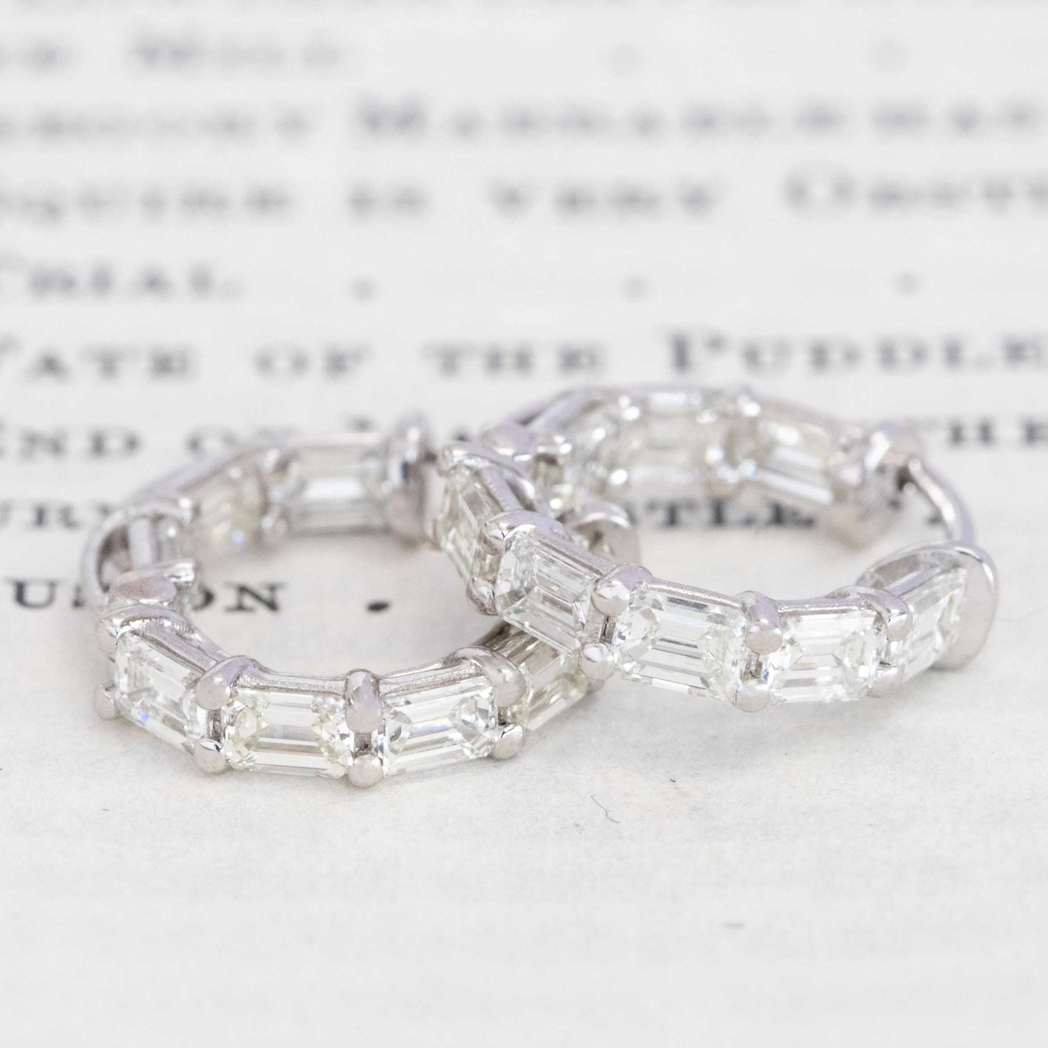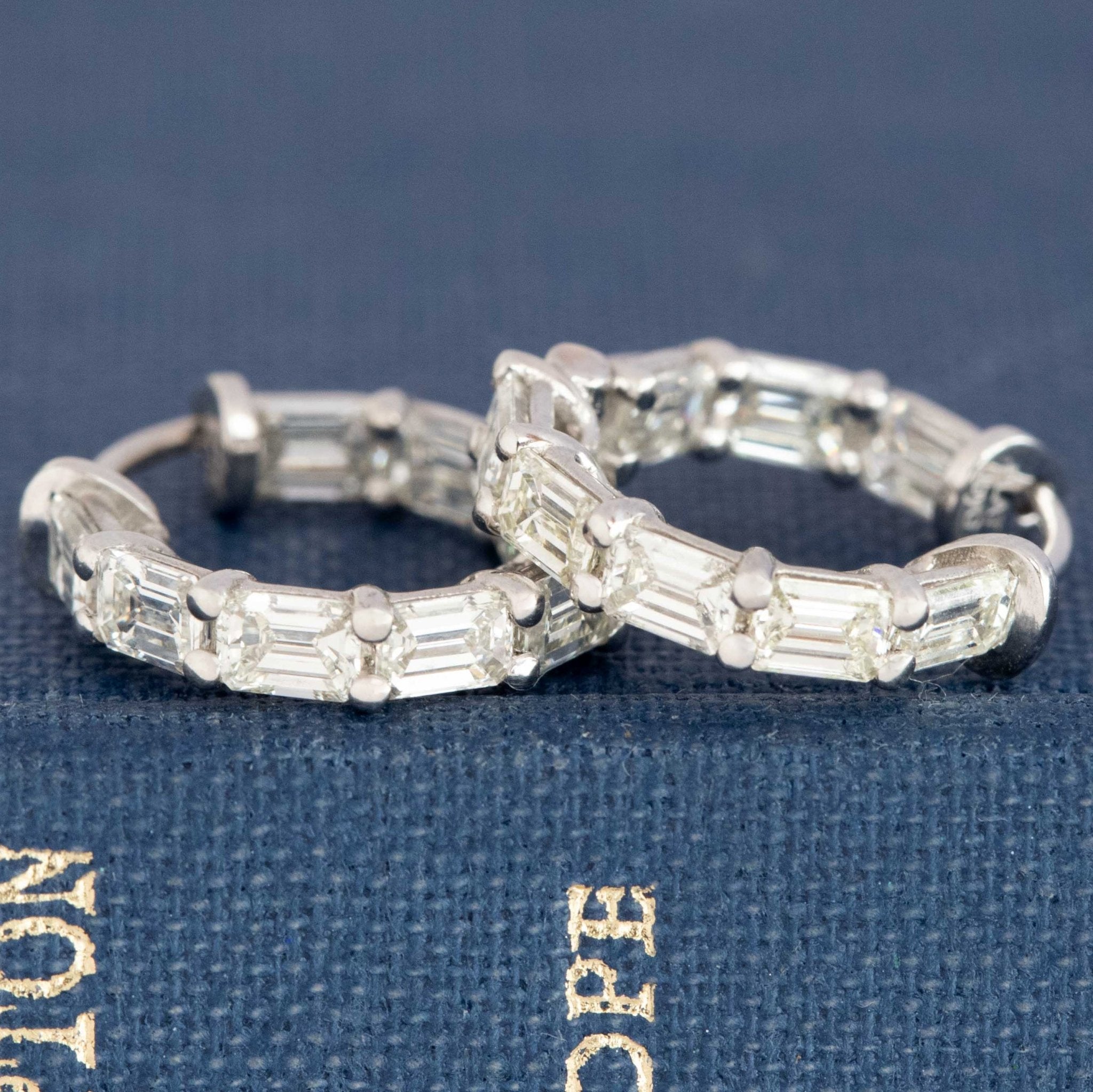 Very few beats the elegance of step cut diamonds on the lobes! Gorgeous emerald cut diamonds, set North-South on platinum wire frames twinkle and catch the light softly on the ears. Elegant, understated and just perfect for the hoop lover who wants a little more than gold on their ears.