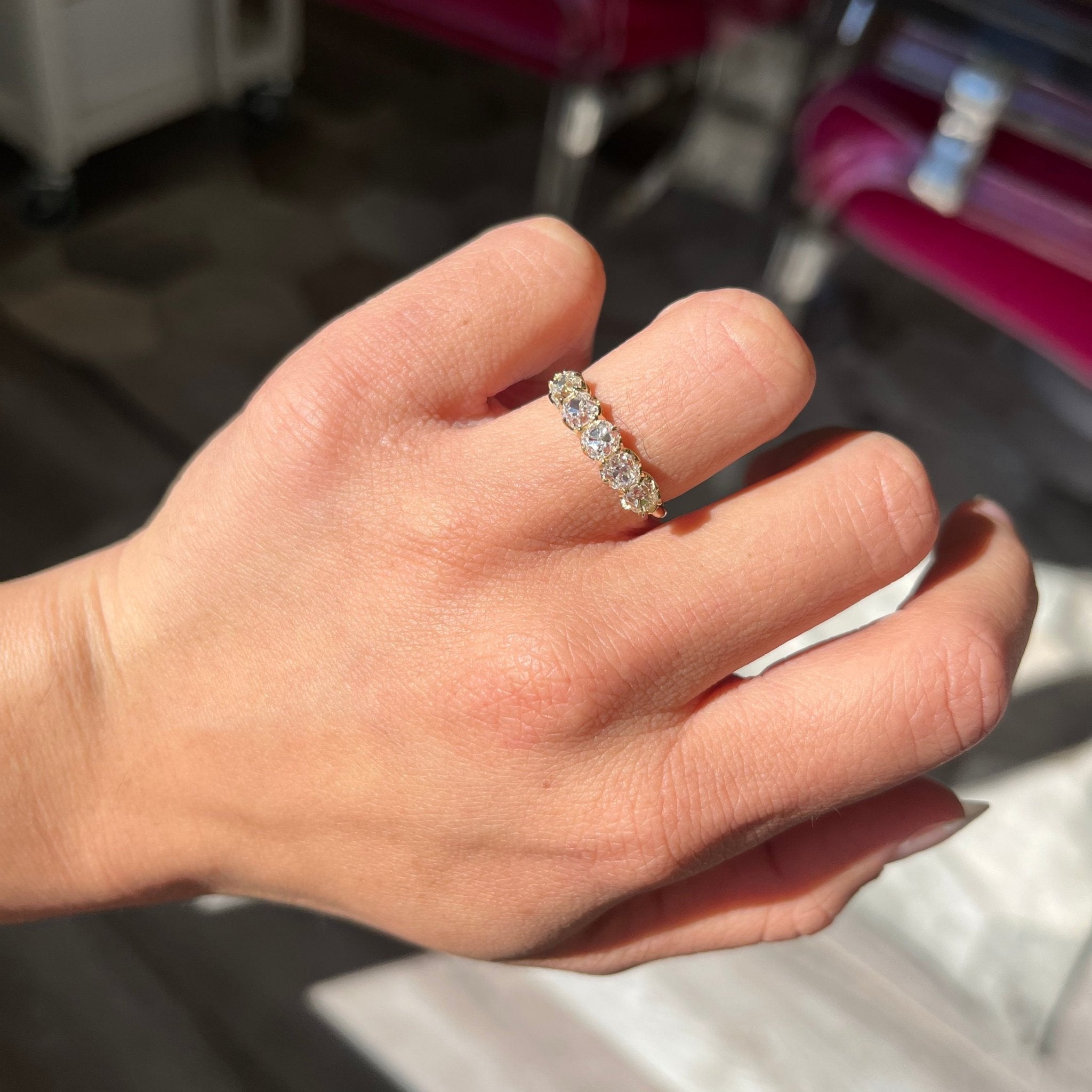 Modeled after antique diamond bands from the Georgian and Victorian eras, this 5-stone band is set with chunky and charming old mine cut diamonds in simple settings with swoopy, airy gallery details. The diamonds are bright and sparkly and just looks so beautiful and elegant on the finger. Our favorite bands by far!