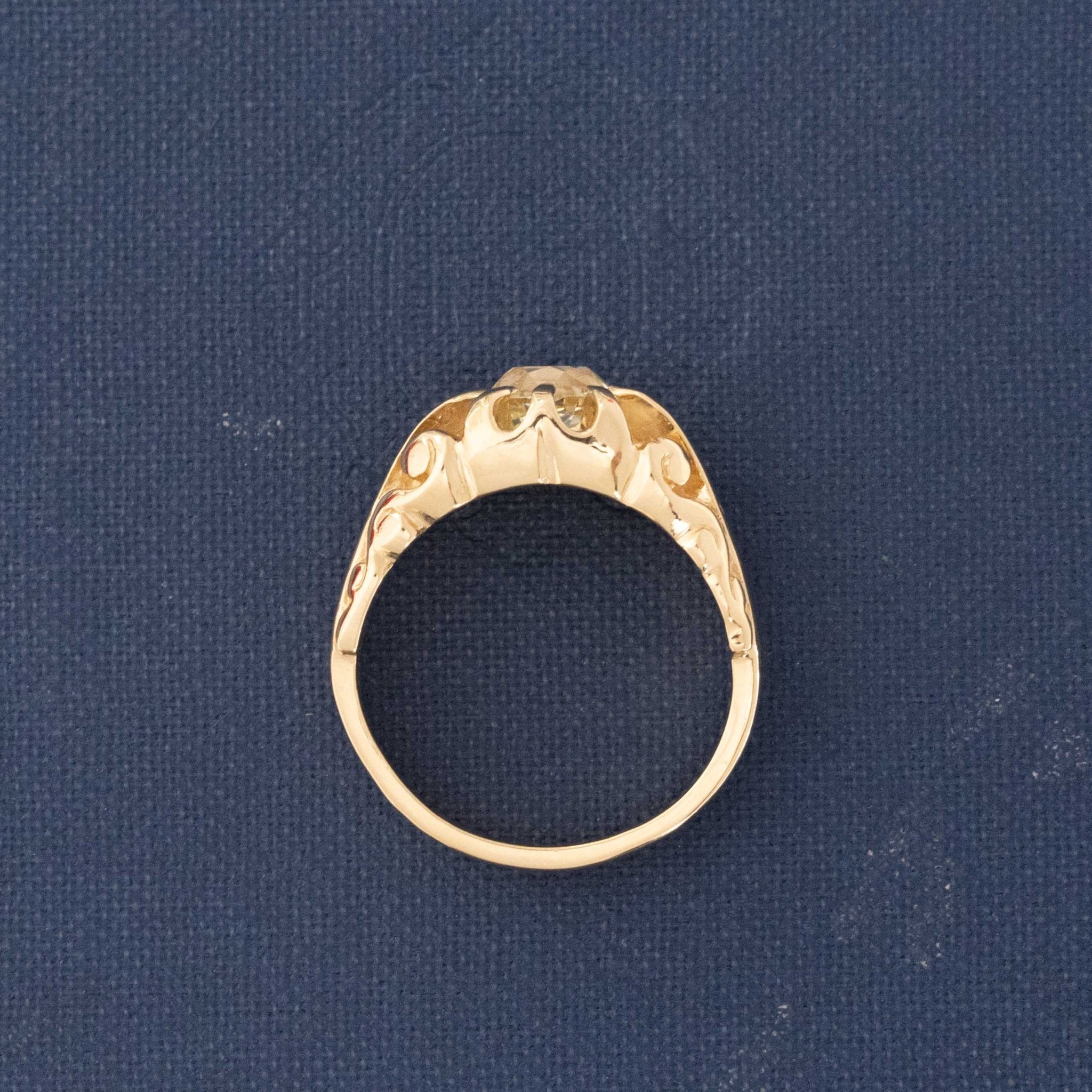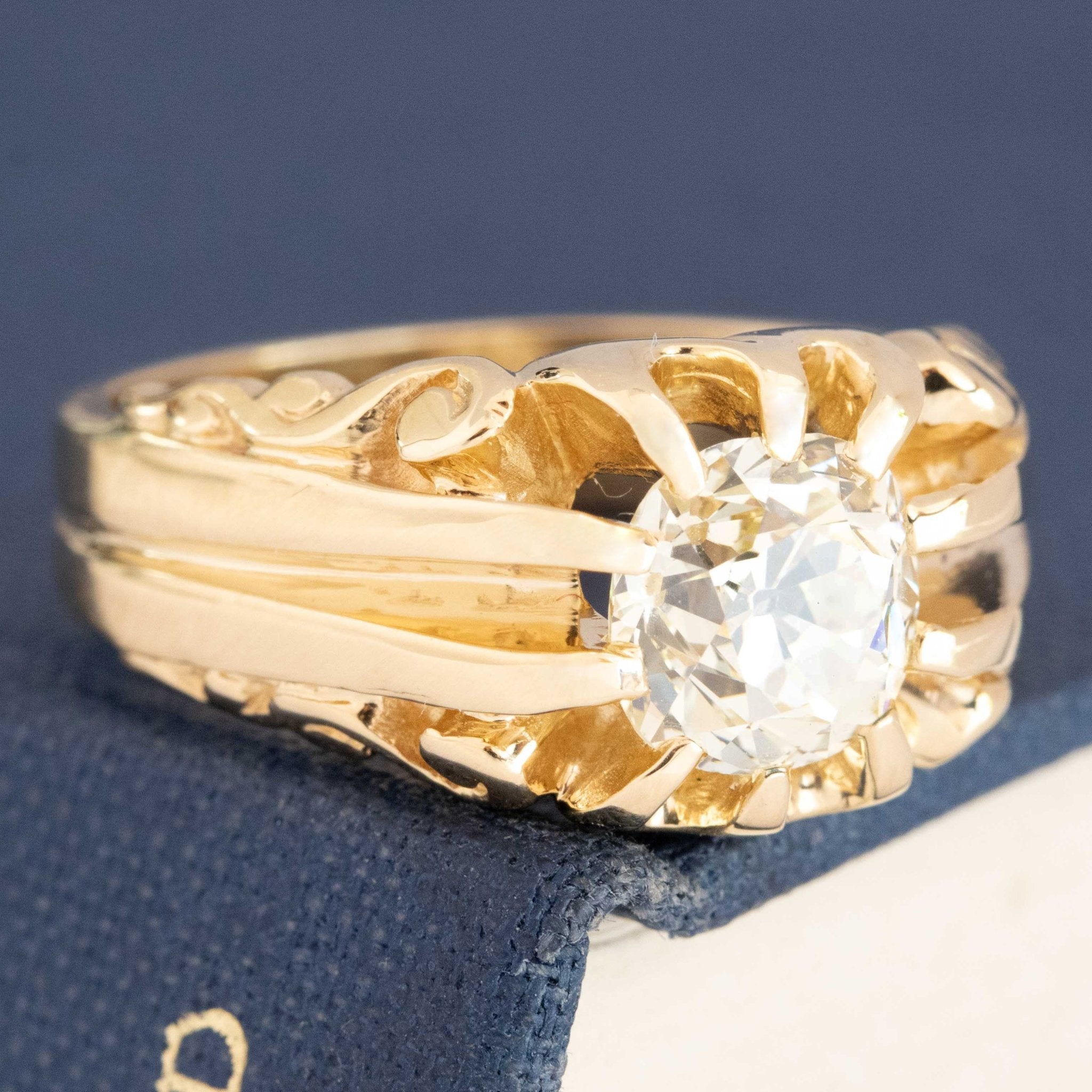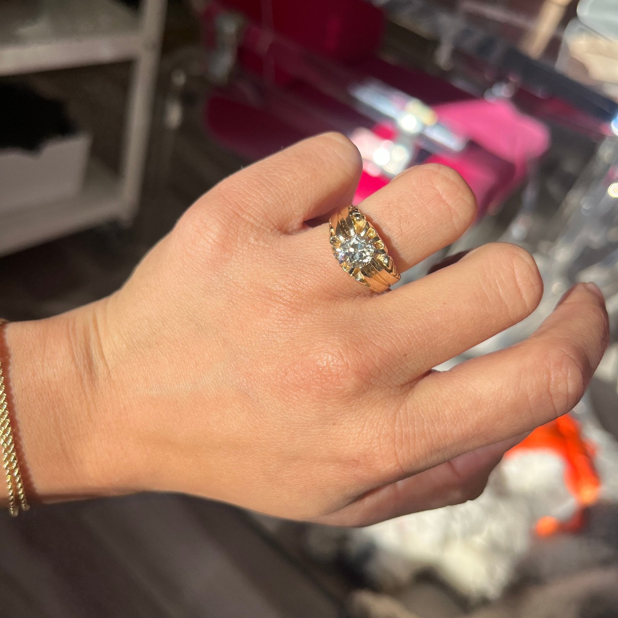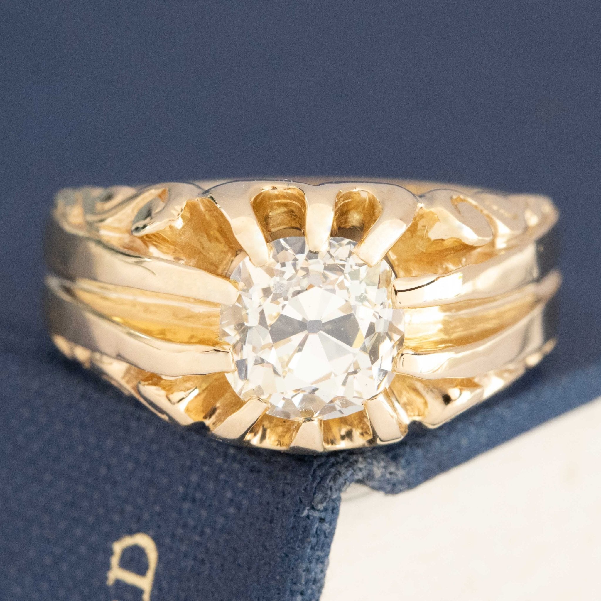 One-of-a-kind vintage belcher ring, set with a super chunky and rustic old mine cut diamond. The stone is chocfull of personality and charm - flashing a rainbow of colors with every movement. Set in a hefty carved gold setting. She is a power ring - no doubt about it!
