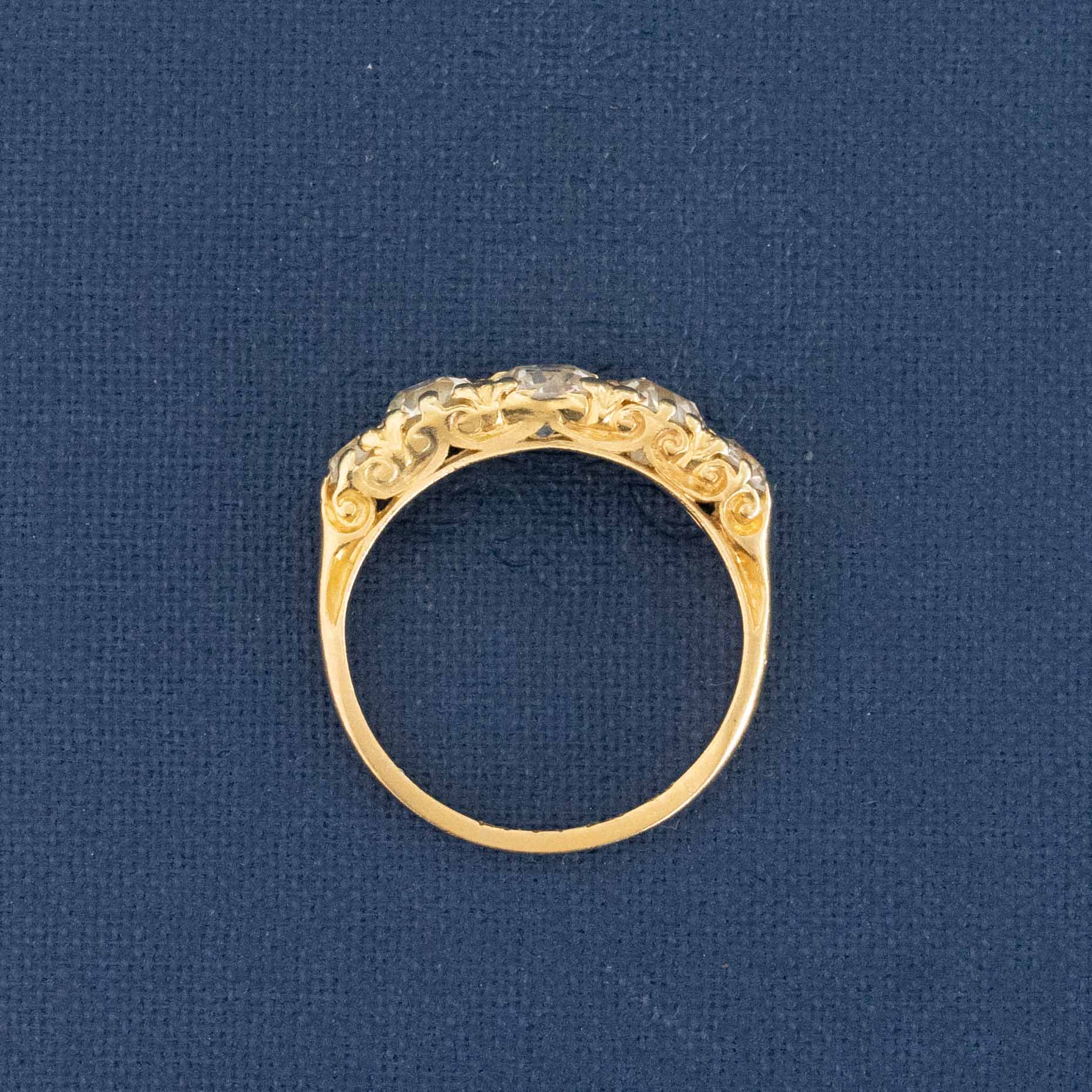 Antique scroll rings (also known as half-hoops around here) are such a classic piece to add to one's jewelry collection - not only are they a testament to brilliant old school craftsmanship, but they possess a charm and sparkle that is so undeniably unique! This one is crafted in 18kt gold with graduated Old European cut diamonds and beautiful metalwork along the gallery.