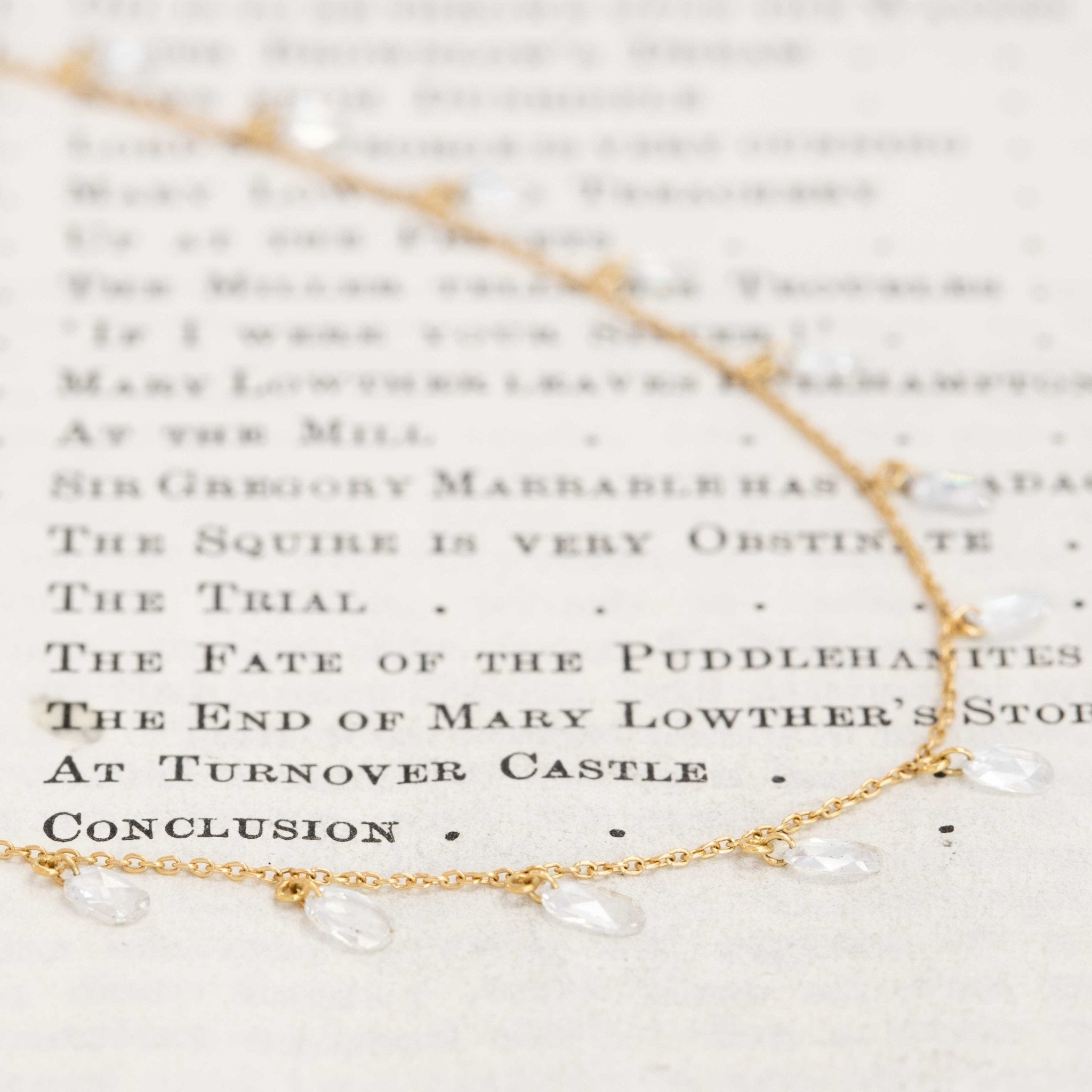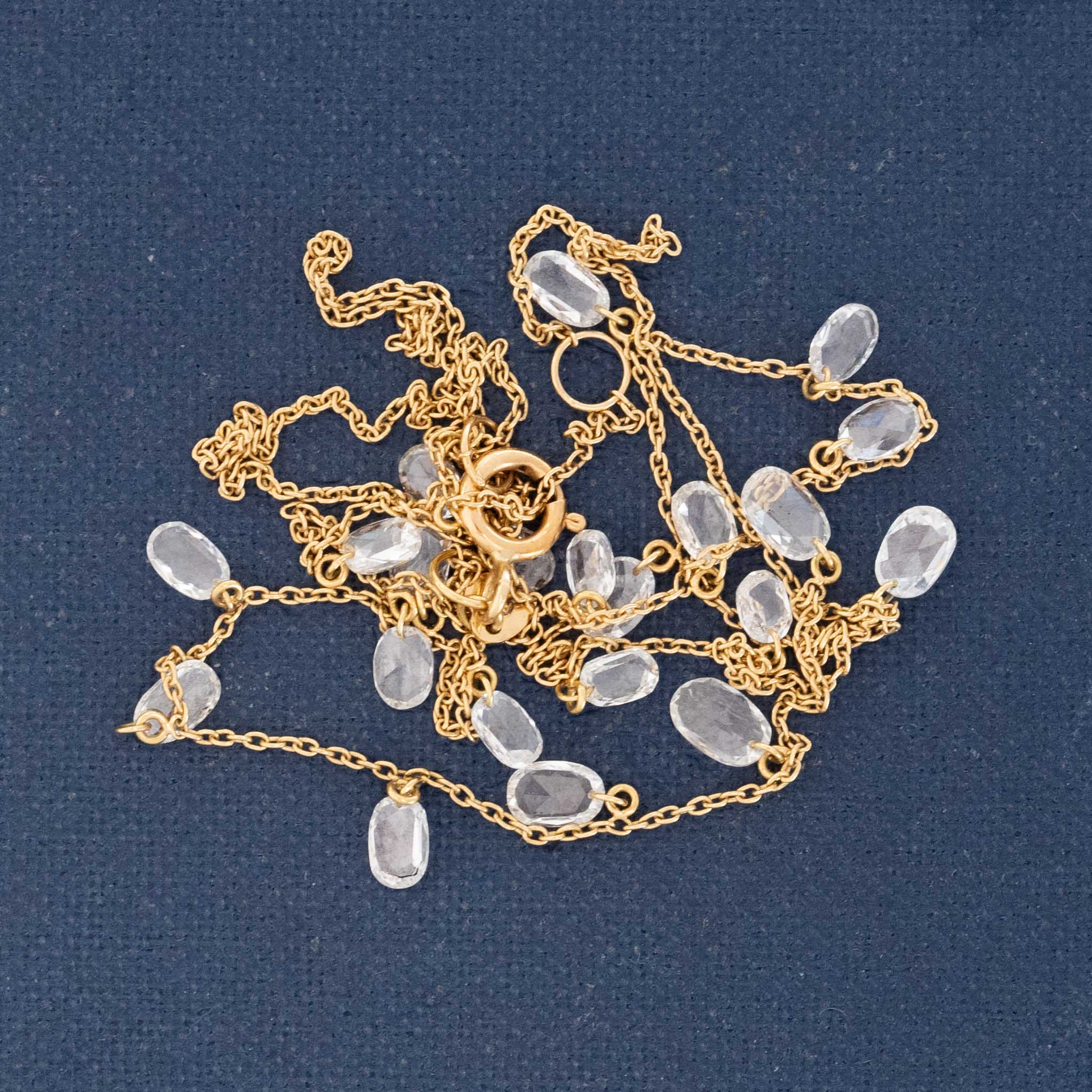 These delicate, oval-shaped rose cuts are pierced and strung along a simple petite chain - shimmery diamond perfection! The stones dance and play along one's neck in the most lovely way. It wears wonderfully solo, or perhaps paired with your favorite gold link chain.
