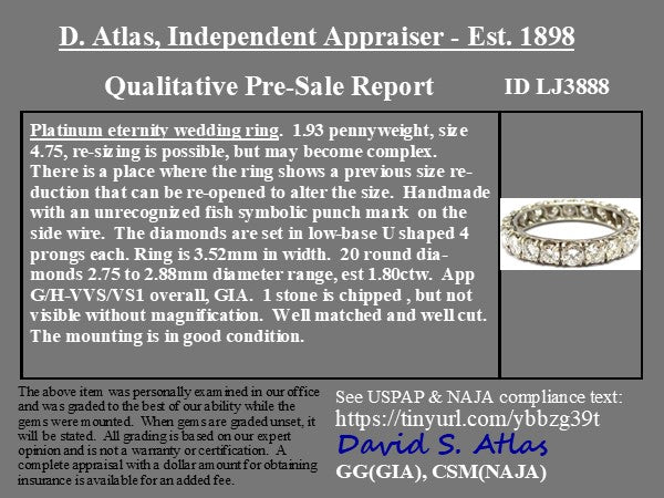 A classic round brilliant diamond eternity band, sparkly and bright, set in crisp platinum. Perfect for stacking or wearing solo, she plays well with others but packs a big punch all on its own.