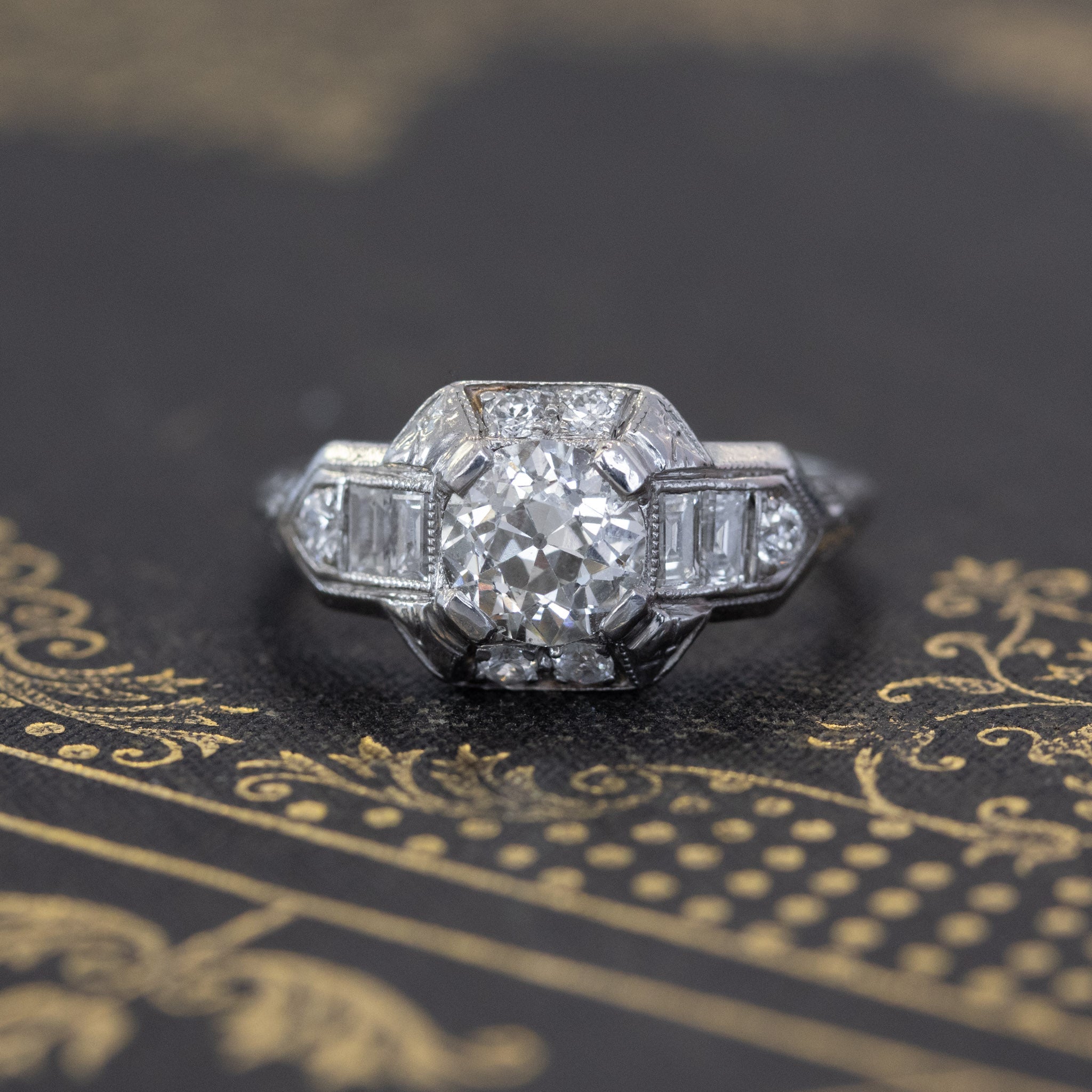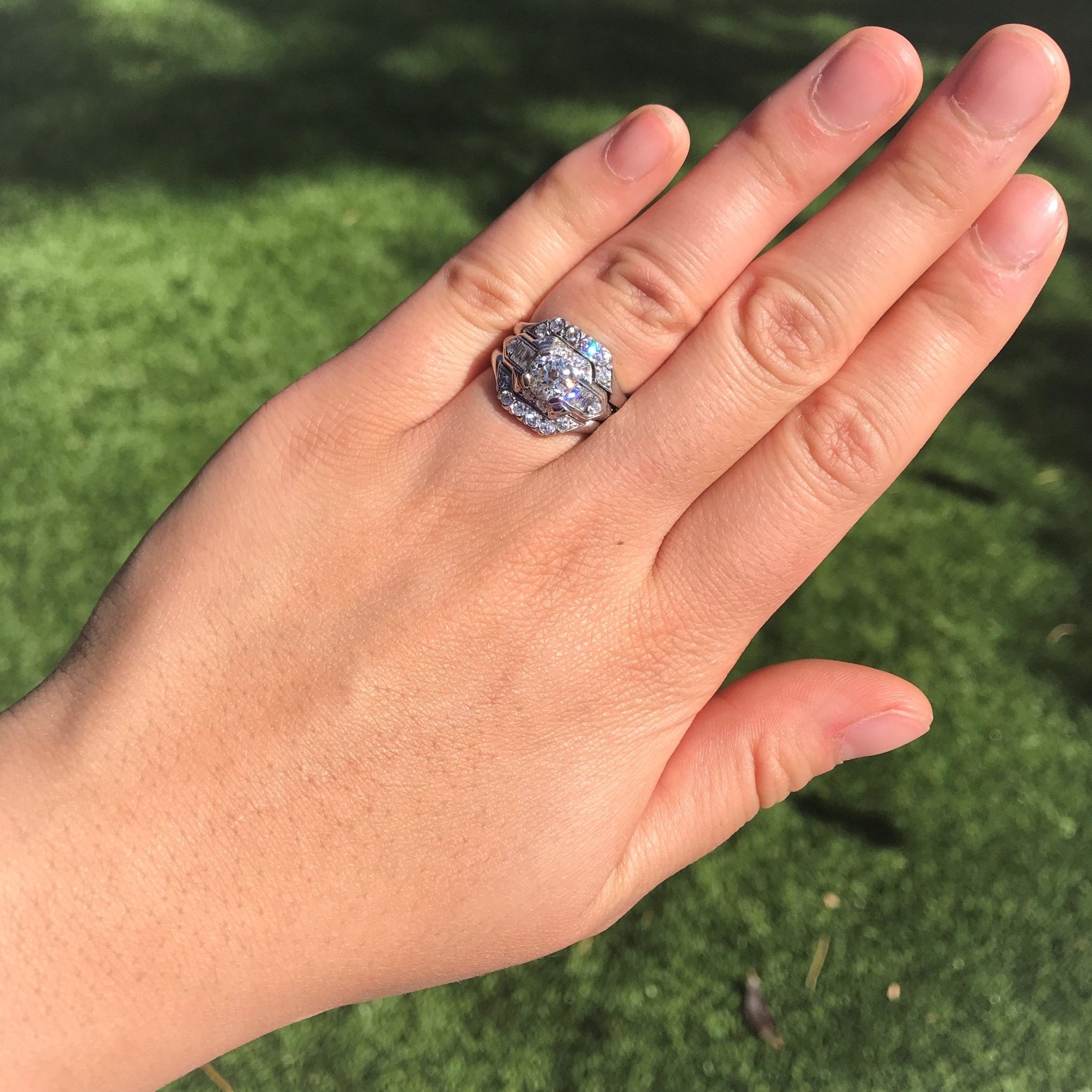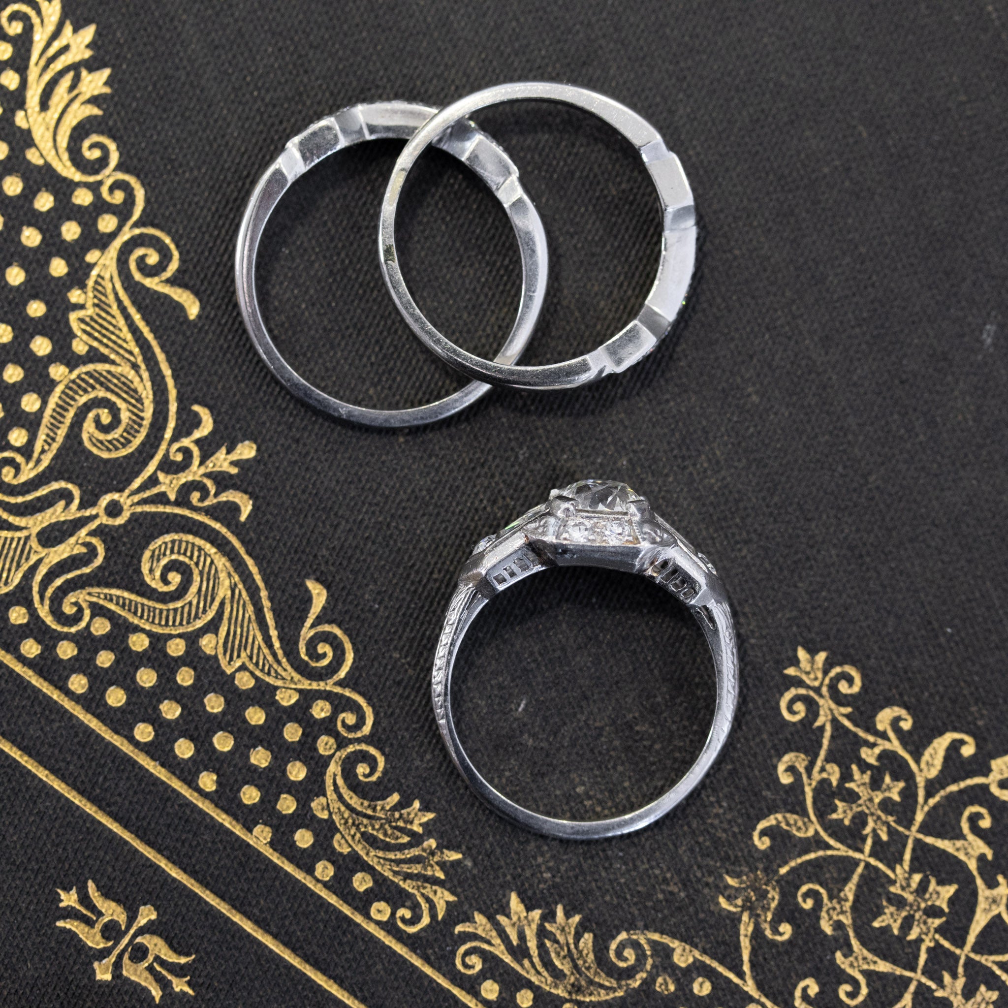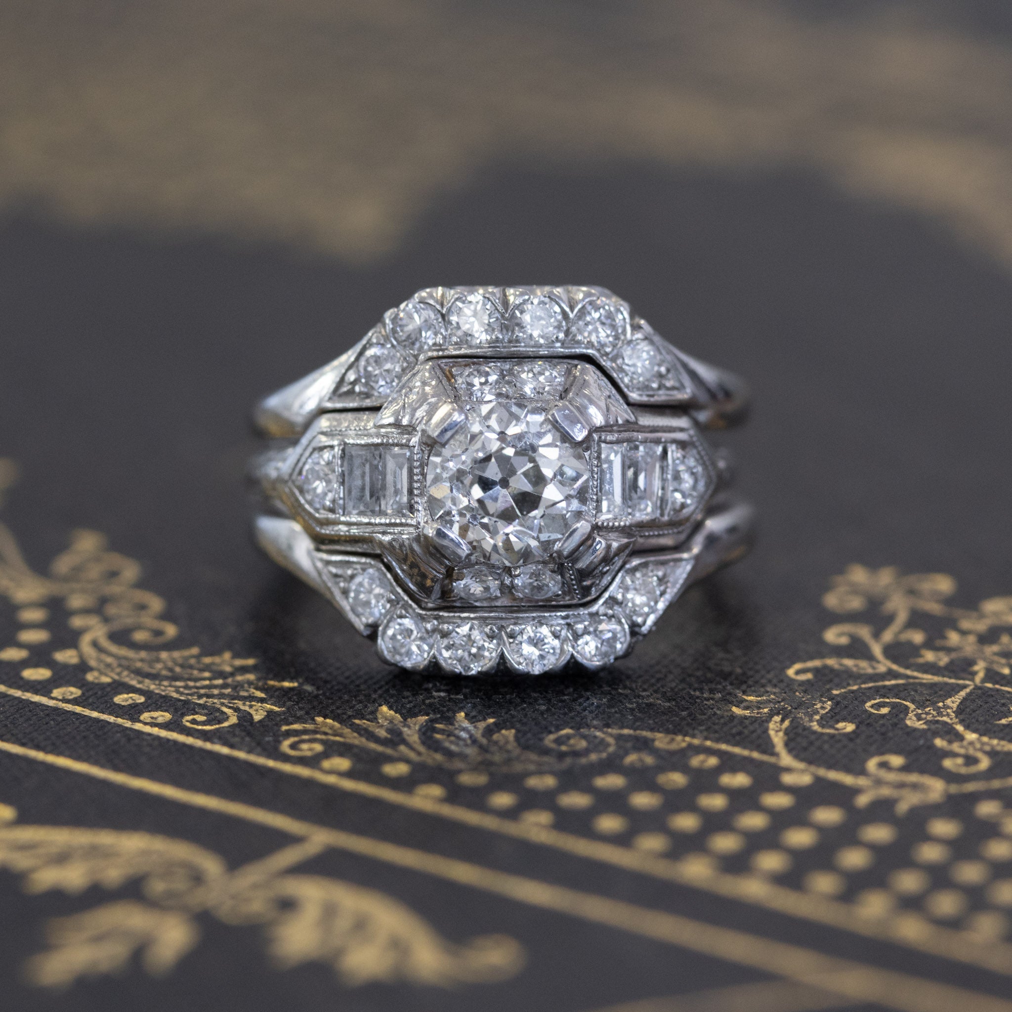Classic art deco styling with this gorgeous wedding set! The engagement ring is so beautiful and unique, with emerald cut diamonds along the shoulders, and further surrounded by old European cut diamonds along the shoulders and shank. The central diamond (estimated to be 1.02cts) is chunky, super bright, and just totally adorable. The 2 custom bands appear to be a later addition to the set, and fit the ring perfectly. They are set with antique single cut diamonds. On the finger, the overall look is bold, present, and unmistakably antique!
