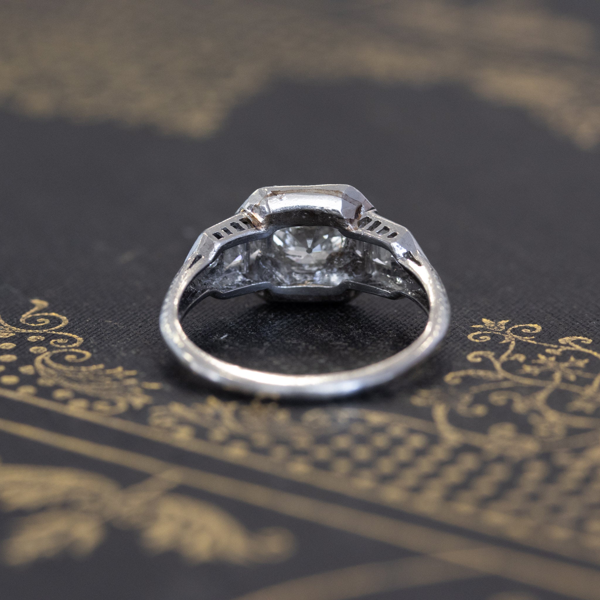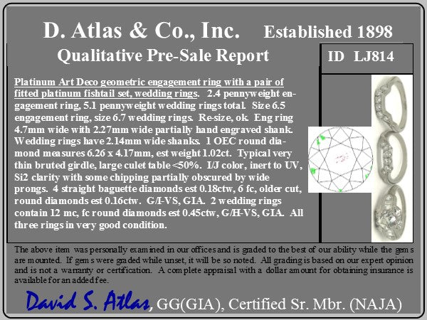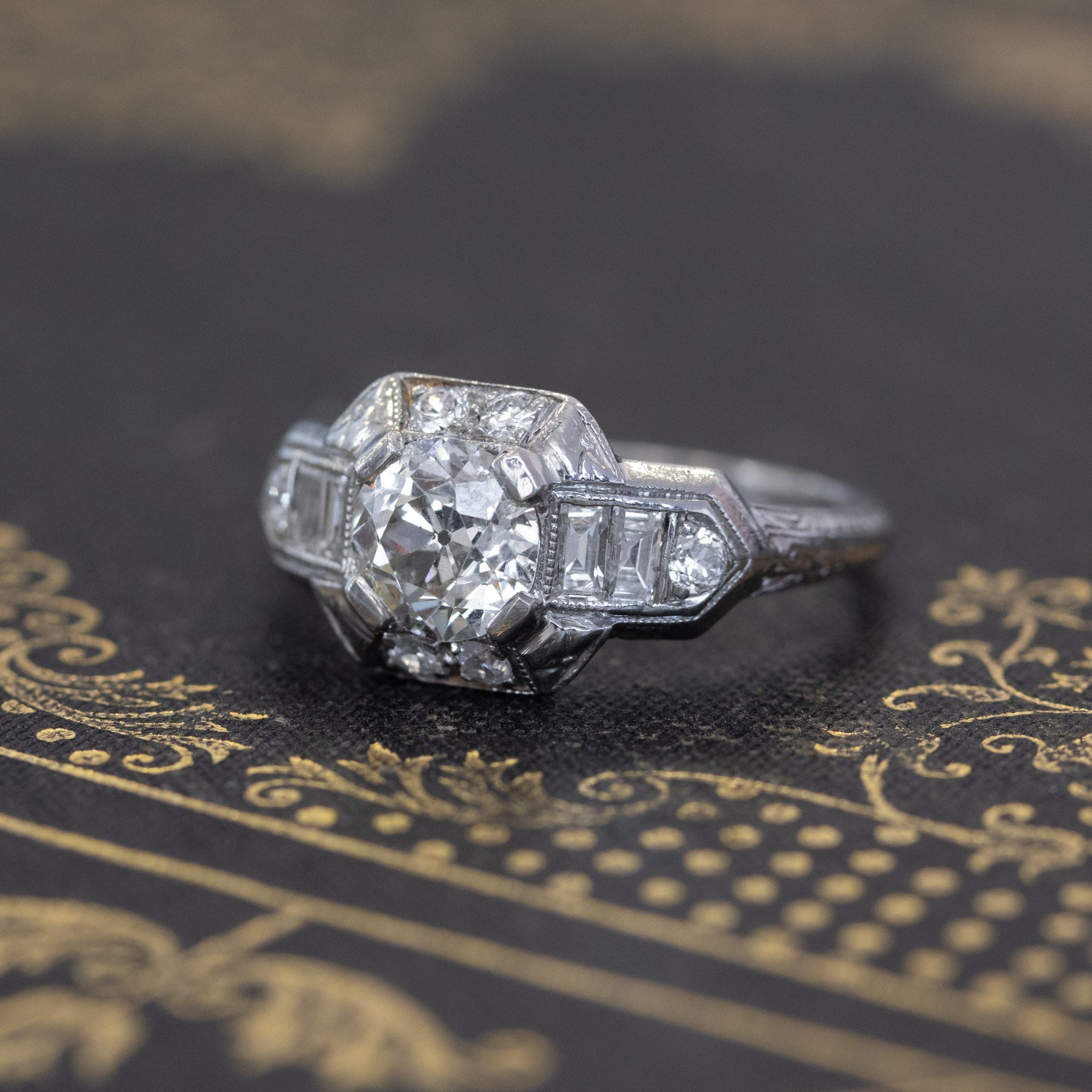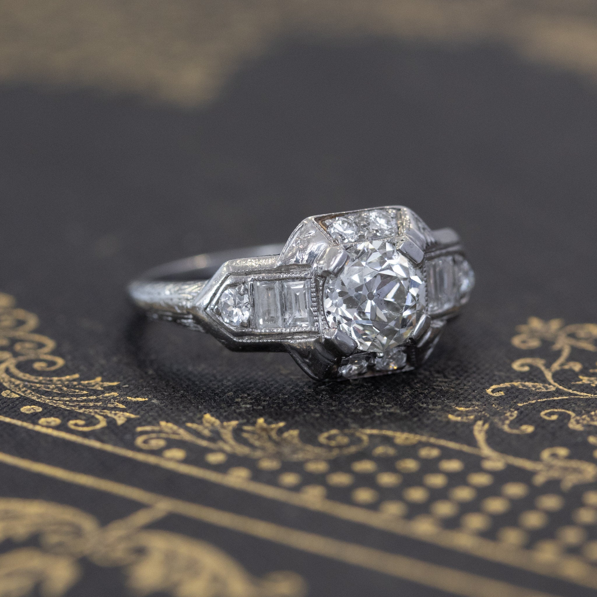 Classic art deco styling with this gorgeous wedding set! The engagement ring is so beautiful and unique, with emerald cut diamonds along the shoulders, and further surrounded by old European cut diamonds along the shoulders and shank. The central diamond (estimated to be 1.02cts) is chunky, super bright, and just totally adorable. The 2 custom bands appear to be a later addition to the set, and fit the ring perfectly. They are set with antique single cut diamonds. On the finger, the overall look is bold, present, and unmistakably antique!