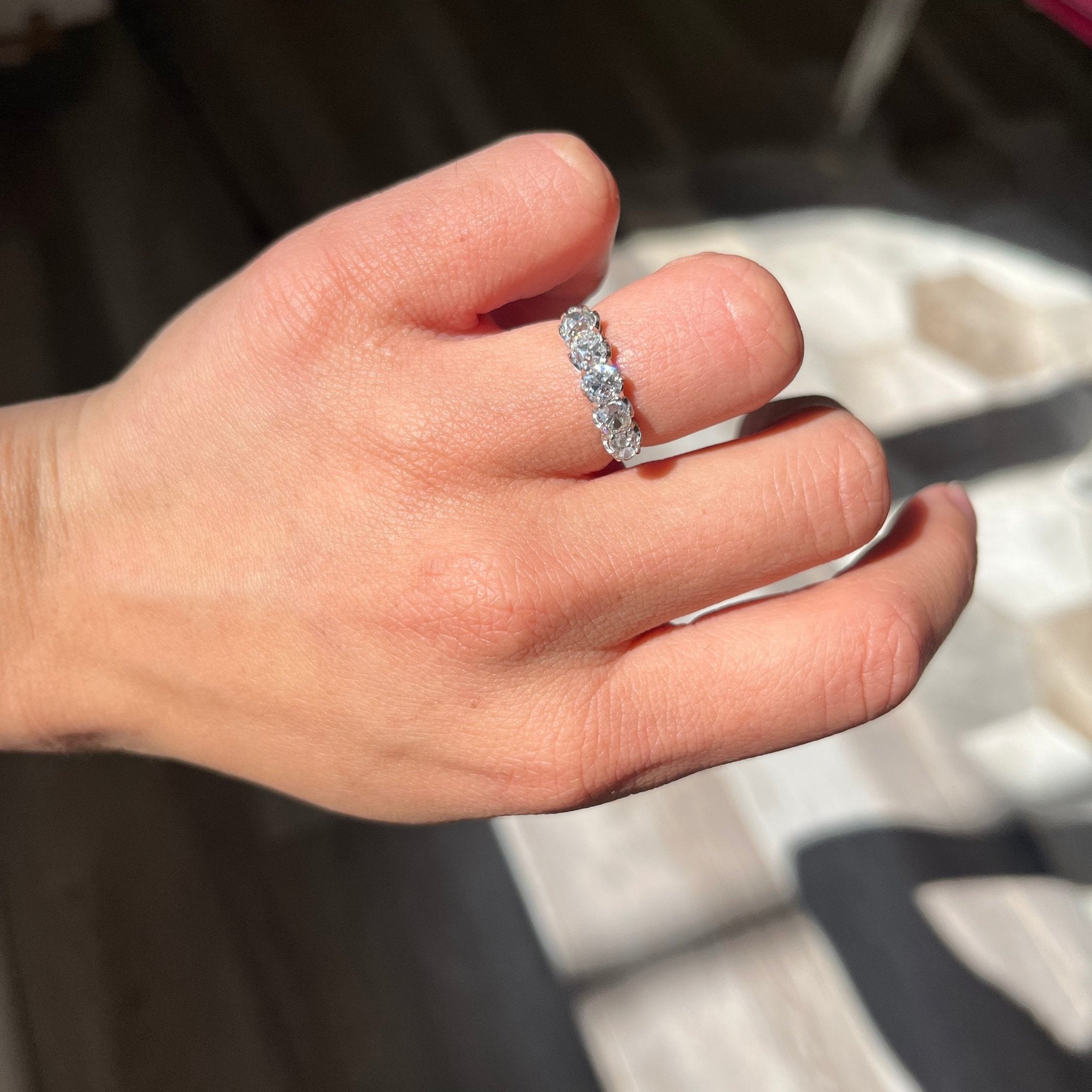 Modeled after antique diamond bands from the Georgian and Victorian eras, this 5-stone band is set with slightly elongated, chunky and charming old mine cut diamonds in simple settings with swoopy, airy gallery details. The diamonds are bright and sparkly and just looks so beautiful and elegant on the finger. Our favorite bands by far!
