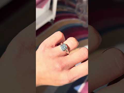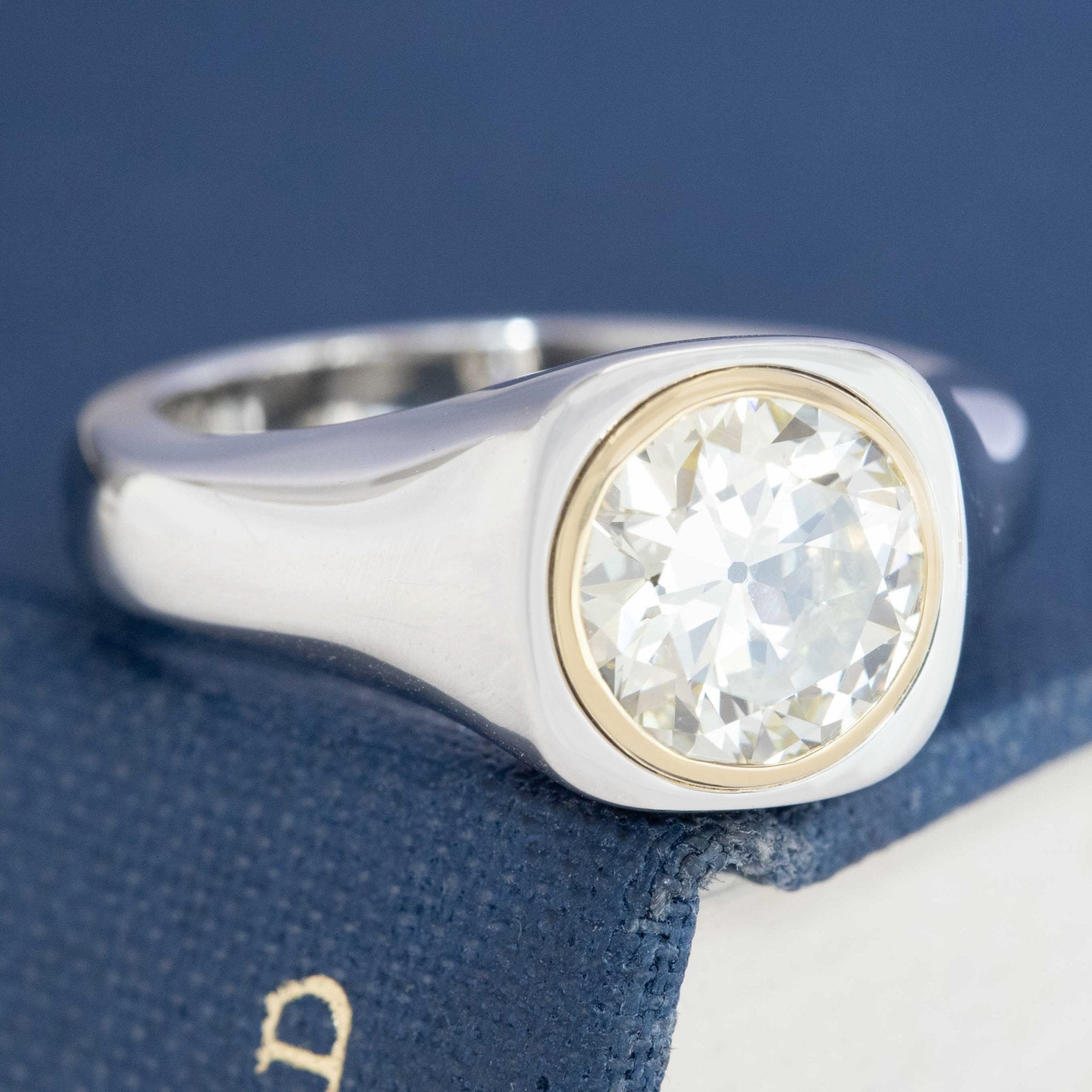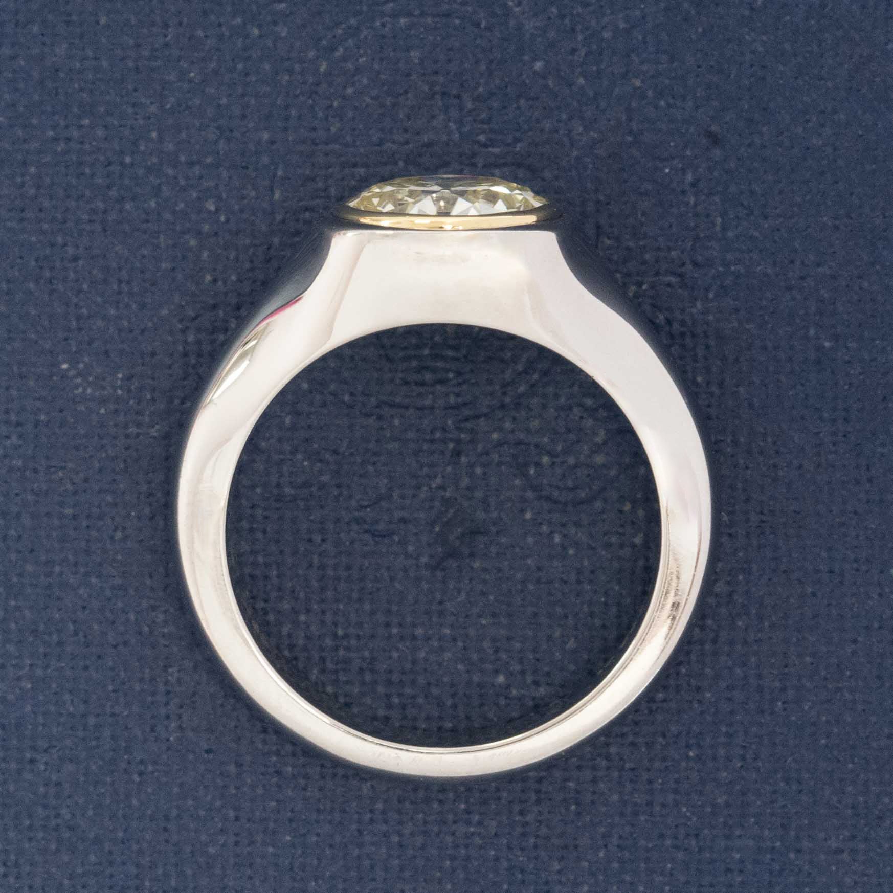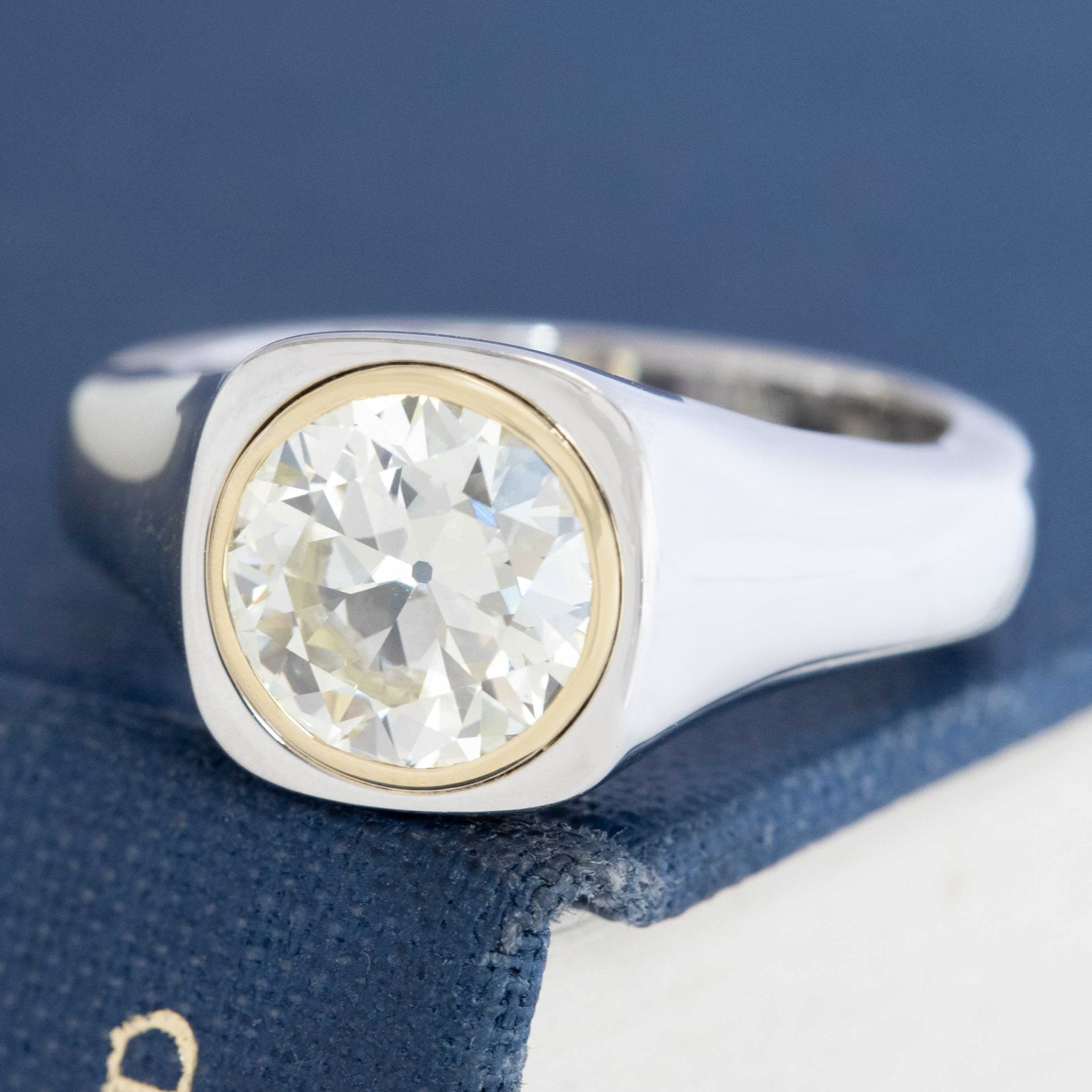 Sleek and fluid, our old European cut diamond with its warm buttery color is ensconced in an 18kt yellow gold bezel and then set in a cushion-shaped platinum setting. Low set on the finger, the ring is a perfect juxtaposition of the old and the new. Bonus: the diamond looks like a 2ct in this setting!