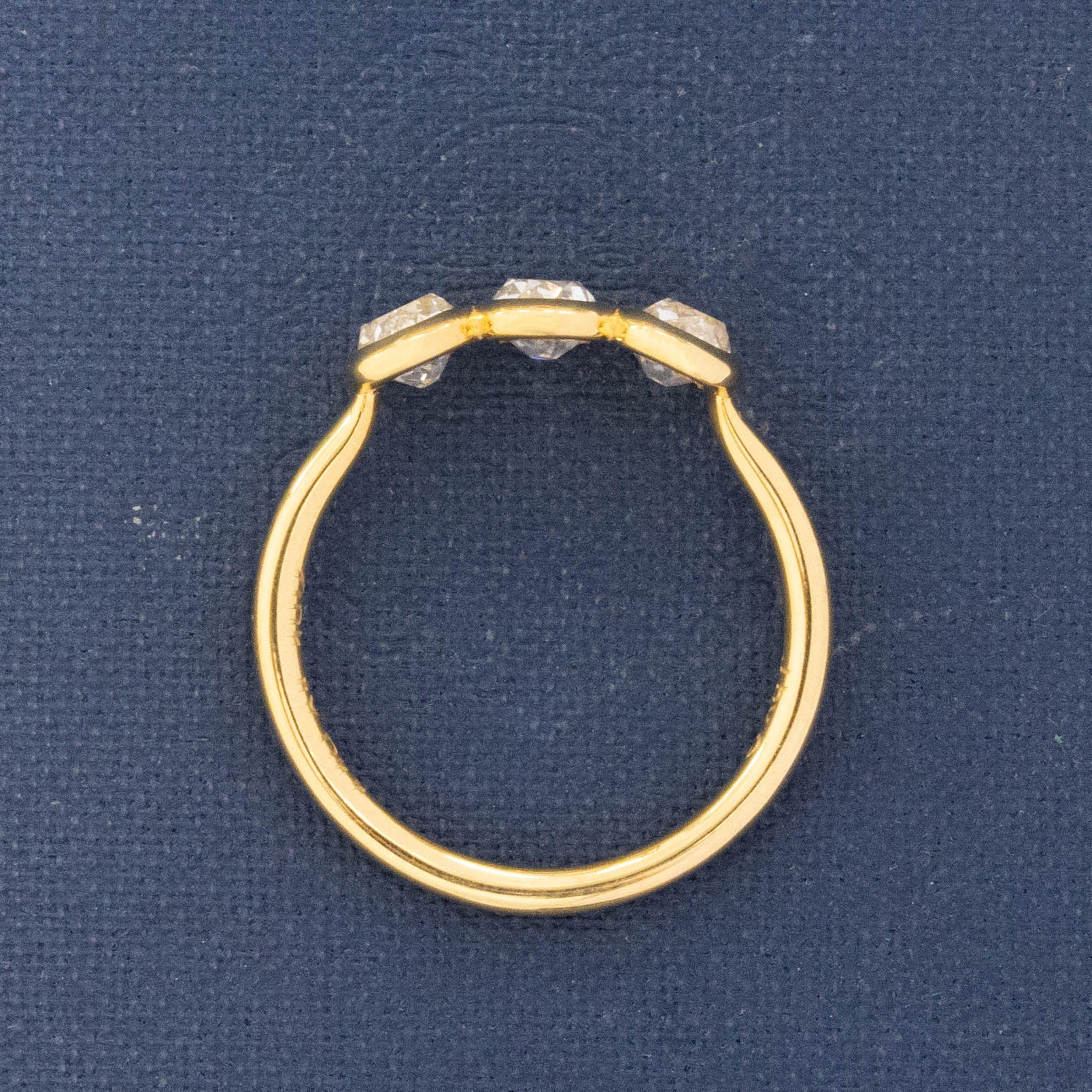 Trilogy rings are meant to represent the past, present, and future. These bezel-set trilogy rings with antique old mine cut diamonds are a perfect example of that! Chunky and rustic old mines sit in simple gold bezels, no two stones the same shape or make. They sparkle like little buttery fireballs and span beautifully across the top of one’s finger.