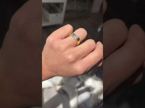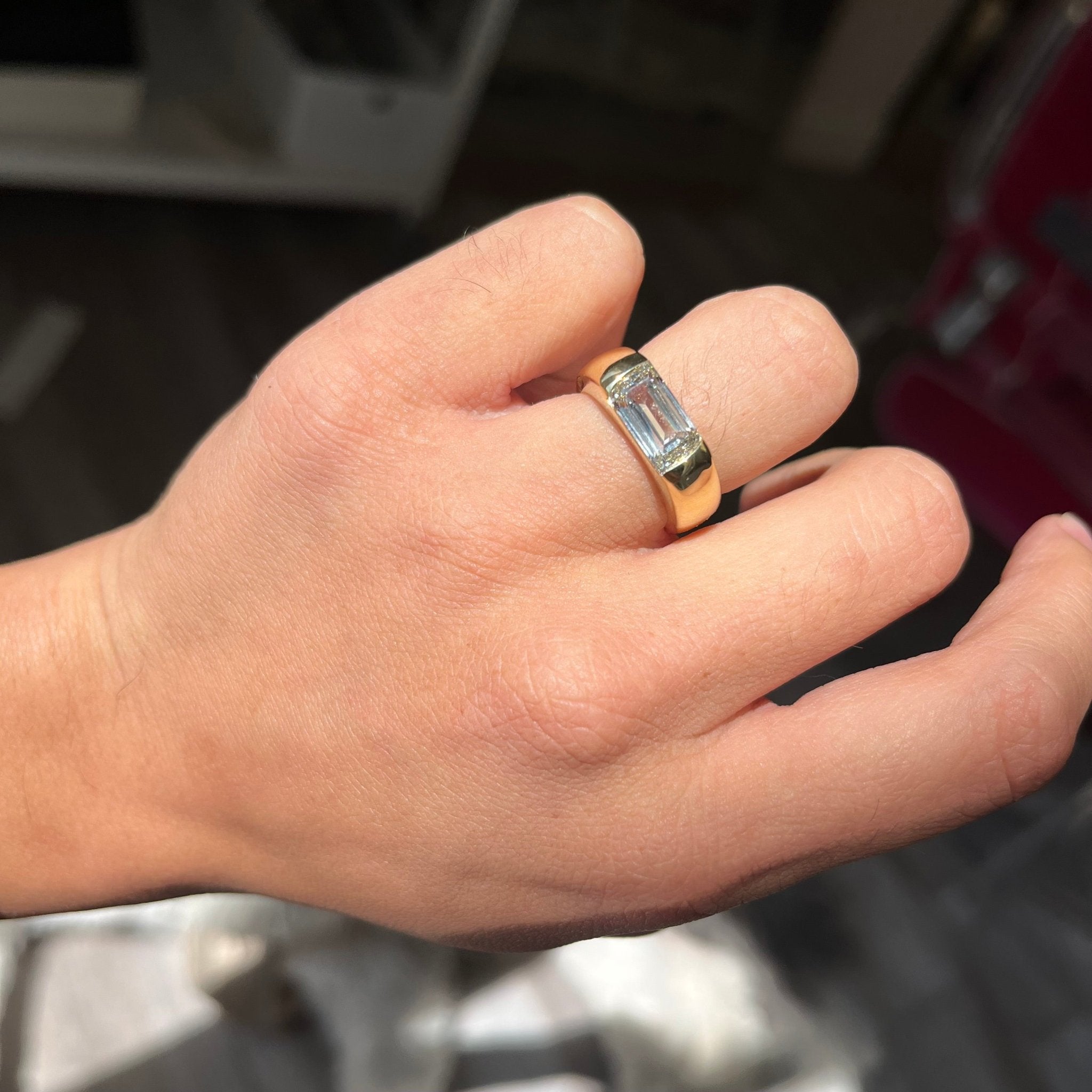 I've never seen a flame step cut diamond before, so when we came across this baby (including the GIA report that confirms it as such) we knew she had to come home with us! Two of the corners are rounded and the opposite two are pointed, giving it a really unique, fluid shape with step cut faceting. We've set her in a chunky gold band with a matched width, so the diamond sits flush in the most chic way.