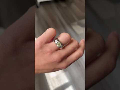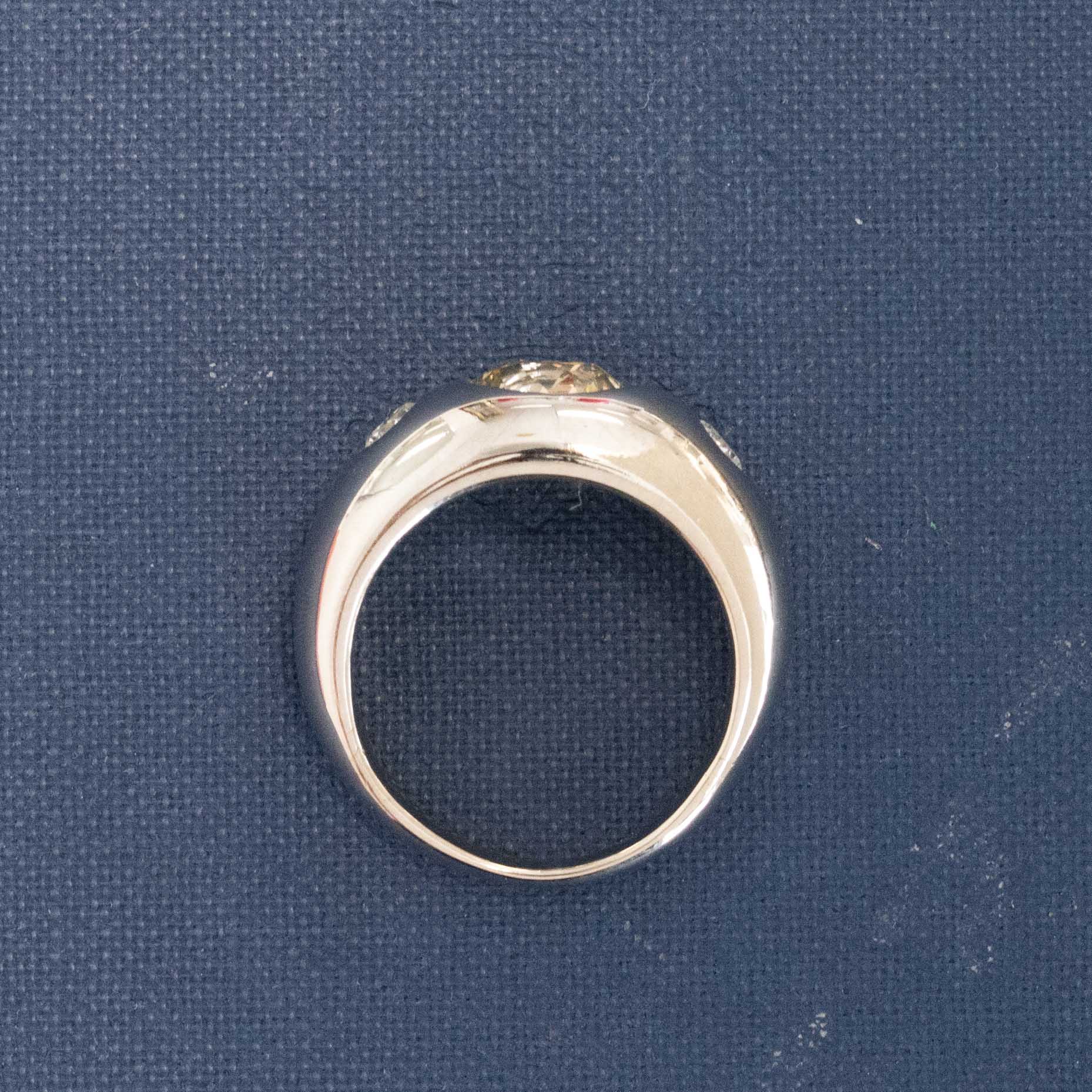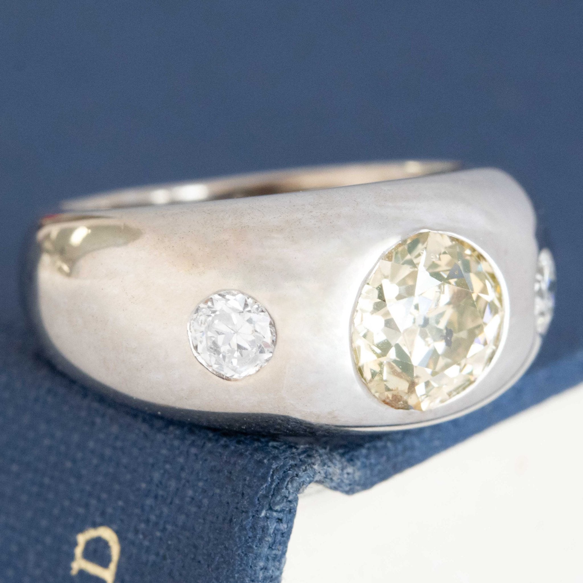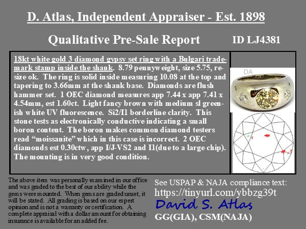 A classic vintage trilogy ring, but make it a Bvlgari! Showcasing a chunkster of an old European cut diamond in the center with the most interesting and charming hue, the ring slips on like buttah on the finger - as sleek as only the Italians can make it! What a unique and rare engagement ring this would make. Please see original paperwork when the ring was originally acquired from Italy.